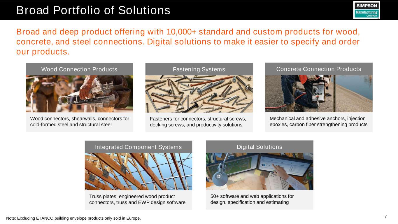 6 Our Strong Business Model Why Simpson? Our Customer-Centric Approach Broad portfolio of solutions Unparalleled availability & delivery Longstanding relationships Comprehensive service Innovation leader Impactful industry outreach • 26 of top 30 builders on a program • ~250 builders representing >50% of US housing starts • Millions of specifications • Thousands of dealers & retailers • ~98% product fill rate • 24-48 hour typical delivery • 48-hour turnaround on specials • Same-day shipping availability • ~700 field sales reps • Thousands of jobsite visits • Dedicated customer service and technical support • 26 training centers • 700+ training workshops per year • Partnering with organizations to support construction trades education • 15K standard & custom wood products • 3K standard & custom concrete products • 50+ software and web-app solutions • Pioneer of construction solutions • 8 accredited test labs • ~120 code evaluation reports • 500+ patents worldwide Our customer-centric approach and commitment to service differentiates us from other vendors and suppliers.