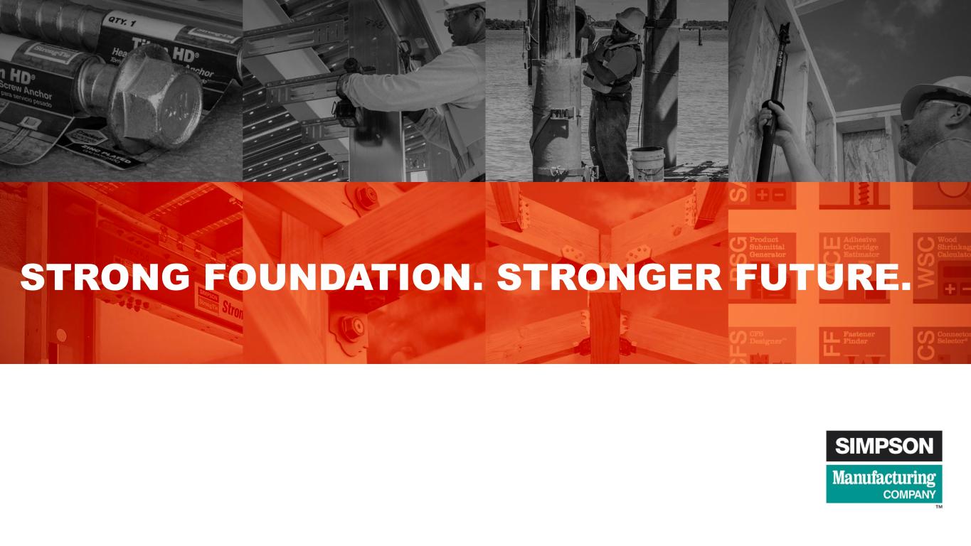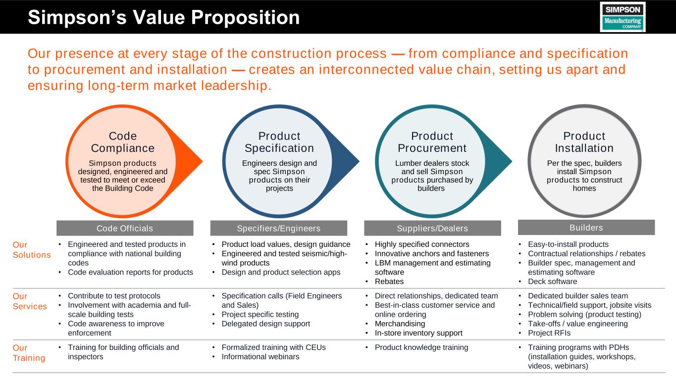 Simpson’s Value Proposition Product Installation Per the spec, builders install Simpson products to construct homes Product Procurement Lumber dealers stock and sell Simpson products purchased by builders Product Specification Engineers design and spec Simpson products on their projects Code Compliance Simpson products designed, engineered and tested to meet or exceed the Building Code Our Solutions • Engineered and tested products in compliance with national building codes • Code evaluation reports for products • Product load values, design guidance • Engineered and tested seismic/high- wind products • Design and product selection apps • Highly specified connectors • Innovative anchors and fasteners • LBM management and estimating software • Rebates • Easy-to-install products • Contractual relationships / rebates • Builder spec, management and estimating software • Deck software Our Services • Contribute to test protocols • Involvement with academia and full- scale building tests • Code awareness to improve enforcement • Specification calls (Field Engineers and Sales) • Project specific testing • Delegated design support • Direct relationships, dedicated team • Best-in-class customer service and online ordering • Merchandising • In-store inventory support • Dedicated builder sales team • Technical/field support, jobsite visits • Problem solving (product testing) • Take-offs / value engineering • Project RFIs Our Training • Training for building officials and inspectors • Formalized training with CEUs • Informational webinars • Product knowledge training • Training programs with PDHs (installation guides, workshops, videos, webinars) Our presence at every stage of the construction process — from compliance and specification to procurement and installation — creates an interconnected value chain, setting us apart and ensuring long-term market leadership. Code Officials Specifiers/Engineers Suppliers/Dealers Builders