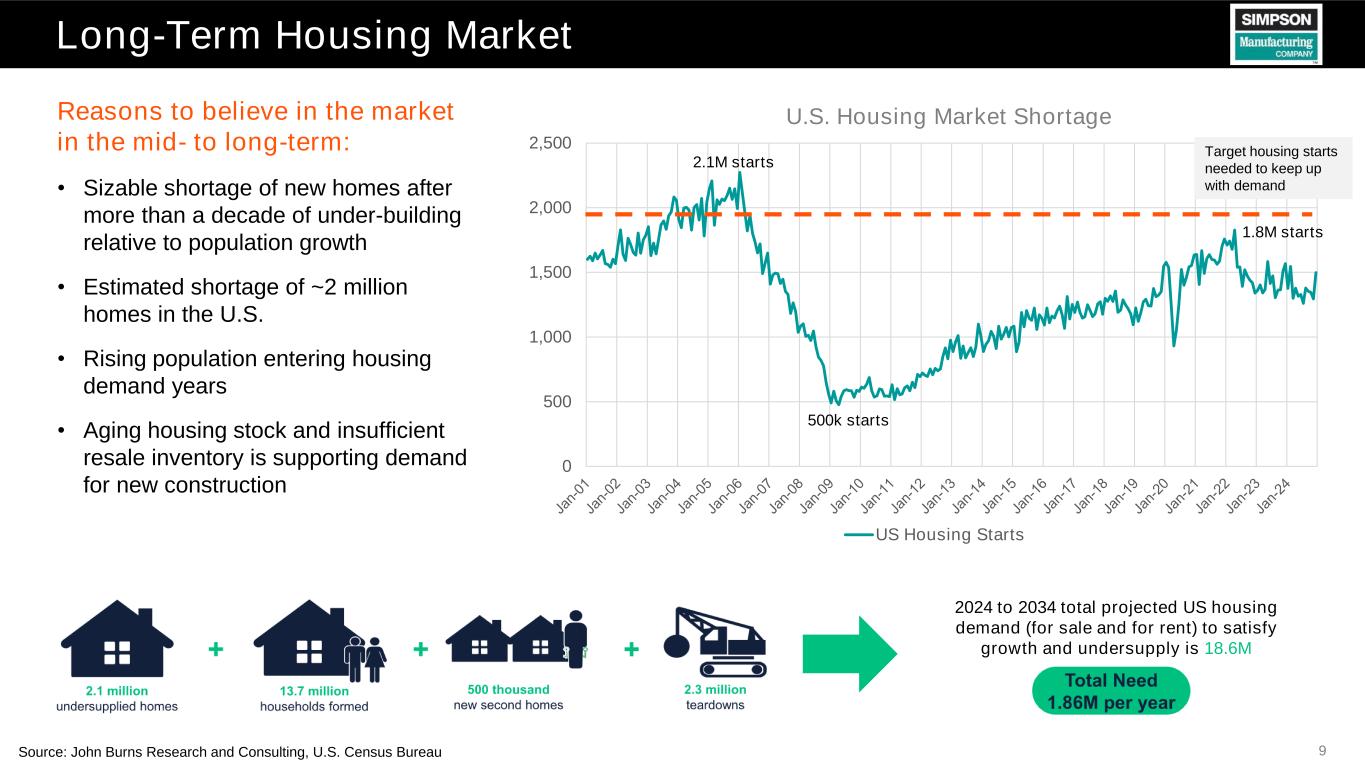 9 Long-Term Housing Market Reasons to believe in the market in the mid- to long-term: • Sizable shortage of new homes after more than a decade of under-building relative to population growth • Estimated shortage of ~2 million homes in the U.S. • Rising population entering housing demand years • Aging housing stock and insufficient resale inventory is supporting demand for new construction 0 500 1,000 1,500 2,000 2,500 US Housing Starts Target housing starts needed to keep up with demand 500k starts 1.8M starts U.S. Housing Market Shortage 2024 to 2034 total projected US housing demand (for sale and for rent) to satisfy growth and undersupply is 18.6M 2.1M starts Source: John Burns Research and Consulting, U.S. Census Bureau