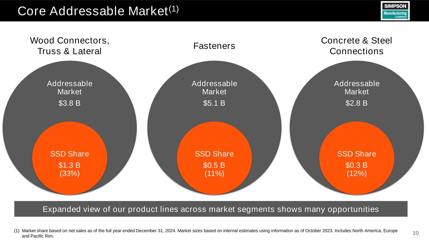 10 Core Addressable Market(1) Wood Connectors, Truss & Lateral Concrete & Steel Connections Addressable Market $3.8 B SSD Share $1.3 B (33%) Fasteners $1.7 B (17%) Expanded view of our product lines across market segments shows many opportunities Addressable Market $5.1 B SSD Share $0.5 B (11%) Addressable Market $2.8 B SSD Share $0.3 B (12%) (1) Market share based on net sales as of the full year ended December 31, 2024. Market sizes based on internal estimates using information as of October 2023. Includes North America, Europe and Pacific Rim.