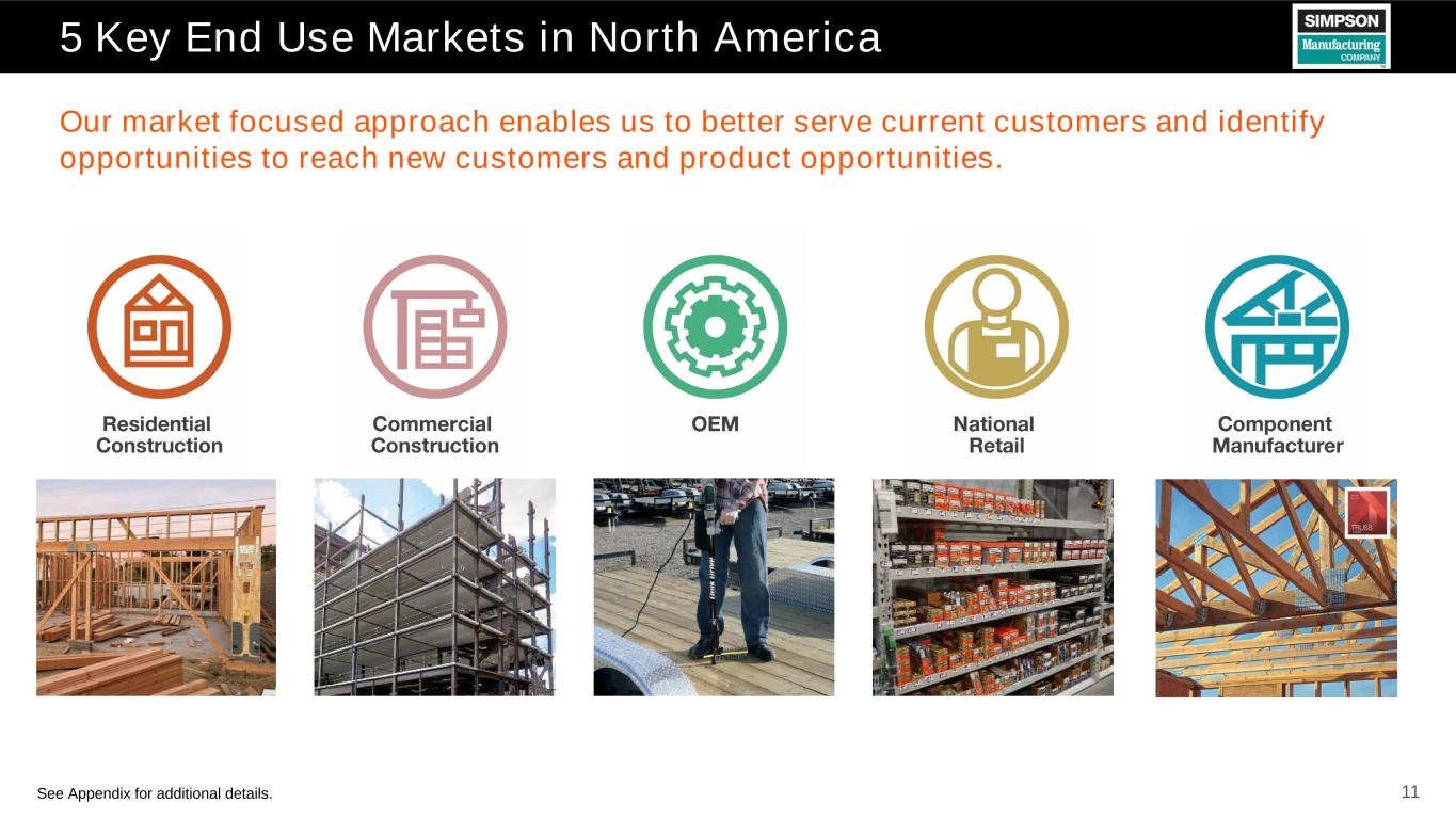 11 5 Key End Use Markets in North America Our market focused approach enables us to better serve current customers and identify opportunities to reach new customers and product opportunities. See Appendix for additional details.
