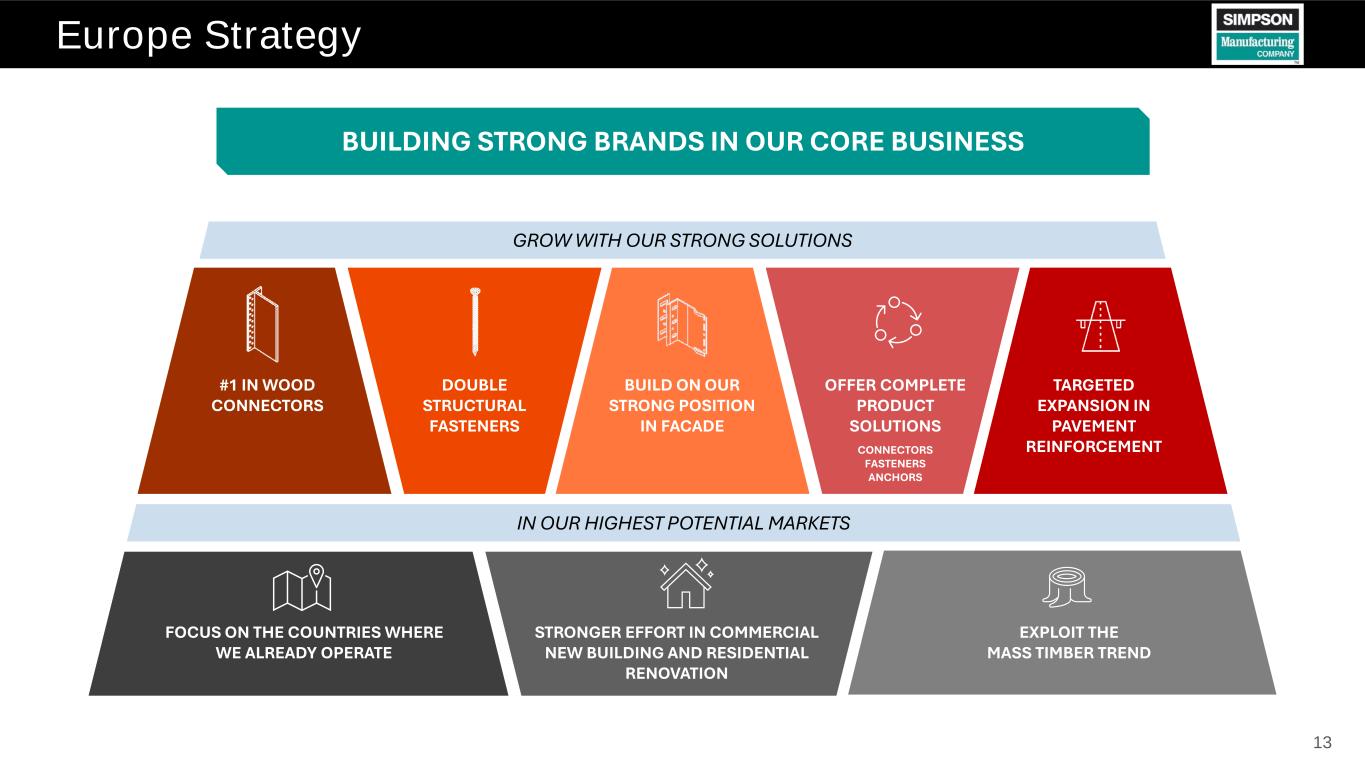 12 Driving Growth with Digital Solutions Key focus areas to make it easier to specify and order our products: Specification tools (apps/selectors) Design/visualization, estimating, online ordering Option management, estimating Project management and truss design Free design software and plans Digital Solutions Building out our digital offerings to serve customers across the building industry Make it easier to do business with Simpson through best-in-class online portal and digital experience Use technology to streamline and strengthen partnerships with key customer groups Provide software solutions that drive the specification and use of our products 1 2 3