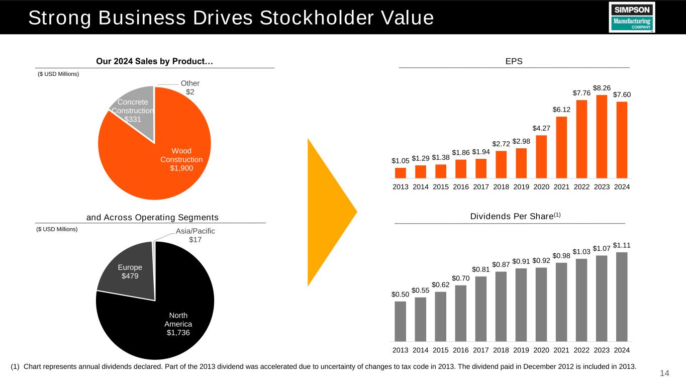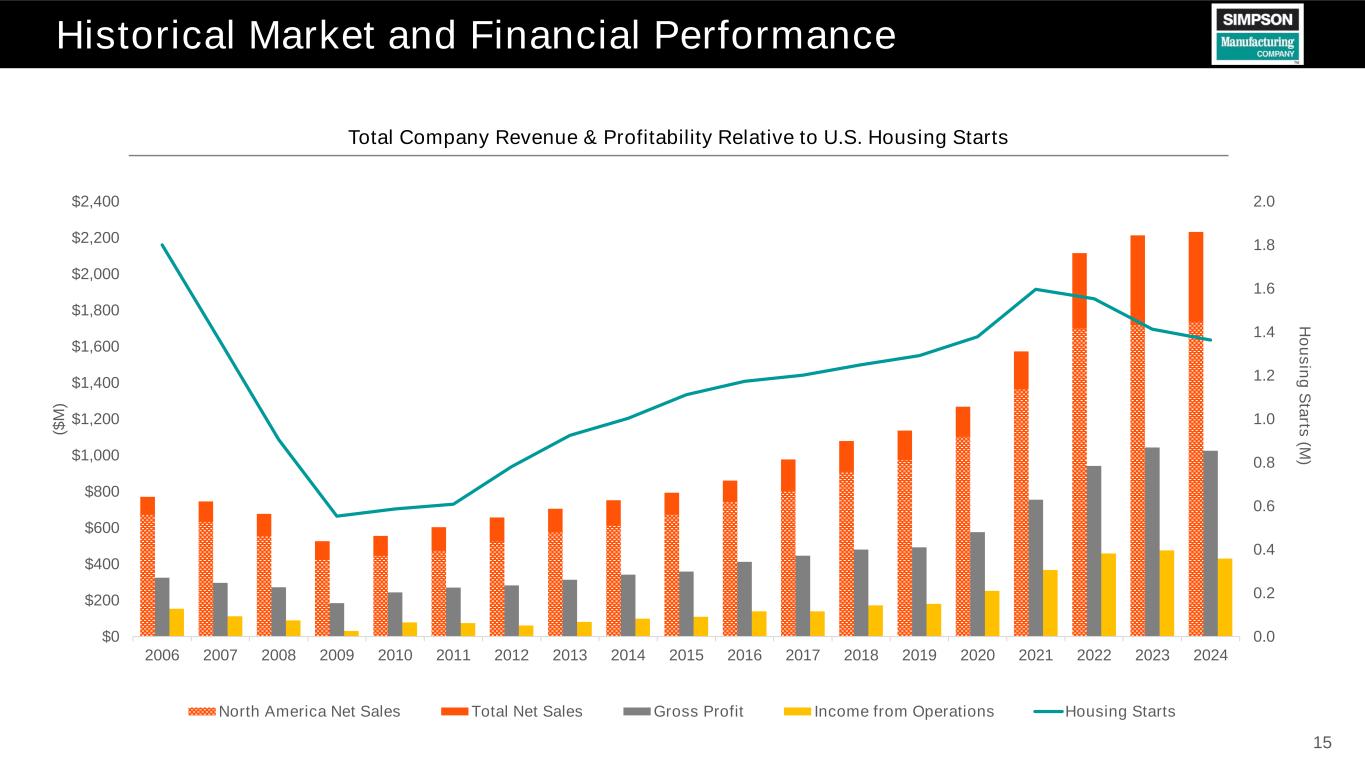 14 North America $1,736 Europe $479 Asia/Pacific $17 Strong Business Drives Stockholder Value Our 2024 Sales by Product… ($ USD Millions) and Across Operating Segments ($ USD Millions) EPS Dividends Per Share(1) (1) Chart represents annual dividends declared. Part of the 2013 dividend was accelerated due to uncertainty of changes to tax code in 2013. The dividend paid in December 2012 is included in 2013. Wood Construction $1,900 Concrete Construction $331 Other $2 $1.05 $1.29 $1.38 $1.86 $1.94 $2.72 $2.98 $4.27 $6.12 $7.76 $8.26 $7.60 2013 2014 2015 2016 2017 2018 2019 2020 2021 2022 2023 2024 $0.50 $0.55 $0.62 $0.70 $0.81 $0.87 $0.91 $0.92 $0.98 $1.03 $1.07 $1.11 2013 2014 2015 2016 2017 2018 2019 2020 2021 2022 2023 2024