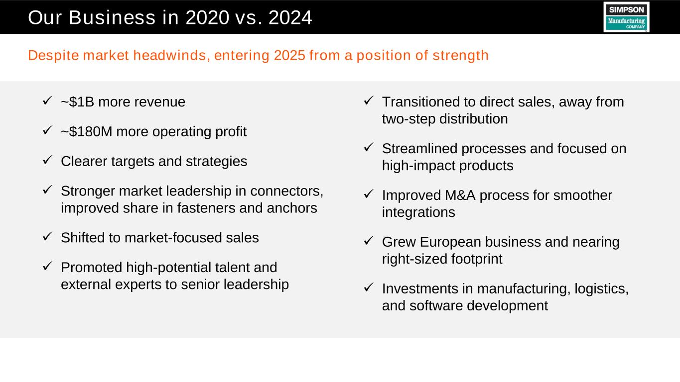 Our Business in 2020 vs. 2024 ✓ ~$1B more revenue ✓ ~$180M more operating profit ✓ Clearer targets and strategies ✓ Stronger market leadership in connectors, improved share in fasteners and anchors ✓ Shifted to market-focused sales ✓ Promoted high-potential talent and external experts to senior leadership Despite market headwinds, entering 2025 from a position of strength ✓ Transitioned to direct sales, away from two-step distribution ✓ Streamlined processes and focused on high-impact products ✓ Improved M&A process for smoother integrations ✓ Grew European business and nearing right-sized footprint ✓ Investments in manufacturing, logistics, and software development