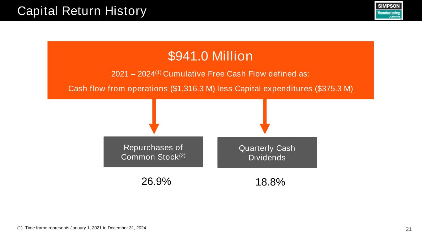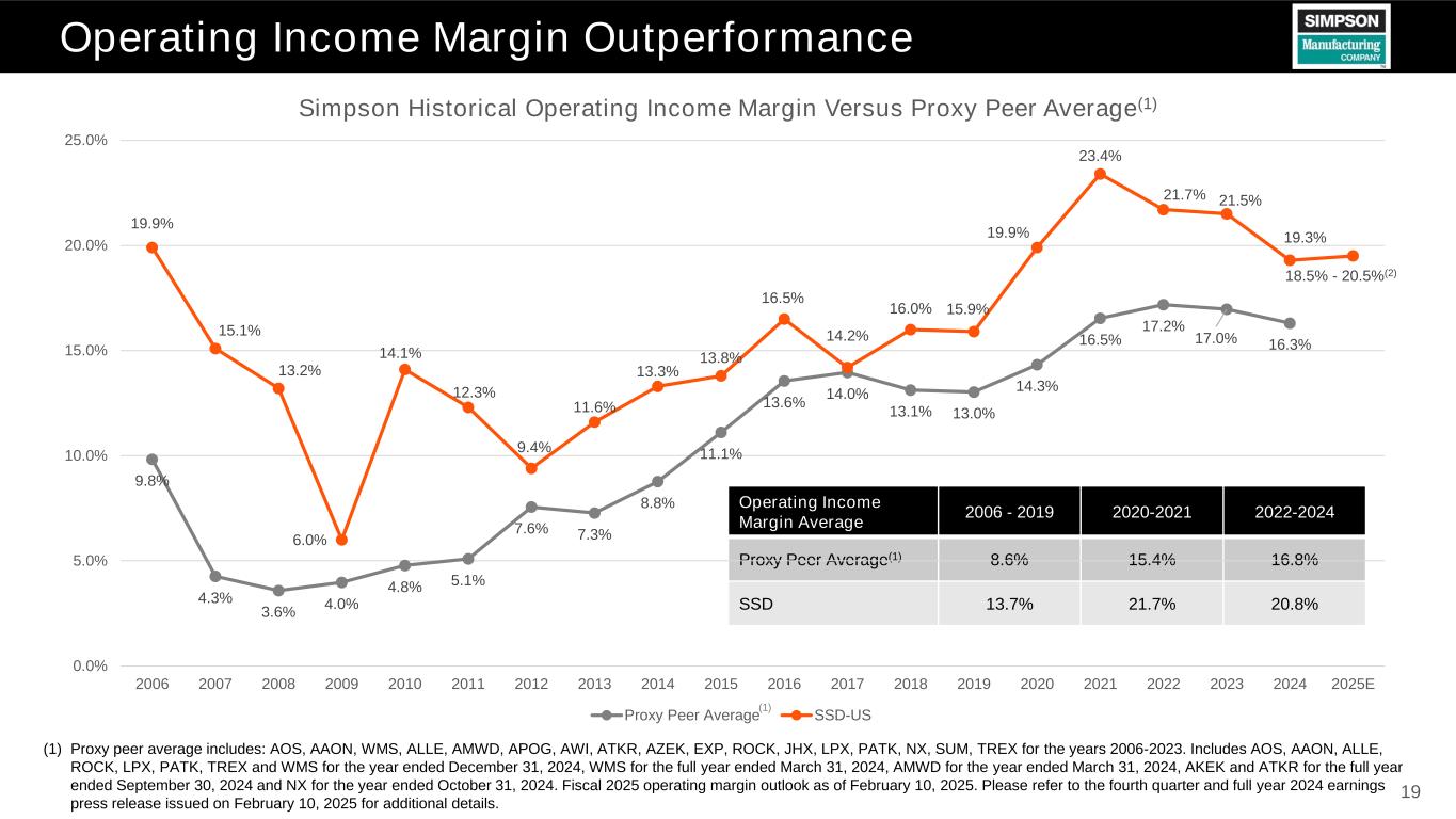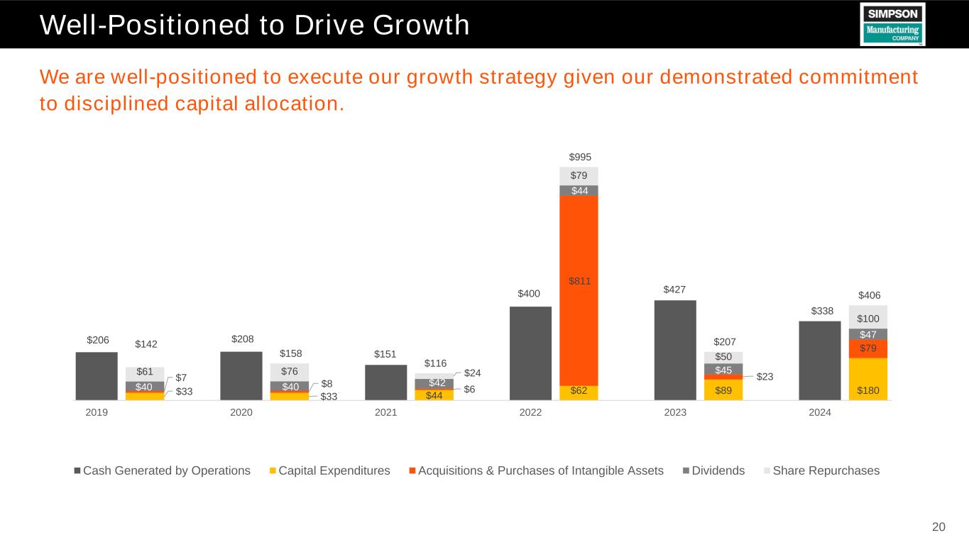 19 (1) (1) Proxy peer average includes: AOS, AAON, WMS, ALLE, AMWD, APOG, AWI, ATKR, AZEK, EXP, ROCK, JHX, LPX, PATK, NX, SUM, TREX for the years 2006-2023. Includes AOS, AAON, ALLE, ROCK, LPX, PATK, TREX and WMS for the year ended December 31, 2024, WMS for the full year ended March 31, 2024, AMWD for the year ended March 31, 2024, AKEK and ATKR for the full year ended September 30, 2024 and NX for the year ended October 31, 2024. Fiscal 2025 operating margin outlook as of February 10, 2025. Please refer to the fourth quarter and full year 2024 earnings press release issued on February 10, 2025 for additional details. Operating Income Margin Outperformance Operating Income Margin Average 2006 - 2019 2020-2021 2022-2024 Proxy Peer Average(1) 8.6% 15.4% 16.8% SSD 13.7% 21.7% 20.8% 9.8% 4.3% 3.6% 4.0% 4.8% 5.1% 7.6% 7.3% 8.8% 11.1% 13.6% 14.0% 13.1% 13.0% 14.3% 16.5% 17.2% 17.0% 16.3% 19.9% 15.1% 13.2% 6.0% 14.1% 12.3% 9.4% 11.6% 13.3% 13.8% 16.5% 14.2% 16.0% 15.9% 19.9% 23.4% 21.7% 21.5% 19.3% 18.5% - 20.5%(2) 0.0% 5.0% 10.0% 15.0% 20.0% 25.0% 2006 2007 2008 2009 2010 2011 2012 2013 2014 2015 2016 2017 2018 2019 2020 2021 2022 2023 2024 2025E Simpson Historical Operating Income Margin Versus Proxy Peer Average(1) Proxy Peer Average SSD-US