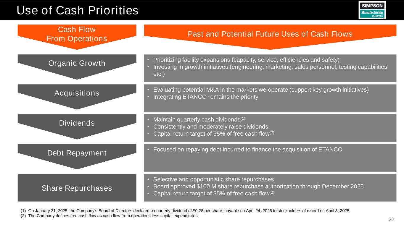 21 Quarterly Cash Dividends Capital Return History $941.0 Million 2021 – 2024(1) Cumulative Free Cash Flow defined as: Cash flow from operations ($1,316.3 M) less Capital expenditures ($375.3 M) 26.9% 18.8% Repurchases of Common Stock(2) (1) Time frame represents January 1, 2021 to December 31, 2024.