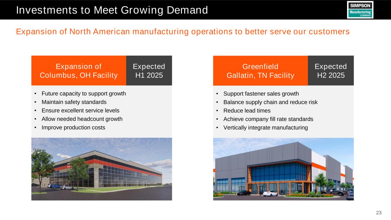 22 Use of Cash Priorities Cash Flow From Operations Share Repurchases • Evaluating potential M&A in the markets we operate (support key growth initiatives) • Integrating ETANCO remains the priority • Maintain quarterly cash dividends(1) • Consistently and moderately raise dividends • Capital return target of 35% of free cash flow(2) • Selective and opportunistic share repurchases • Board approved $100 M share repurchase authorization through December 2025 • Capital return target of 35% of free cash flow(2) Organic Growth Dividends (1) On January 31, 2025, the Company's Board of Directors declared a quarterly dividend of $0.28 per share, payable on April 24, 2025 to stockholders of record on April 3, 2025. (2) The Company defines free cash flow as cash flow from operations less capital expenditures. • Focused on repaying debt incurred to finance the acquisition of ETANCO Debt Repayment Acquisitions • Prioritizing facility expansions (capacity, service, efficiencies and safety) • Investing in growth initiatives (engineering, marketing, sales personnel, testing capabilities, etc.) Past and Potential Future Uses of Cash Flows
