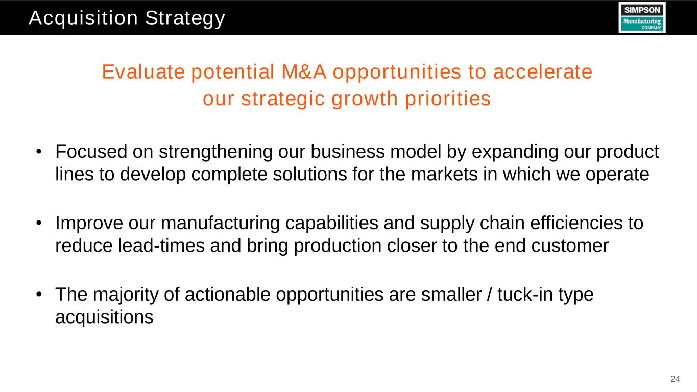 23 Investments to Meet Growing Demand Expansion of Columbus, OH Facility Greenfield Gallatin, TN Facility • Support fastener sales growth • Balance supply chain and reduce risk • Reduce lead times • Achieve company fill rate standards • Vertically integrate manufacturing • Future capacity to support growth • Maintain safety standards • Ensure excellent service levels • Allow needed headcount growth • Improve production costs Expansion of North American manufacturing operations to better serve our customers Expected H1 2025 Expected H2 2025
