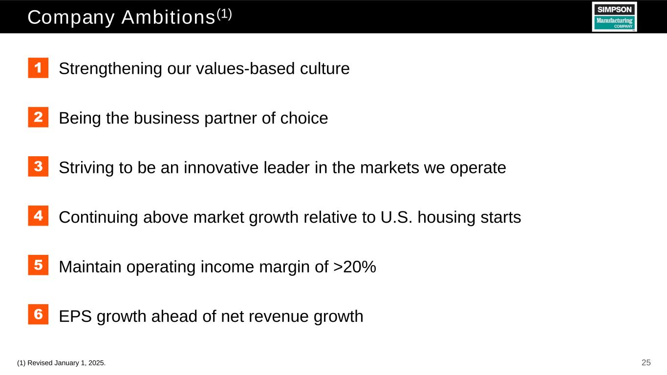25 Company Ambitions(1) Strengthening our values-based culture Being the business partner of choice Striving to be an innovative leader in the markets we operate Continuing above market growth relative to U.S. housing starts Maintain operating income margin of >20% EPS growth ahead of net revenue growth 1 2 4 3 5 6 (1) Revised January 1, 2025.