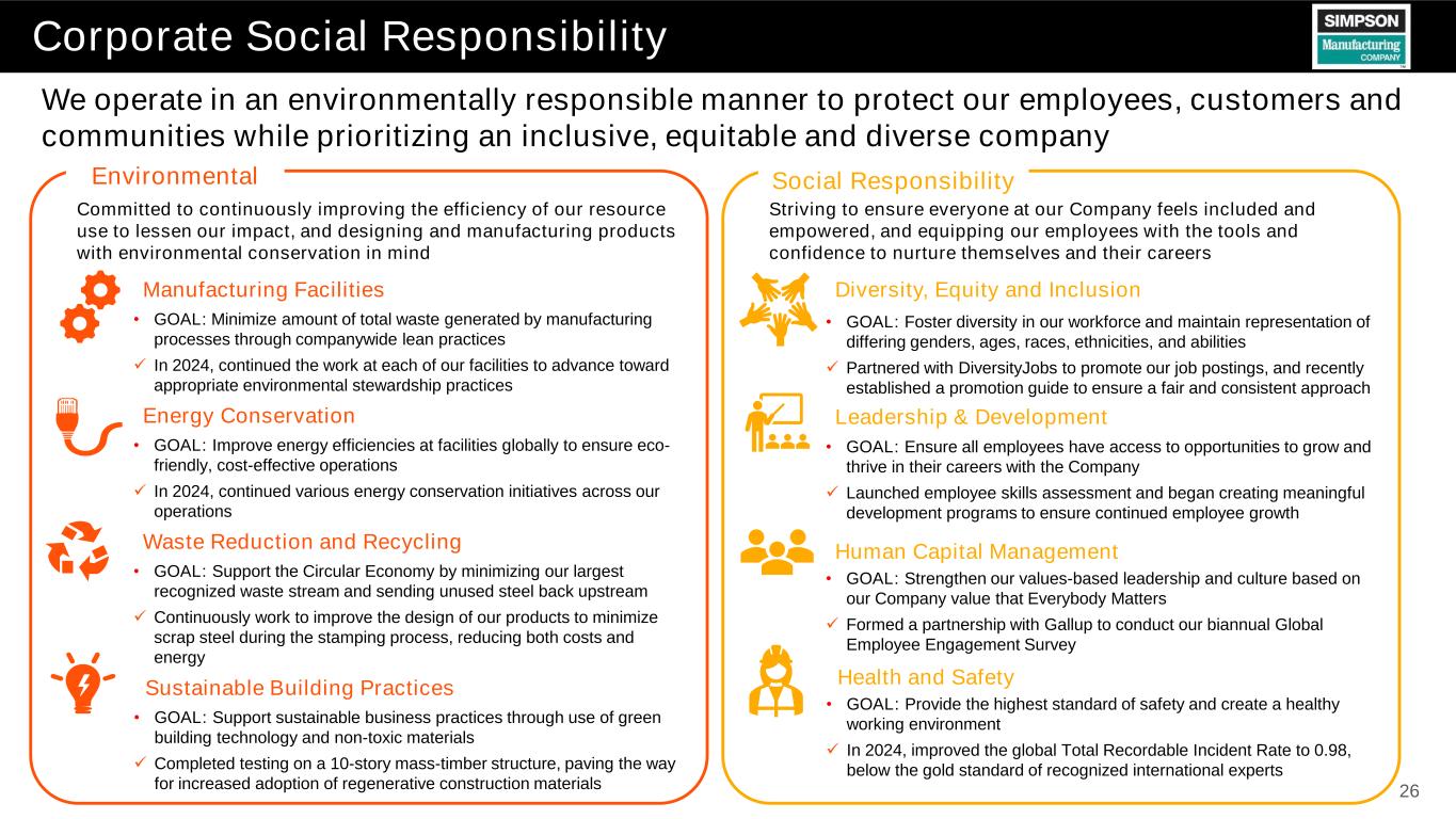 Social Responsibility Diversity, Equity and Inclusion Leadership & Development Human Capital Management Health and Safety Striving to ensure everyone at our Company feels included and empowered, and equipping our employees with the tools and confidence to nurture themselves and their careers • GOAL: Foster diversity in our workforce and maintain representation of differing genders, ages, races, ethnicities, and abilities ✓ Partnered with DiversityJobs to promote our job postings, and recently established a promotion guide to ensure a fair and consistent approach • GOAL: Ensure all employees have access to opportunities to grow and thrive in their careers with the Company ✓ Launched employee skills assessment and began creating meaningful development programs to ensure continued employee growth • GOAL: Strengthen our values-based leadership and culture based on our Company value that Everybody Matters ✓ Formed a partnership with Gallup to conduct our biannual Global Employee Engagement Survey • GOAL: Provide the highest standard of safety and create a healthy working environment ✓ In 2024, improved the global Total Recordable Incident Rate to 0.98, below the gold standard of recognized international experts 26 We operate in an environmentally responsible manner to protect our employees, customers and communities while prioritizing an inclusive, equitable and diverse company Corporate Social Responsibility Environmental Manufacturing Facilities Energy Conservation Waste Reduction and Recycling Sustainable Building Practices Committed to continuously improving the efficiency of our resource use to lessen our impact, and designing and manufacturing products with environmental conservation in mind • GOAL: Minimize amount of total waste generated by manufacturing processes through companywide lean practices ✓ In 2024, continued the work at each of our facilities to advance toward appropriate environmental stewardship practices • GOAL: Improve energy efficiencies at facilities globally to ensure eco- friendly, cost-effective operations ✓ In 2024, continued various energy conservation initiatives across our operations • GOAL: Support the Circular Economy by minimizing our largest recognized waste stream and sending unused steel back upstream ✓ Continuously work to improve the design of our products to minimize scrap steel during the stamping process, reducing both costs and energy • GOAL: Support sustainable business practices through use of green building technology and non-toxic materials ✓ Completed testing on a 10-story mass-timber structure, paving the way for increased adoption of regenerative construction materials