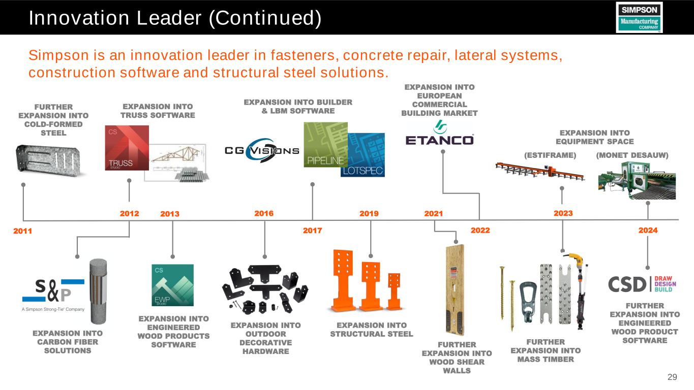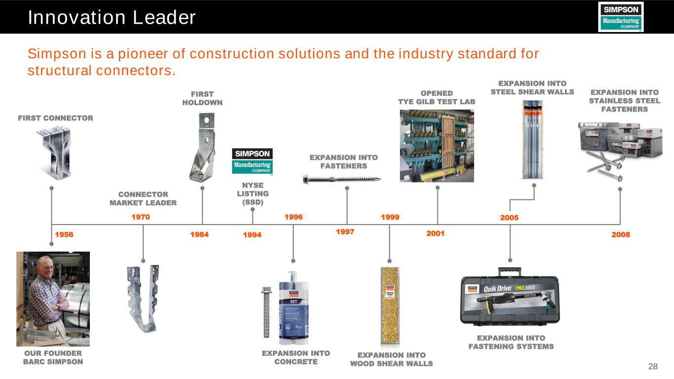 28 Innovation Leader 1956 1970 1984 1996 1997 1999 2005 Simpson is a pioneer of construction solutions and the industry standard for structural connectors. 1994 NYSE LISTING (SSD) OUR FOUNDER BARC SIMPSON EXPANSION INTO CONCRETE EXPANSION INTO FASTENERS FIRST CONNECTOR CONNECTOR MARKET LEADER EXPANSION INTO WOOD SHEAR WALLS EXPANSION INTO FASTENING SYSTEMS 2001 OPENED TYE GILB TEST LAB EXPANSION INTO STEEL SHEAR WALLSFIRST HOLDOWN 2008 EXPANSION INTO STAINLESS STEEL FASTENERS