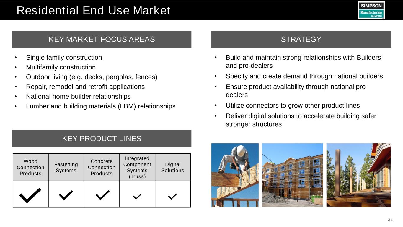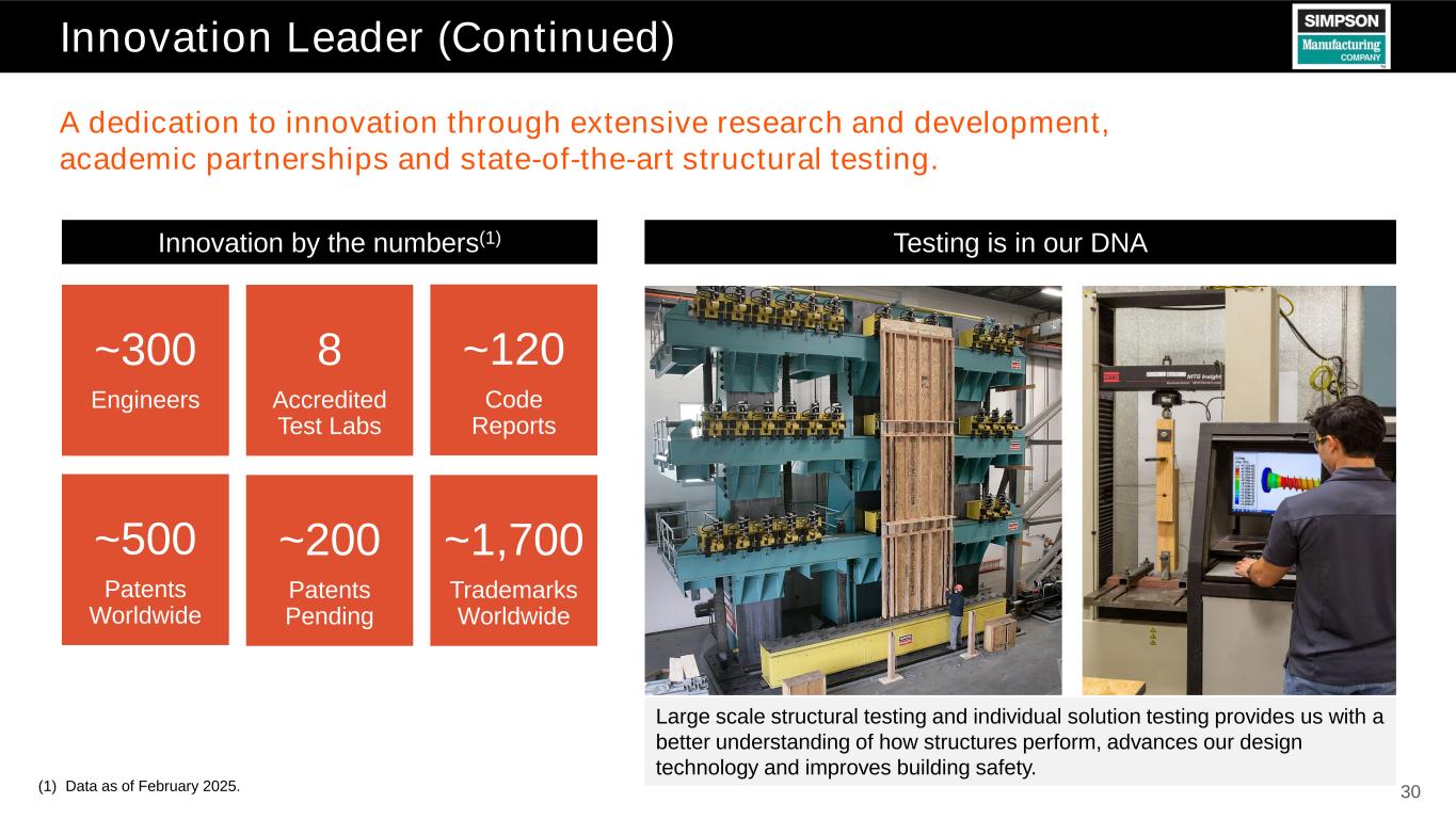 30 Innovation Leader (Continued) ~300 Engineers ~1,700 Trademarks Worldwide 8 Accredited Test Labs ~500 Patents Worldwide ~200 Patents Pending ~120 Code Reports A dedication to innovation through extensive research and development, academic partnerships and state-of-the-art structural testing. Testing is in our DNAInnovation by the numbers(1) Large scale structural testing and individual solution testing provides us with a better understanding of how structures perform, advances our design technology and improves building safety. (1) Data as of February 2025.