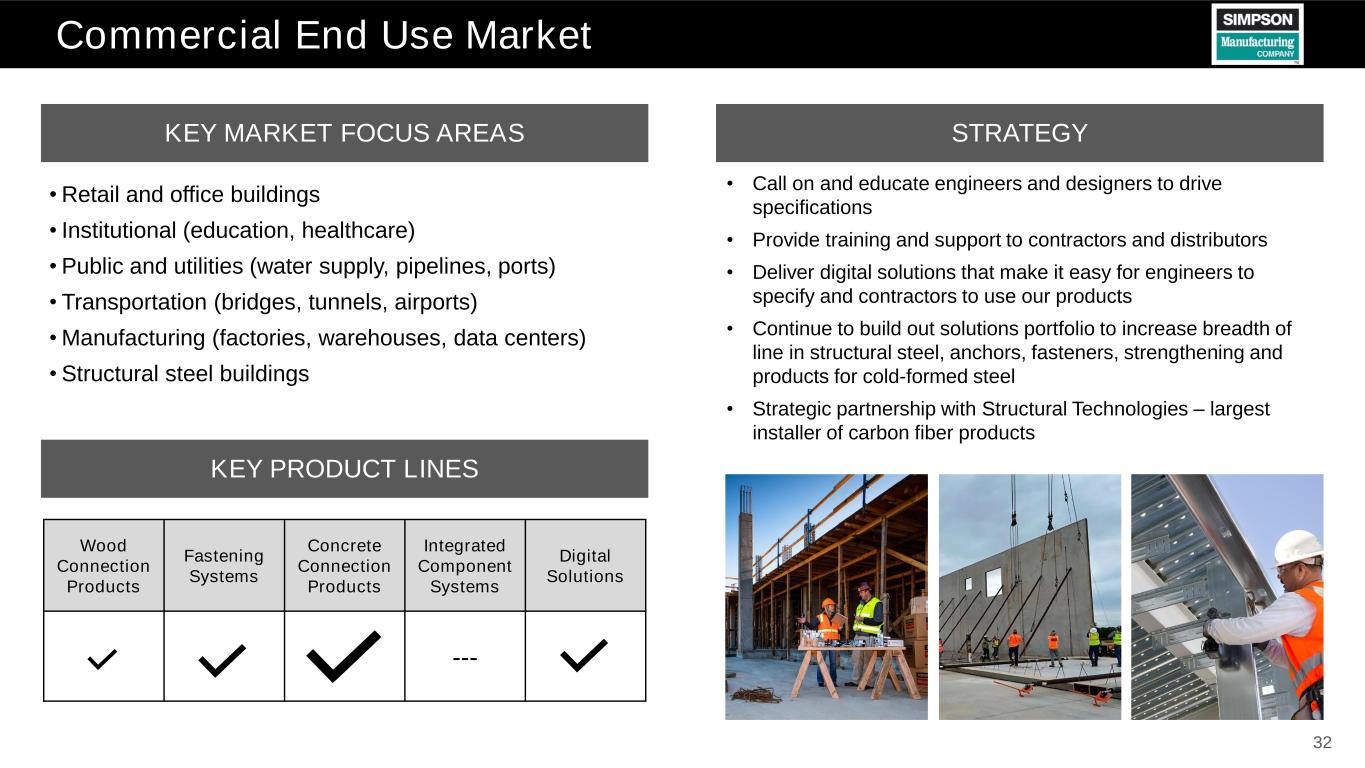 31 Residential End Use Market KEY PRODUCT LINES KEY MARKET FOCUS AREAS STRATEGY • Single family construction • Multifamily construction • Outdoor living (e.g. decks, pergolas, fences) • Repair, remodel and retrofit applications • National home builder relationships • Lumber and building materials (LBM) relationships • Build and maintain strong relationships with Builders and pro-dealers • Specify and create demand through national builders • Ensure product availability through national pro- dealers • Utilize connectors to grow other product lines • Deliver digital solutions to accelerate building safer stronger structures Wood Connection Products Fastening Systems Concrete Connection Products Integrated Component Systems (Truss) Digital Solutions