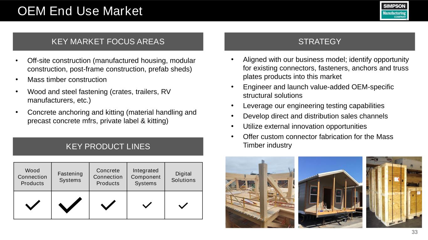 32 Commercial End Use Market KEY MARKET FOCUS AREAS STRATEGY •Retail and office buildings • Institutional (education, healthcare) • Public and utilities (water supply, pipelines, ports) • Transportation (bridges, tunnels, airports) •Manufacturing (factories, warehouses, data centers) • Structural steel buildings • Call on and educate engineers and designers to drive specifications • Provide training and support to contractors and distributors • Deliver digital solutions that make it easy for engineers to specify and contractors to use our products • Continue to build out solutions portfolio to increase breadth of line in structural steel, anchors, fasteners, strengthening and products for cold-formed steel • Strategic partnership with Structural Technologies – largest installer of carbon fiber products KEY PRODUCT LINES Wood Connection Products Fastening Systems Concrete Connection Products Integrated Component Systems Digital Solutions ---