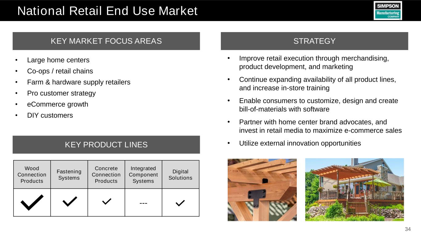33 OEM End Use Market KEY MARKET FOCUS AREAS STRATEGY • Aligned with our business model; identify opportunity for existing connectors, fasteners, anchors and truss plates products into this market • Engineer and launch value-added OEM-specific structural solutions • Leverage our engineering testing capabilities • Develop direct and distribution sales channels • Utilize external innovation opportunities • Offer custom connector fabrication for the Mass Timber industry • Off-site construction (manufactured housing, modular construction, post-frame construction, prefab sheds) • Mass timber construction • Wood and steel fastening (crates, trailers, RV manufacturers, etc.) • Concrete anchoring and kitting (material handling and precast concrete mfrs, private label & kitting) KEY PRODUCT LINES Wood Connection Products Fastening Systems Concrete Connection Products Integrated Component Systems Digital Solutions