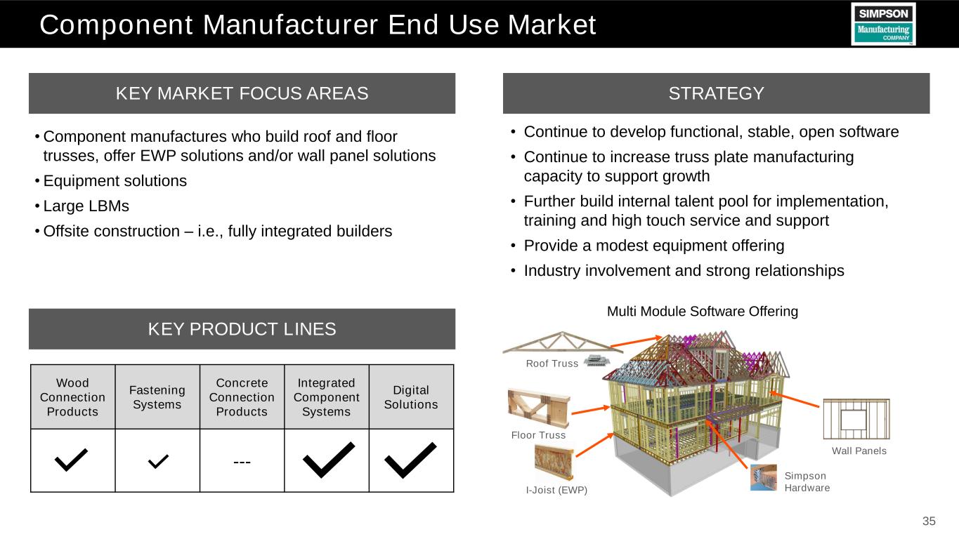 34 National Retail End Use Market KEY MARKET FOCUS AREAS STRATEGY • Improve retail execution through merchandising, product development, and marketing • Continue expanding availability of all product lines, and increase in-store training • Enable consumers to customize, design and create bill-of-materials with software • Partner with home center brand advocates, and invest in retail media to maximize e-commerce sales • Utilize external innovation opportunities • Large home centers • Co-ops / retail chains • Farm & hardware supply retailers • Pro customer strategy • eCommerce growth • DIY customers KEY PRODUCT LINES Wood Connection Products Fastening Systems Concrete Connection Products Integrated Component Systems Digital Solutions ---