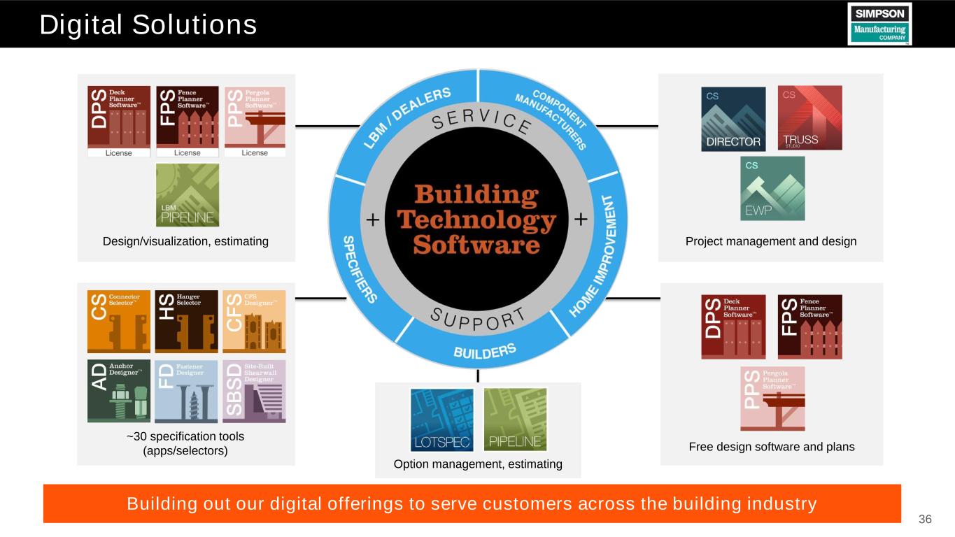 35 Component Manufacturer End Use Market KEY MARKET FOCUS AREAS STRATEGY •Component manufactures who build roof and floor trusses, offer EWP solutions and/or wall panel solutions • Equipment solutions • Large LBMs •Offsite construction – i.e., fully integrated builders Wall Panels 35 Roof Truss Floor Truss I-Joist (EWP) Simpson Hardware Multi Module Software Offering • Continue to develop functional, stable, open software • Continue to increase truss plate manufacturing capacity to support growth • Further build internal talent pool for implementation, training and high touch service and support • Provide a modest equipment offering • Industry involvement and strong relationships KEY PRODUCT LINES Wood Connection Products Fastening Systems Concrete Connection Products Integrated Component Systems Digital Solutions ---