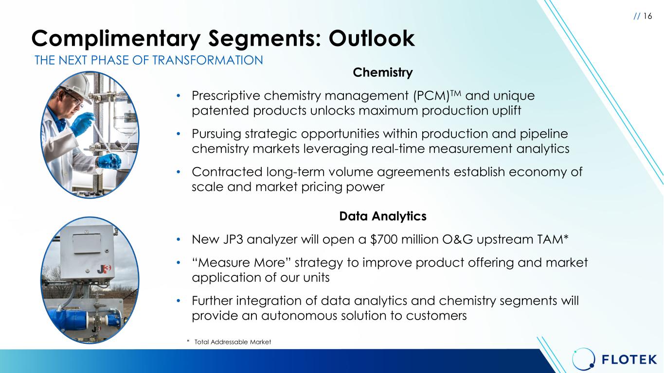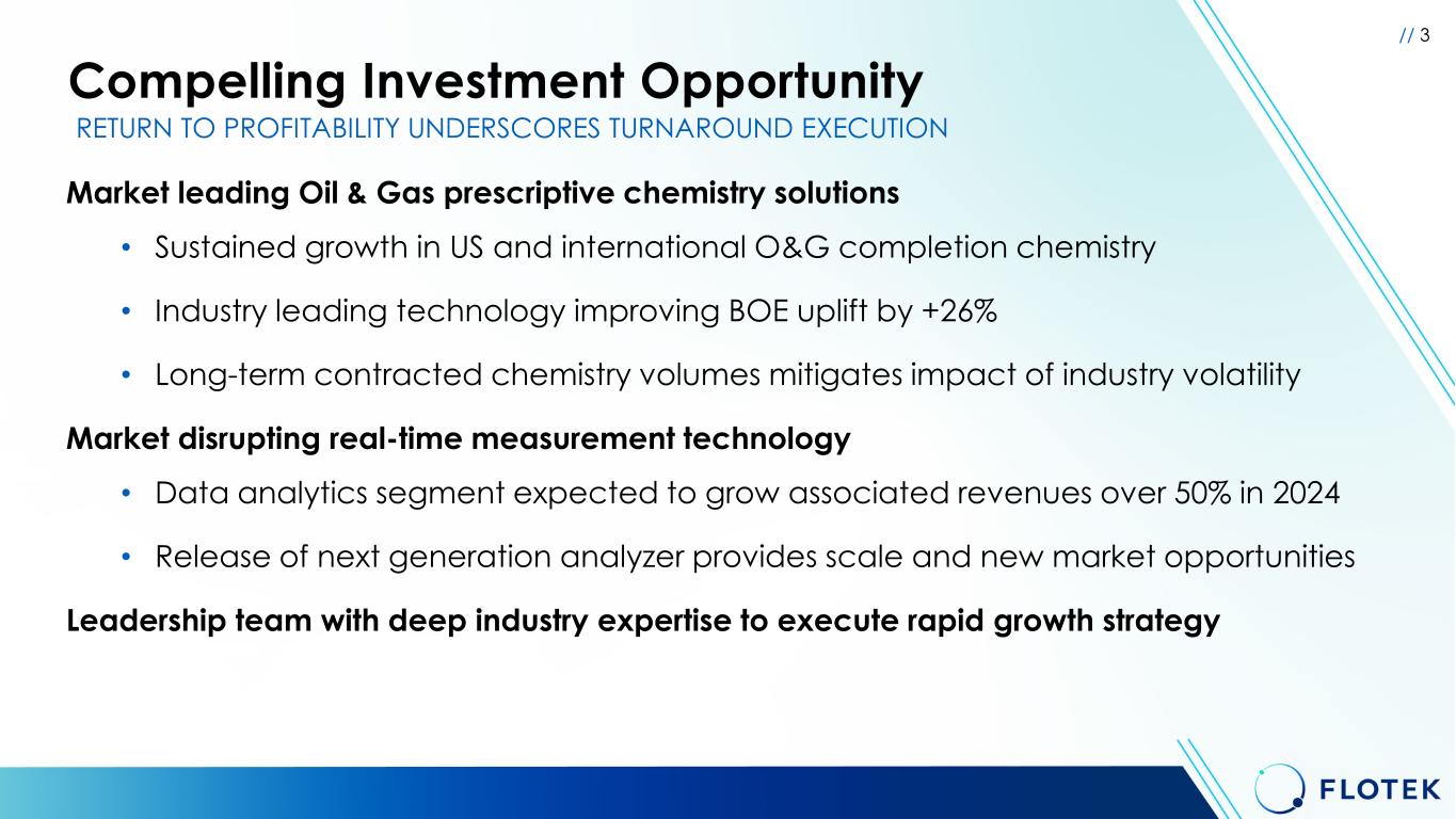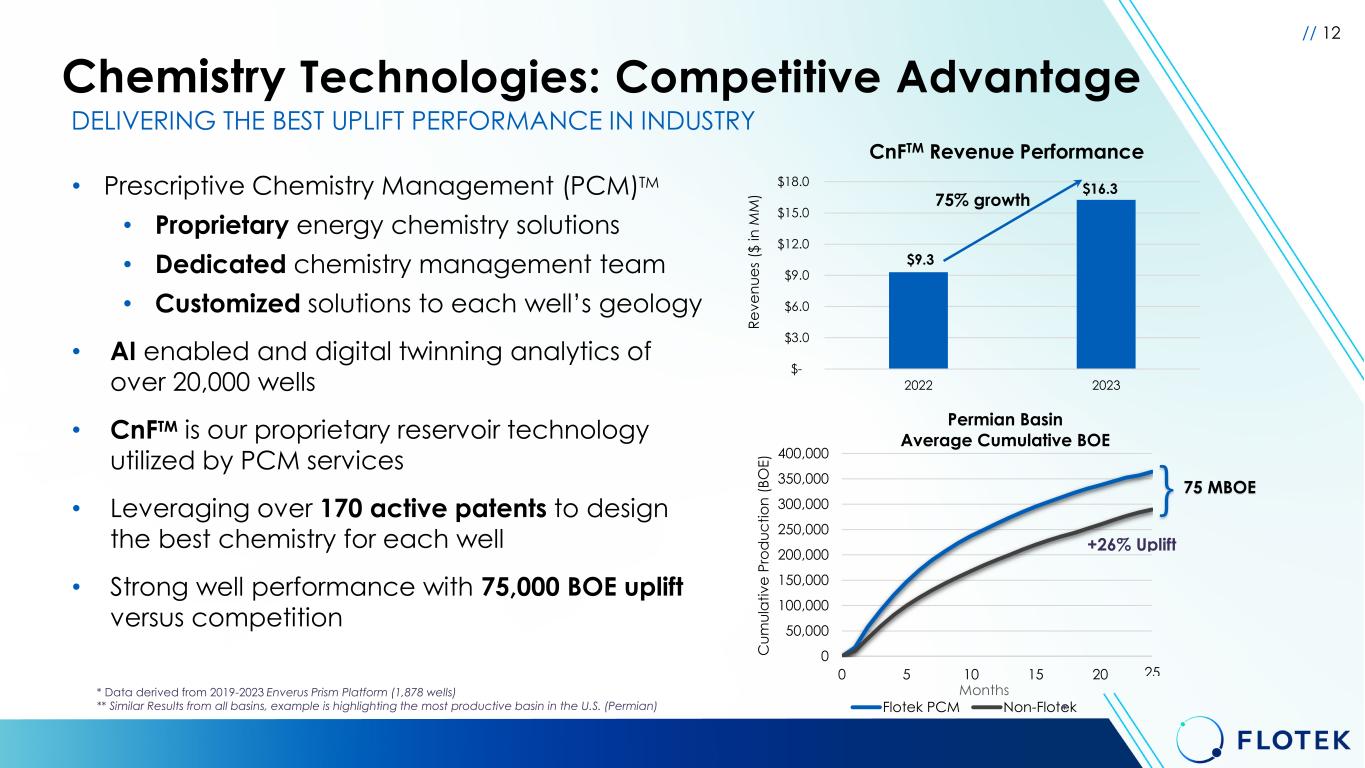The Company’s plans for 2024 include maintaining JP3’s strong presence in the midstream market, as well as pursuing new opportunities to accelerate penetration into the upstream market. Flotek is currently working with landowner groups to improve production allocations on lease sites and custody transfer locations through JP3’s accurate, real-time measurements. This application represents a significant market opportunity in replacing traditional allocation measurement technologies. In addition, the Company is participating in a flare monitoring pilot program with a large upstream operator to demonstrate the use of JP3’s technical solution in connection with compliance with recently enacted EPA regulations. With over 55,000 existing flares in the United States expected to be subject to monitoring regulations by 2028, this application could present a material multi-year opportunity for JP3 to expand its footprint into the upstream space.