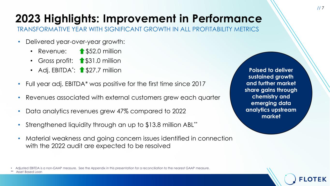 HOUSTON, March 12, 2024 - Flotek Industries, Inc. (“Flotek” or the “Company”) (NYSE: FTK) today announced operational and financial results for the fourth quarter and full-year ended December 31, 2023, highlighted by significant improvement in all profitability metrics, including net income, gross profit and adjusted gross profit(1). For the first time since 2017, the Company generated full-year positive adjusted EBITDA(1).