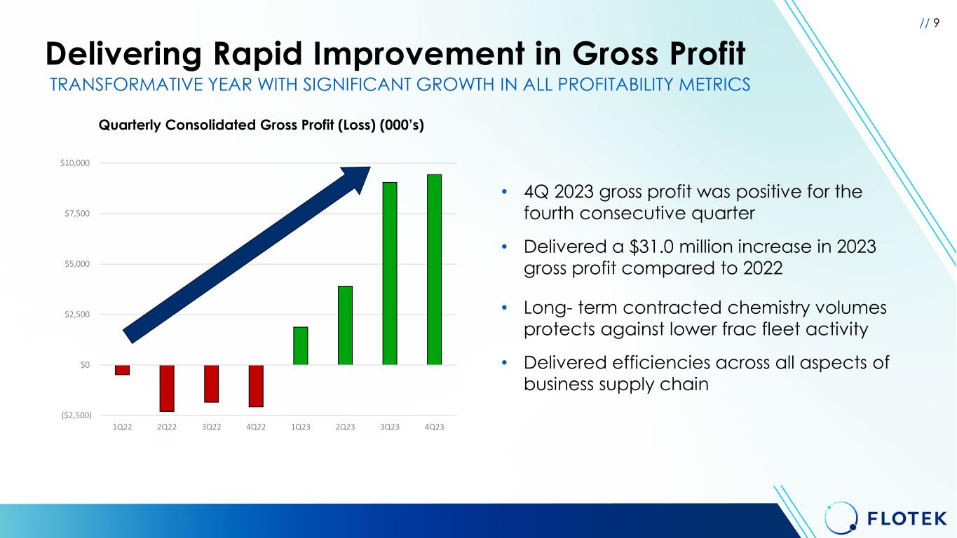 •Gross Profit (Loss): The Company generated gross profit of $9.4 million during the fourth quarter 2023 as compared to a gross loss of $2.1 million for the fourth quarter 2022. The improvement in fourth quarter 2023 gross profit was the result of successful initiatives throughout 2023 to drive cost improvements with respect to freight, logistics and materials, the increase in chemistry revenues from external customers as well as revenue attributable to the minimum chemistry purchase requirements contained in the ProFrac supply agreement.