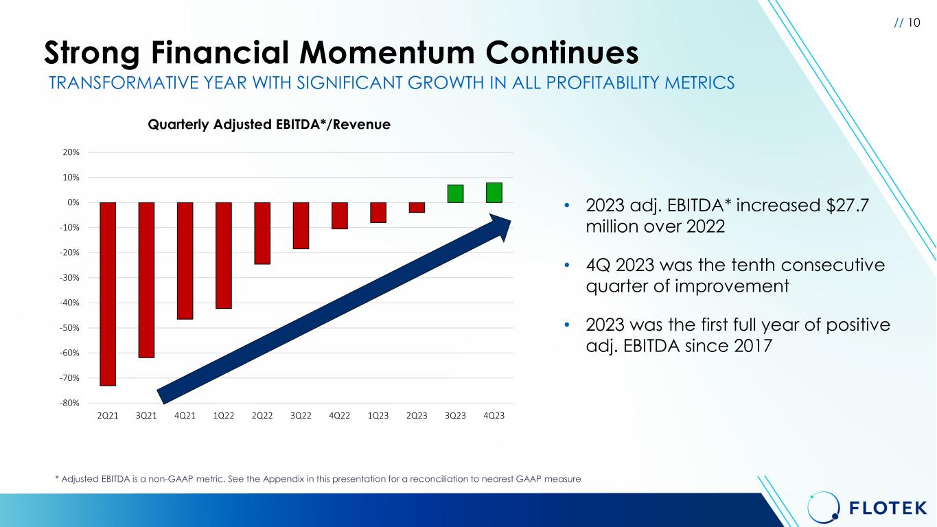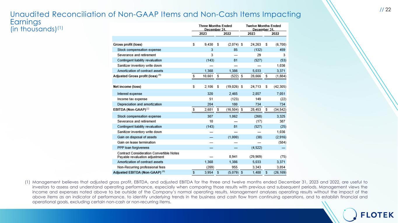 •Adjusted Gross Profit (Non-GAAP)(1): Flotek generated adjusted gross profit(1) of $10.7 million during the fourth quarter 2023 compared to adjusted gross loss(1) of $0.5 million for the fourth quarter 2022. Adjusted gross profit(1) for the full-year 2023 increased to $28.7 million compared to a loss of $1.9 million for the full-year 2022. Adjusted gross profit(1) excludes non-cash items, primarily amortization of contract assets.