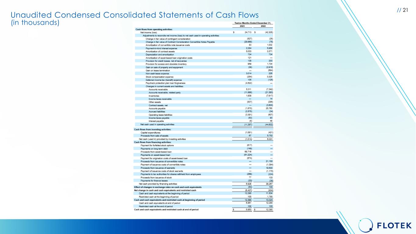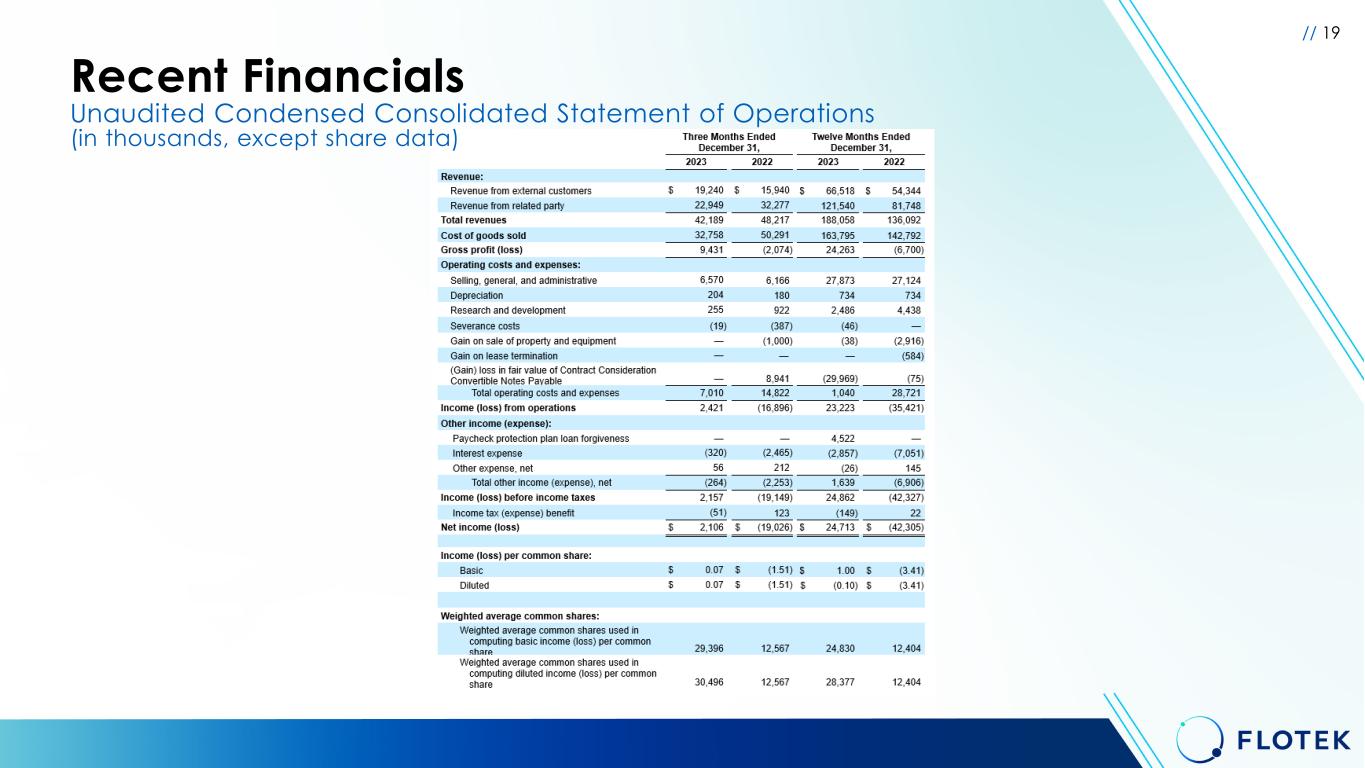 •Net Income (Loss) and EPS: Flotek reported net income of $2.1 million, or $0.07 per diluted share, for the fourth quarter 2023. This compares to a net loss of $19.0 million, or ($1.51) per diluted share, for the fourth quarter 2022. Net income for the full-year 2023 was $24.7 million, or ($0.10) per diluted share, compared to a net loss of $42.3 million, or ($3.41) per diluted share, for the comparable period of 2022. Net income (loss) for the fourth quarter 2022 and full-year 2023 and 2022 included non-cash gains (losses) on the fair value measurement of convertible notes payable totaling ($8.9) million, $30.0 million, and $0.1 million, respectively.
