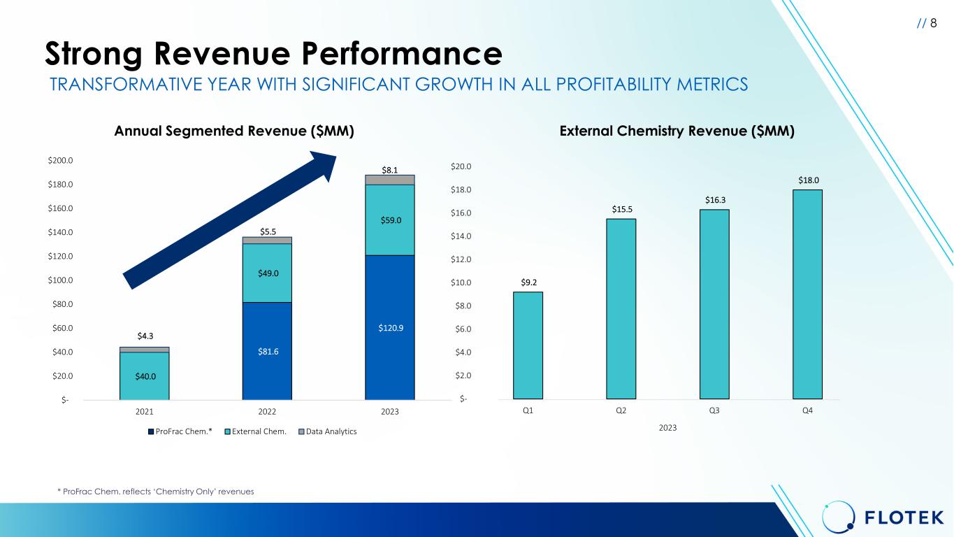 -通年の売上高は1億8,810万ドルで、2022年の売上高1億3,610万ドルに比べ38%増加した。外部顧客からの化学品収入は、上流の完成環境の減速を背景としながらも、2022年の収入を21%上回った。