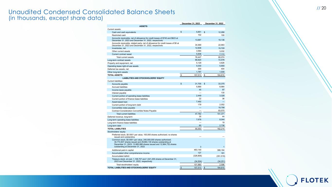 2024年3月12日、ヒューストン - フローテック・インダストリーズ社(以下「フローテック」または「当社」)(NYSE:FTK)は本日、純利益、売上総利益、調整後売上総利益(1)を含むすべての収益性指標が大幅に改善したことを特徴とする、2023年12月31日を期末とする第4四半期および通期の営業・財務業績を発表した。2017年以来初めて、当社は通期でプラスの調整後EBITDA(1)を計上した。