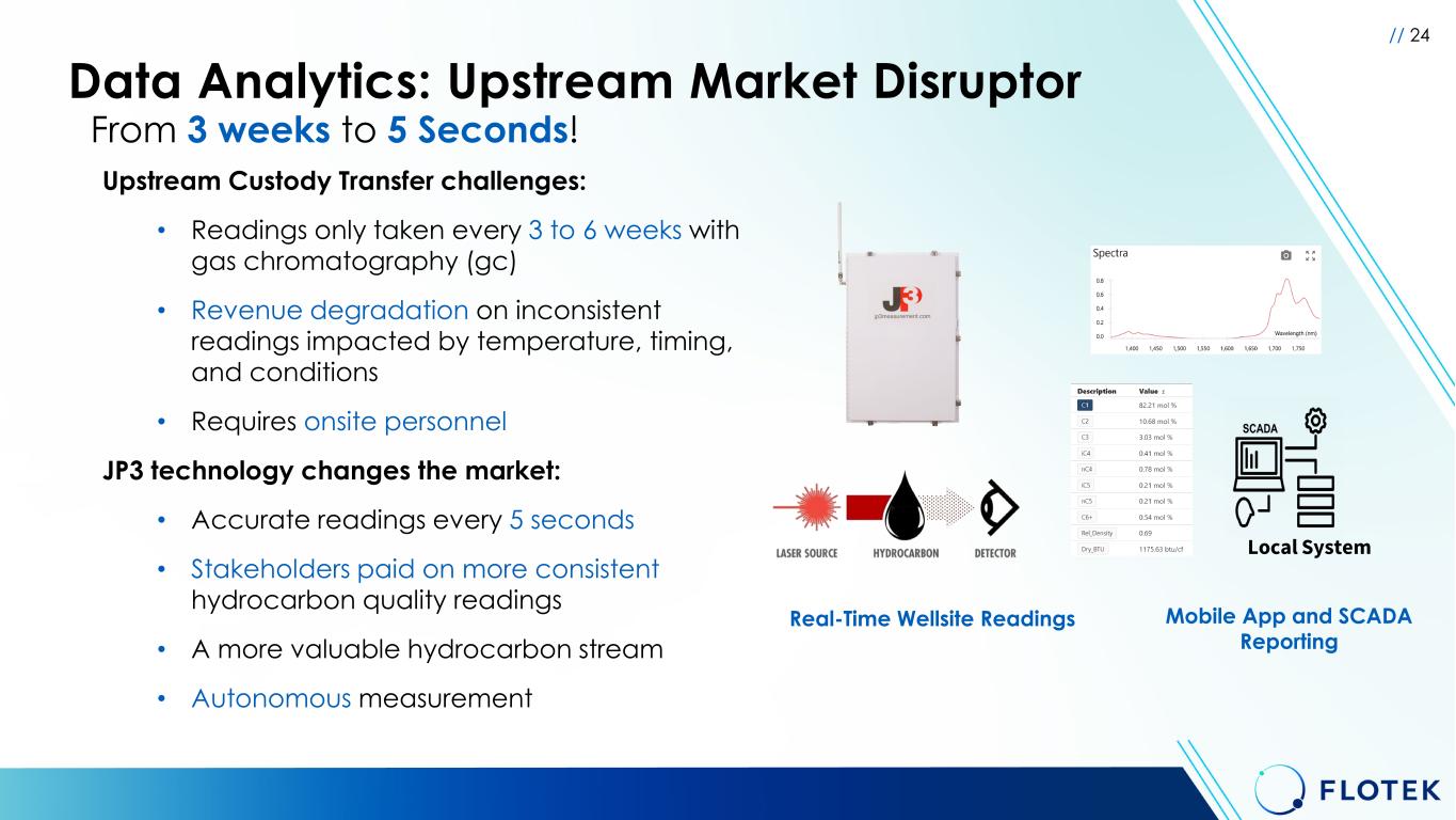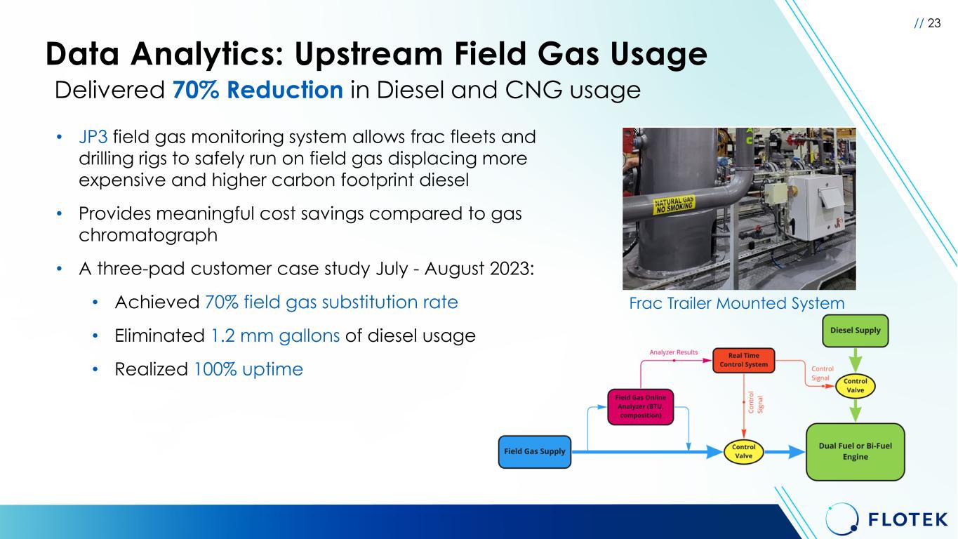 2024年に向けた当社の計画には、JP3の中流市場における強力なプレゼンスを維持するとともに、上流市場への浸透を加速させる新たな機会を追求することが含まれています。フローテックは現在、JP3の正確なリアルタイム測定を通じて、リースサイトやカストディー・トランスファーの場所での生産配分を改善するため、土地所有者グループと協力しています。このアプリケーションは、従来の割り当て測定技術に代わる大きな市場機会を意味する。さらに当社は、最近制定されたEPA規制の遵守に関連し、JP3の技術ソリューションの使用を実証するため、大手上流事業者とのフレア監視パイロットプログラムに参加しています。米国では2028年までに55,000基を超える既存のフレアがモニタリング規制の対象となる見込みであり、このアプリケーションはJP3にとって、上流領域への足跡を拡大する数年にわたる重要な機会となる可能性があります。