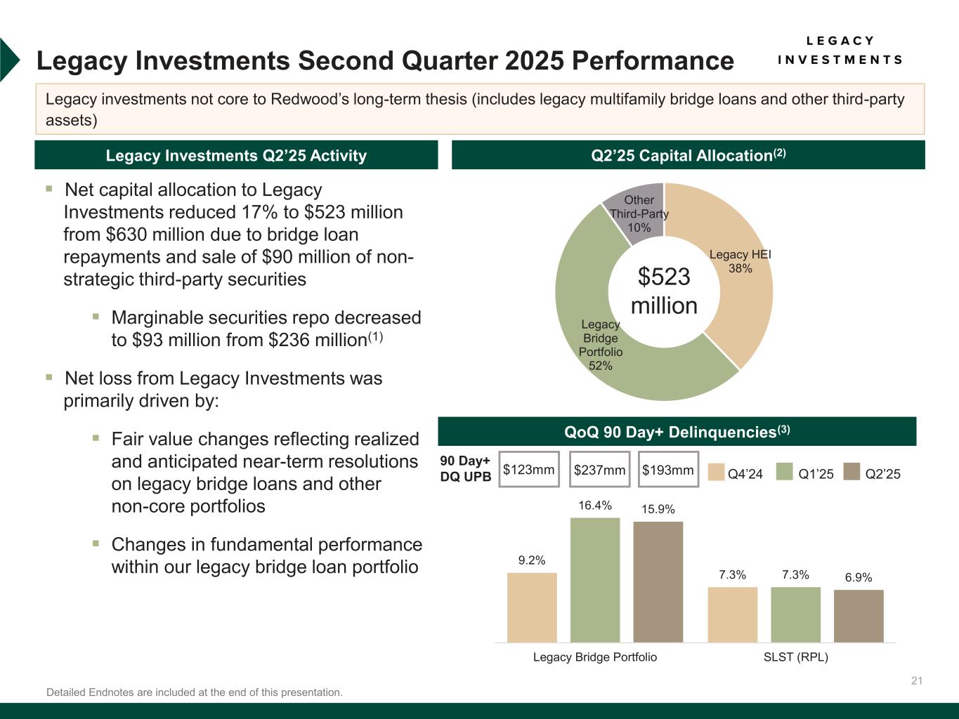 レガシー投資に割り当てられた資本は、2025年6月30日現在、2025年3月31日時点から1億700万ドル(17%)減少した。これは主に、レガシー・ブリッジ・ローンの返済、売却、公正価値の調整、および非中核的第三者資産の売却(または売却中)によるものである。