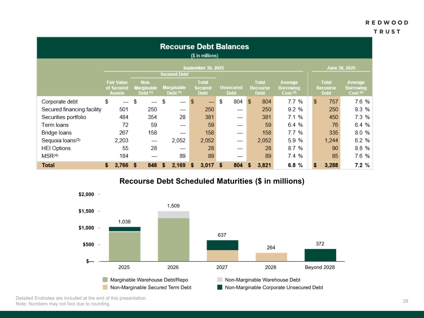 10.レガシー・インベストメンツのリコース・レバレッジ・レシオは、レガシー・インベストメンツのリコース債務を投下資本で割ったものと定義される。2025年9月30日現在の遡及債務には、レガシー・インベストメンツにおけるレッドウッドに遡及しない連結証券化債務(ABS発行)、その他の負債、その他の債務の13億ドルは含まれていません。2025年9月30日現在のレガシー・インベストメンツ・セグメントへの投下資本は4億5,900万ドルでした。