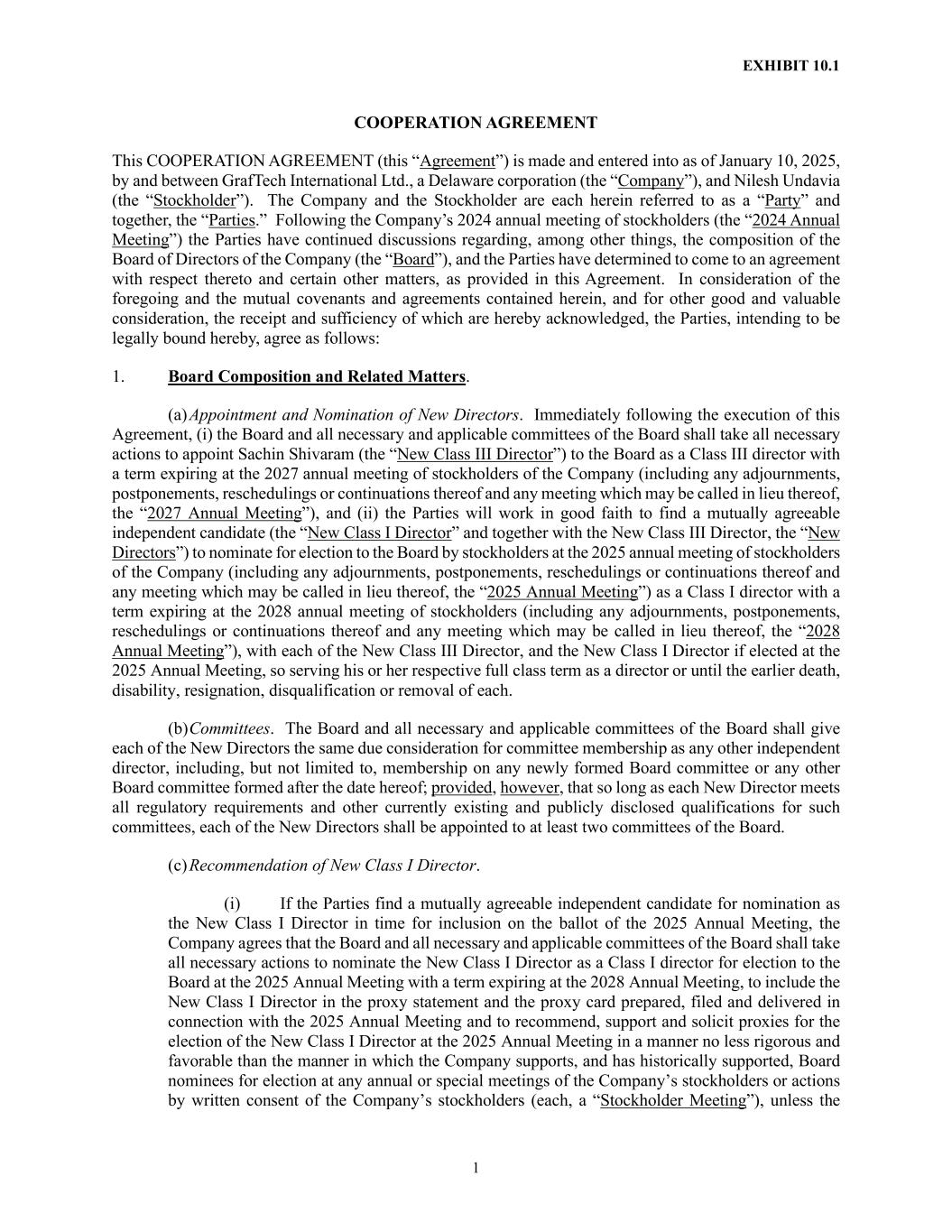 EXHIBIT 10.1 1 COOPERATION AGREEMENT This COOPERATION AGREEMENT (this “Agreement”) is made and entered into as of January 10, 2025, by and between GrafTech International Ltd., a Delaware corporation (the “Company”), and Nilesh Undavia (the “Stockholder”). The Company and the Stockholder are each herein referred to as a “Party” and together, the “Parties.” Following the Company’s 2024 annual meeting of stockholders (the “2024 Annual Meeting”) the Parties have continued discussions regarding, among other things, the composition of the Board of Directors of the Company (the “Board”), and the Parties have determined to come to an agreement with respect thereto and certain other matters, as provided in this Agreement. In consideration of the foregoing and the mutual covenants and agreements contained herein, and for other good and valuable consideration, the receipt and sufficiency of which are hereby acknowledged, the Parties, intending to be legally bound hereby, agree as follows: 1. Board Composition and Related Matters. (a) Appointment and Nomination of New Directors. Immediately following the execution of this Agreement, (i) the Board and all necessary and applicable committees of the Board shall take all necessary actions to appoint Sachin Shivaram (the “New Class III Director”) to the Board as a Class III director with a term expiring at the 2027 annual meeting of stockholders of the Company (including any adjournments, postponements, reschedulings or continuations thereof and any meeting which may be called in lieu thereof, the “2027 Annual Meeting”), and (ii) the Parties will work in good faith to find a mutually agreeable independent candidate (the “New Class I Director” and together with the New Class III Director, the “New Directors”) to nominate for election to the Board by stockholders at the 2025 annual meeting of stockholders of the Company (including any adjournments, postponements, reschedulings or continuations thereof and any meeting which may be called in lieu thereof, the “2025 Annual Meeting”) as a Class I director with a term expiring at the 2028 annual meeting of stockholders (including any adjournments, postponements, reschedulings or continuations thereof and any meeting which may be called in lieu thereof, the “2028 Annual Meeting”), with each of the New Class III Director, and the New Class I Director if elected at the 2025 Annual Meeting, so serving his or her respective full class term as a director or until the earlier death, disability, resignation, disqualification or removal of each. (b) Committees. The Board and all necessary and applicable committees of the Board shall give each of the New Directors the same due consideration for committee membership as any other independent director, including, but not limited to, membership on any newly formed Board committee or any other Board committee formed after the date hereof; provided, however, that so long as each New Director meets all regulatory requirements and other currently existing and publicly disclosed qualifications for such committees, each of the New Directors shall be appointed to at least two committees of the Board. (c) Recommendation of New Class I Director. (i) If the Parties find a mutually agreeable independent candidate for nomination as the New Class I Director in time for inclusion on the ballot of the 2025 Annual Meeting, the Company agrees that the Board and all necessary and applicable committees of the Board shall take all necessary actions to nominate the New Class I Director as a Class I director for election to the Board at the 2025 Annual Meeting with a term expiring at the 2028 Annual Meeting, to include the New Class I Director in the proxy statement and the proxy card prepared, filed and delivered in connection with the 2025 Annual Meeting and to recommend, support and solicit proxies for the election of the New Class I Director at the 2025 Annual Meeting in a manner no less rigorous and favorable than the manner in which the Company supports, and has historically supported, Board nominees for election at any annual or special meetings of the Company’s stockholders or actions by written consent of the Company’s stockholders (each, a “Stockholder Meeting”), unless the