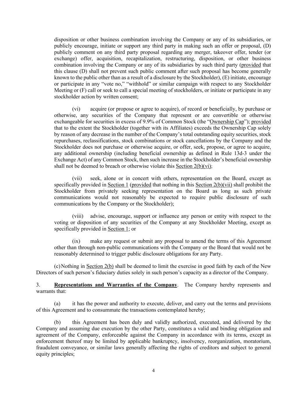 4 disposition or other business combination involving the Company or any of its subsidiaries, or publicly encourage, initiate or support any third party in making such an offer or proposal, (D) publicly comment on any third party proposal regarding any merger, takeover offer, tender (or exchange) offer, acquisition, recapitalization, restructuring, disposition, or other business combination involving the Company or any of its subsidiaries by such third party (provided that this clause (D) shall not prevent such public comment after such proposal has become generally known to the public other than as a result of a disclosure by the Stockholder), (E) initiate, encourage or participate in any “vote no,” “withhold” or similar campaign with respect to any Stockholder Meeting or (F) call or seek to call a special meeting of stockholders, or initiate or participate in any stockholder action by written consent; (vi) acquire (or propose or agree to acquire), of record or beneficially, by purchase or otherwise, any securities of the Company that represent or are convertible or otherwise exchangeable for securities in excess of 9.9% of Common Stock (the “Ownership Cap”); provided that to the extent the Stockholder (together with its Affiliates) exceeds the Ownership Cap solely by reason of any decrease in the number of the Company’s total outstanding equity securities, stock repurchases, reclassifications, stock combinations or stock cancellations by the Company and the Stockholder does not purchase or otherwise acquire, or offer, seek, propose, or agree to acquire, any additional ownership (including beneficial ownership as defined in Rule 13d-3 under the Exchange Act) of any Common Stock, then such increase in the Stockholder’s beneficial ownership shall not be deemed to breach or otherwise violate this Section 2(b)(vi); (vii) seek, alone or in concert with others, representation on the Board, except as specifically provided in Section 1 (provided that nothing in this Section 2(b)(vii) shall prohibit the Stockholder from privately seeking representation on the Board as long as such private communications would not reasonably be expected to require public disclosure of such communications by the Company or the Stockholder); (viii) advise, encourage, support or influence any person or entity with respect to the voting or disposition of any securities of the Company at any Stockholder Meeting, except as specifically provided in Section 1; or (ix) make any request or submit any proposal to amend the terms of this Agreement other than through non-public communications with the Company or the Board that would not be reasonably determined to trigger public disclosure obligations for any Party. (c) Nothing in Section 2(b) shall be deemed to limit the exercise in good faith by each of the New Directors of such person’s fiduciary duties solely in such person’s capacity as a director of the Company. 3. Representations and Warranties of the Company. The Company hereby represents and warrants that: (a) it has the power and authority to execute, deliver, and carry out the terms and provisions of this Agreement and to consummate the transactions contemplated hereby; (b) this Agreement has been duly and validly authorized, executed, and delivered by the Company and assuming due execution by the other Party, constitutes a valid and binding obligation and agreement of the Company, enforceable against the Company in accordance with its terms, except as enforcement thereof may be limited by applicable bankruptcy, insolvency, reorganization, moratorium, fraudulent conveyance, or similar laws generally affecting the rights of creditors and subject to general equity principles;