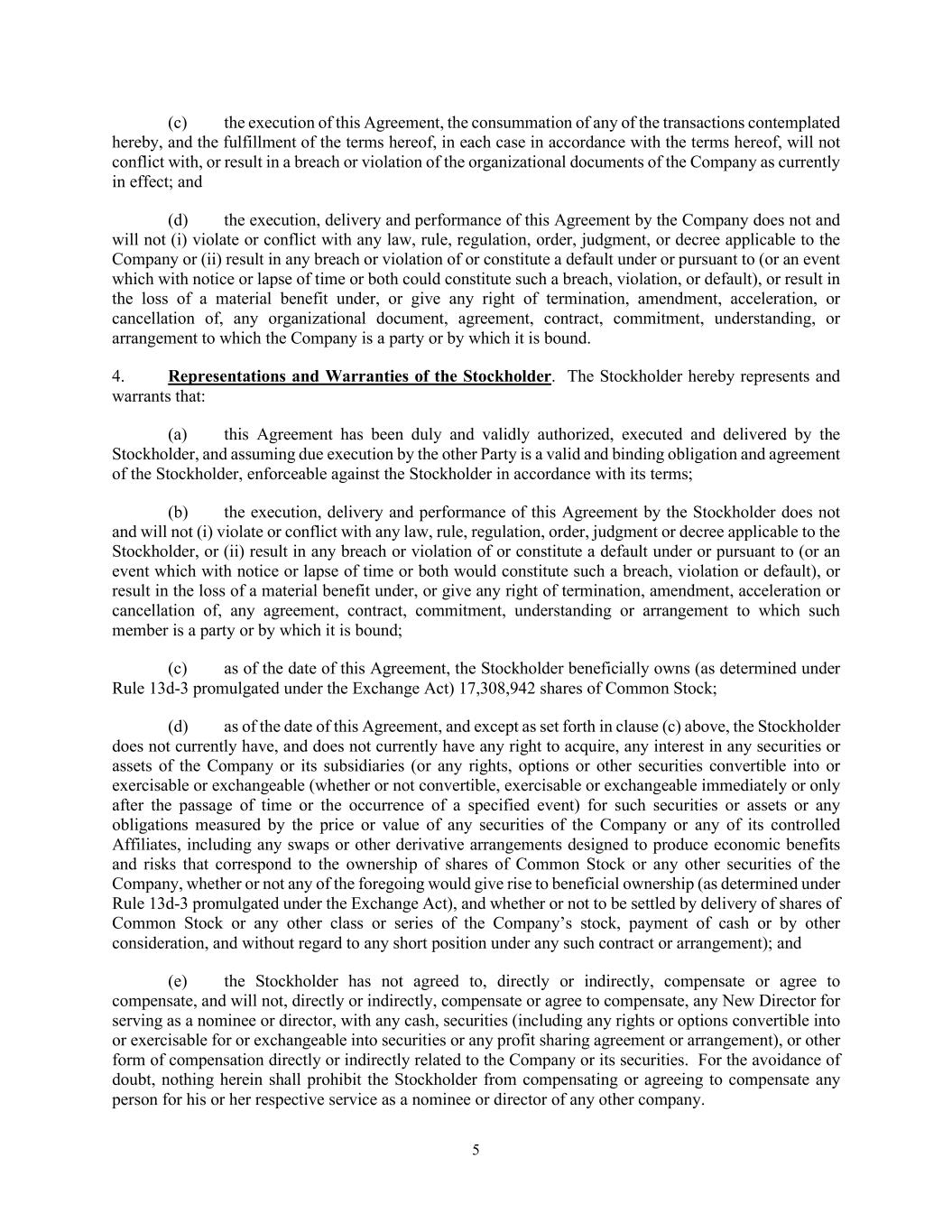 5 (c) the execution of this Agreement, the consummation of any of the transactions contemplated hereby, and the fulfillment of the terms hereof, in each case in accordance with the terms hereof, will not conflict with, or result in a breach or violation of the organizational documents of the Company as currently in effect; and (d) the execution, delivery and performance of this Agreement by the Company does not and will not (i) violate or conflict with any law, rule, regulation, order, judgment, or decree applicable to the Company or (ii) result in any breach or violation of or constitute a default under or pursuant to (or an event which with notice or lapse of time or both could constitute such a breach, violation, or default), or result in the loss of a material benefit under, or give any right of termination, amendment, acceleration, or cancellation of, any organizational document, agreement, contract, commitment, understanding, or arrangement to which the Company is a party or by which it is bound. 4. Representations and Warranties of the Stockholder. The Stockholder hereby represents and warrants that: (a) this Agreement has been duly and validly authorized, executed and delivered by the Stockholder, and assuming due execution by the other Party is a valid and binding obligation and agreement of the Stockholder, enforceable against the Stockholder in accordance with its terms; (b) the execution, delivery and performance of this Agreement by the Stockholder does not and will not (i) violate or conflict with any law, rule, regulation, order, judgment or decree applicable to the Stockholder, or (ii) result in any breach or violation of or constitute a default under or pursuant to (or an event which with notice or lapse of time or both would constitute such a breach, violation or default), or result in the loss of a material benefit under, or give any right of termination, amendment, acceleration or cancellation of, any agreement, contract, commitment, understanding or arrangement to which such member is a party or by which it is bound; (c) as of the date of this Agreement, the Stockholder beneficially owns (as determined under Rule 13d-3 promulgated under the Exchange Act) 17,308,942 shares of Common Stock; (d) as of the date of this Agreement, and except as set forth in clause (c) above, the Stockholder does not currently have, and does not currently have any right to acquire, any interest in any securities or assets of the Company or its subsidiaries (or any rights, options or other securities convertible into or exercisable or exchangeable (whether or not convertible, exercisable or exchangeable immediately or only after the passage of time or the occurrence of a specified event) for such securities or assets or any obligations measured by the price or value of any securities of the Company or any of its controlled Affiliates, including any swaps or other derivative arrangements designed to produce economic benefits and risks that correspond to the ownership of shares of Common Stock or any other securities of the Company, whether or not any of the foregoing would give rise to beneficial ownership (as determined under Rule 13d-3 promulgated under the Exchange Act), and whether or not to be settled by delivery of shares of Common Stock or any other class or series of the Company’s stock, payment of cash or by other consideration, and without regard to any short position under any such contract or arrangement); and (e) the Stockholder has not agreed to, directly or indirectly, compensate or agree to compensate, and will not, directly or indirectly, compensate or agree to compensate, any New Director for serving as a nominee or director, with any cash, securities (including any rights or options convertible into or exercisable for or exchangeable into securities or any profit sharing agreement or arrangement), or other form of compensation directly or indirectly related to the Company or its securities. For the avoidance of doubt, nothing herein shall prohibit the Stockholder from compensating or agreeing to compensate any person for his or her respective service as a nominee or director of any other company.