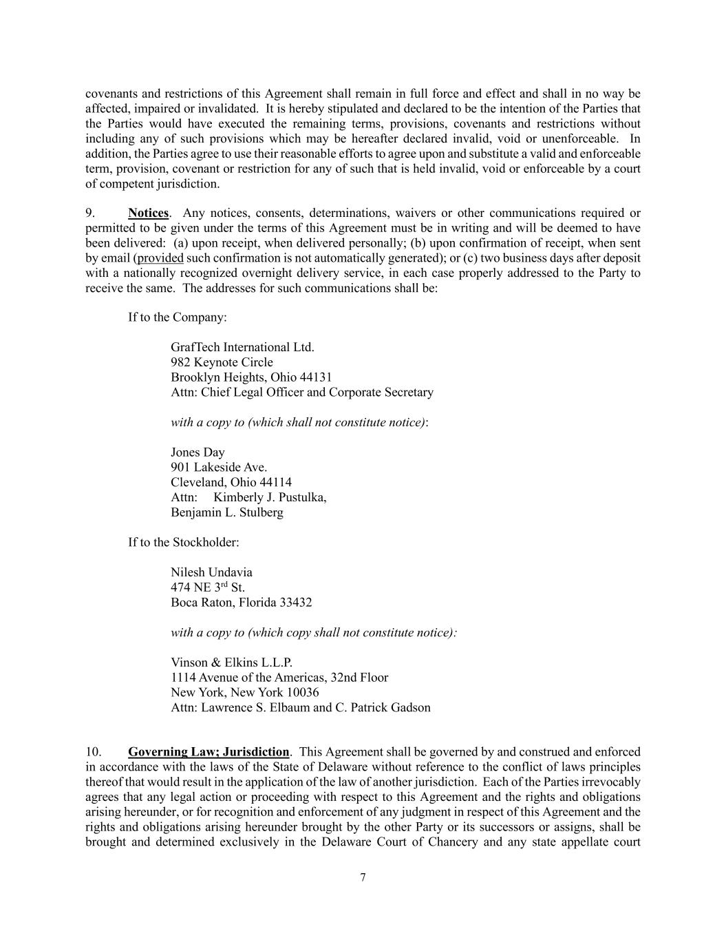 7 covenants and restrictions of this Agreement shall remain in full force and effect and shall in no way be affected, impaired or invalidated. It is hereby stipulated and declared to be the intention of the Parties that the Parties would have executed the remaining terms, provisions, covenants and restrictions without including any of such provisions which may be hereafter declared invalid, void or unenforceable. In addition, the Parties agree to use their reasonable efforts to agree upon and substitute a valid and enforceable term, provision, covenant or restriction for any of such that is held invalid, void or enforceable by a court of competent jurisdiction. 9. Notices. Any notices, consents, determinations, waivers or other communications required or permitted to be given under the terms of this Agreement must be in writing and will be deemed to have been delivered: (a) upon receipt, when delivered personally; (b) upon confirmation of receipt, when sent by email (provided such confirmation is not automatically generated); or (c) two business days after deposit with a nationally recognized overnight delivery service, in each case properly addressed to the Party to receive the same. The addresses for such communications shall be: If to the Company: GrafTech International Ltd. 982 Keynote Circle Brooklyn Heights, Ohio 44131 Attn: Chief Legal Officer and Corporate Secretary with a copy to (which shall not constitute notice): Jones Day 901 Lakeside Ave. Cleveland, Ohio 44114 Attn: Kimberly J. Pustulka, Benjamin L. Stulberg If to the Stockholder: Nilesh Undavia 474 NE 3rd St. Boca Raton, Florida 33432 with a copy to (which copy shall not constitute notice): Vinson & Elkins L.L.P. 1114 Avenue of the Americas, 32nd Floor New York, New York 10036 Attn: Lawrence S. Elbaum and C. Patrick Gadson 10. Governing Law; Jurisdiction. This Agreement shall be governed by and construed and enforced in accordance with the laws of the State of Delaware without reference to the conflict of laws principles thereof that would result in the application of the law of another jurisdiction. Each of the Parties irrevocably agrees that any legal action or proceeding with respect to this Agreement and the rights and obligations arising hereunder, or for recognition and enforcement of any judgment in respect of this Agreement and the rights and obligations arising hereunder brought by the other Party or its successors or assigns, shall be brought and determined exclusively in the Delaware Court of Chancery and any state appellate court