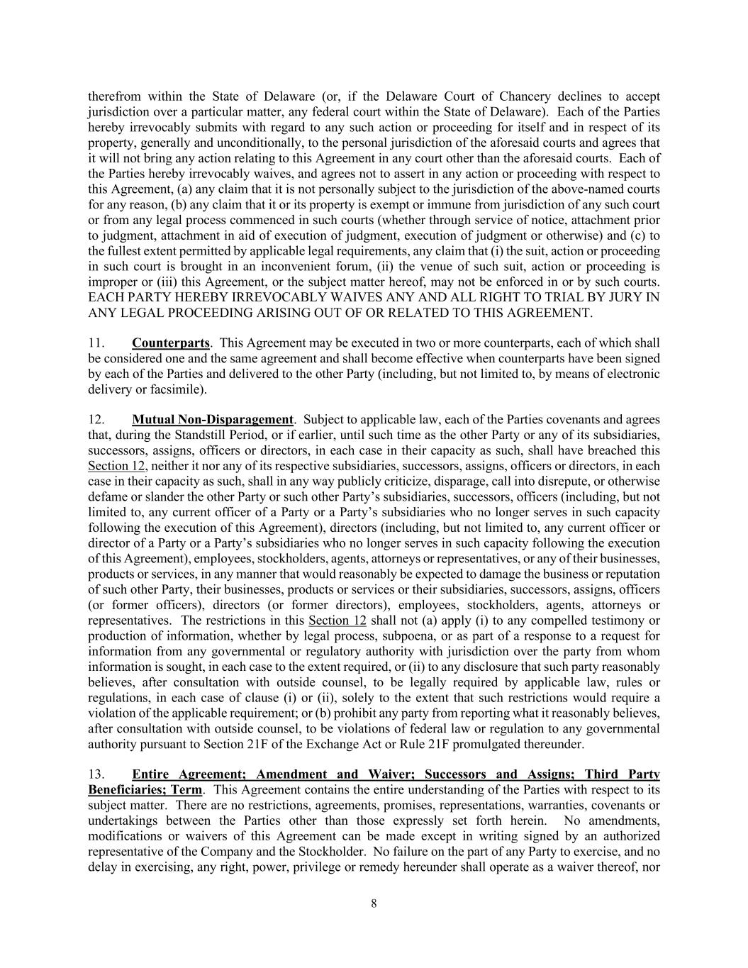 8 therefrom within the State of Delaware (or, if the Delaware Court of Chancery declines to accept jurisdiction over a particular matter, any federal court within the State of Delaware). Each of the Parties hereby irrevocably submits with regard to any such action or proceeding for itself and in respect of its property, generally and unconditionally, to the personal jurisdiction of the aforesaid courts and agrees that it will not bring any action relating to this Agreement in any court other than the aforesaid courts. Each of the Parties hereby irrevocably waives, and agrees not to assert in any action or proceeding with respect to this Agreement, (a) any claim that it is not personally subject to the jurisdiction of the above-named courts for any reason, (b) any claim that it or its property is exempt or immune from jurisdiction of any such court or from any legal process commenced in such courts (whether through service of notice, attachment prior to judgment, attachment in aid of execution of judgment, execution of judgment or otherwise) and (c) to the fullest extent permitted by applicable legal requirements, any claim that (i) the suit, action or proceeding in such court is brought in an inconvenient forum, (ii) the venue of such suit, action or proceeding is improper or (iii) this Agreement, or the subject matter hereof, may not be enforced in or by such courts. EACH PARTY HEREBY IRREVOCABLY WAIVES ANY AND ALL RIGHT TO TRIAL BY JURY IN ANY LEGAL PROCEEDING ARISING OUT OF OR RELATED TO THIS AGREEMENT. 11. Counterparts. This Agreement may be executed in two or more counterparts, each of which shall be considered one and the same agreement and shall become effective when counterparts have been signed by each of the Parties and delivered to the other Party (including, but not limited to, by means of electronic delivery or facsimile). 12. Mutual Non-Disparagement. Subject to applicable law, each of the Parties covenants and agrees that, during the Standstill Period, or if earlier, until such time as the other Party or any of its subsidiaries, successors, assigns, officers or directors, in each case in their capacity as such, shall have breached this Section 12, neither it nor any of its respective subsidiaries, successors, assigns, officers or directors, in each case in their capacity as such, shall in any way publicly criticize, disparage, call into disrepute, or otherwise defame or slander the other Party or such other Party’s subsidiaries, successors, officers (including, but not limited to, any current officer of a Party or a Party’s subsidiaries who no longer serves in such capacity following the execution of this Agreement), directors (including, but not limited to, any current officer or director of a Party or a Party’s subsidiaries who no longer serves in such capacity following the execution of this Agreement), employees, stockholders, agents, attorneys or representatives, or any of their businesses, products or services, in any manner that would reasonably be expected to damage the business or reputation of such other Party, their businesses, products or services or their subsidiaries, successors, assigns, officers (or former officers), directors (or former directors), employees, stockholders, agents, attorneys or representatives. The restrictions in this Section 12 shall not (a) apply (i) to any compelled testimony or production of information, whether by legal process, subpoena, or as part of a response to a request for information from any governmental or regulatory authority with jurisdiction over the party from whom information is sought, in each case to the extent required, or (ii) to any disclosure that such party reasonably believes, after consultation with outside counsel, to be legally required by applicable law, rules or regulations, in each case of clause (i) or (ii), solely to the extent that such restrictions would require a violation of the applicable requirement; or (b) prohibit any party from reporting what it reasonably believes, after consultation with outside counsel, to be violations of federal law or regulation to any governmental authority pursuant to Section 21F of the Exchange Act or Rule 21F promulgated thereunder. 13. Entire Agreement; Amendment and Waiver; Successors and Assigns; Third Party Beneficiaries; Term. This Agreement contains the entire understanding of the Parties with respect to its subject matter. There are no restrictions, agreements, promises, representations, warranties, covenants or undertakings between the Parties other than those expressly set forth herein. No amendments, modifications or waivers of this Agreement can be made except in writing signed by an authorized representative of the Company and the Stockholder. No failure on the part of any Party to exercise, and no delay in exercising, any right, power, privilege or remedy hereunder shall operate as a waiver thereof, nor