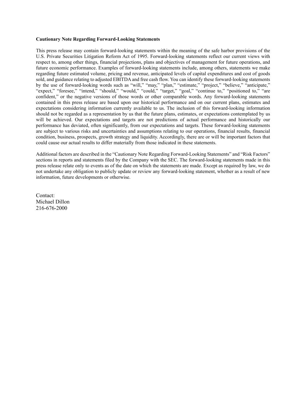 Cautionary Note Regarding Forward-Looking Statements This press release may contain forward-looking statements within the meaning of the safe harbor provisions of the U.S. Private Securities Litigation Reform Act of 1995. Forward-looking statements reflect our current views with respect to, among other things, financial projections, plans and objectives of management for future operations, and future economic performance. Examples of forward-looking statements include, among others, statements we make regarding future estimated volume, pricing and revenue, anticipated levels of capital expenditures and cost of goods sold, and guidance relating to adjusted EBITDA and free cash flow. You can identify these forward-looking statements by the use of forward-looking words such as “will,” “may,” “plan,” “estimate,” “project,” “believe,” “anticipate,” “expect,” “foresee,” “intend,” “should,” “would,” “could,” “target,” “goal,” “continue to,” “positioned to,” “are confident,” or the negative versions of those words or other comparable words. Any forward-looking statements contained in this press release are based upon our historical performance and on our current plans, estimates and expectations considering information currently available to us. The inclusion of this forward-looking information should not be regarded as a representation by us that the future plans, estimates, or expectations contemplated by us will be achieved. Our expectations and targets are not predictions of actual performance and historically our performance has deviated, often significantly, from our expectations and targets. These forward-looking statements are subject to various risks and uncertainties and assumptions relating to our operations, financial results, financial condition, business, prospects, growth strategy and liquidity. Accordingly, there are or will be important factors that could cause our actual results to differ materially from those indicated in these statements. Additional factors are described in the “Cautionary Note Regarding Forward-Looking Statements” and “Risk Factors” sections in reports and statements filed by the Company with the SEC. The forward-looking statements made in this press release relate only to events as of the date on which the statements are made. Except as required by law, we do not undertake any obligation to publicly update or review any forward-looking statement, whether as a result of new information, future developments or otherwise. Contact: Michael Dillon 216-676-2000