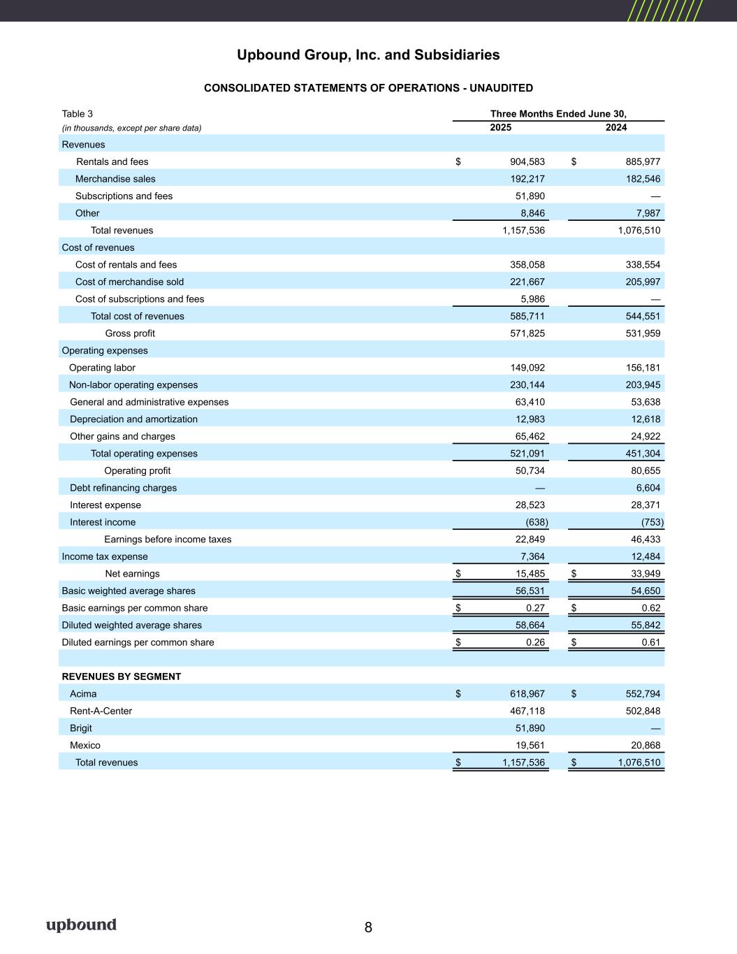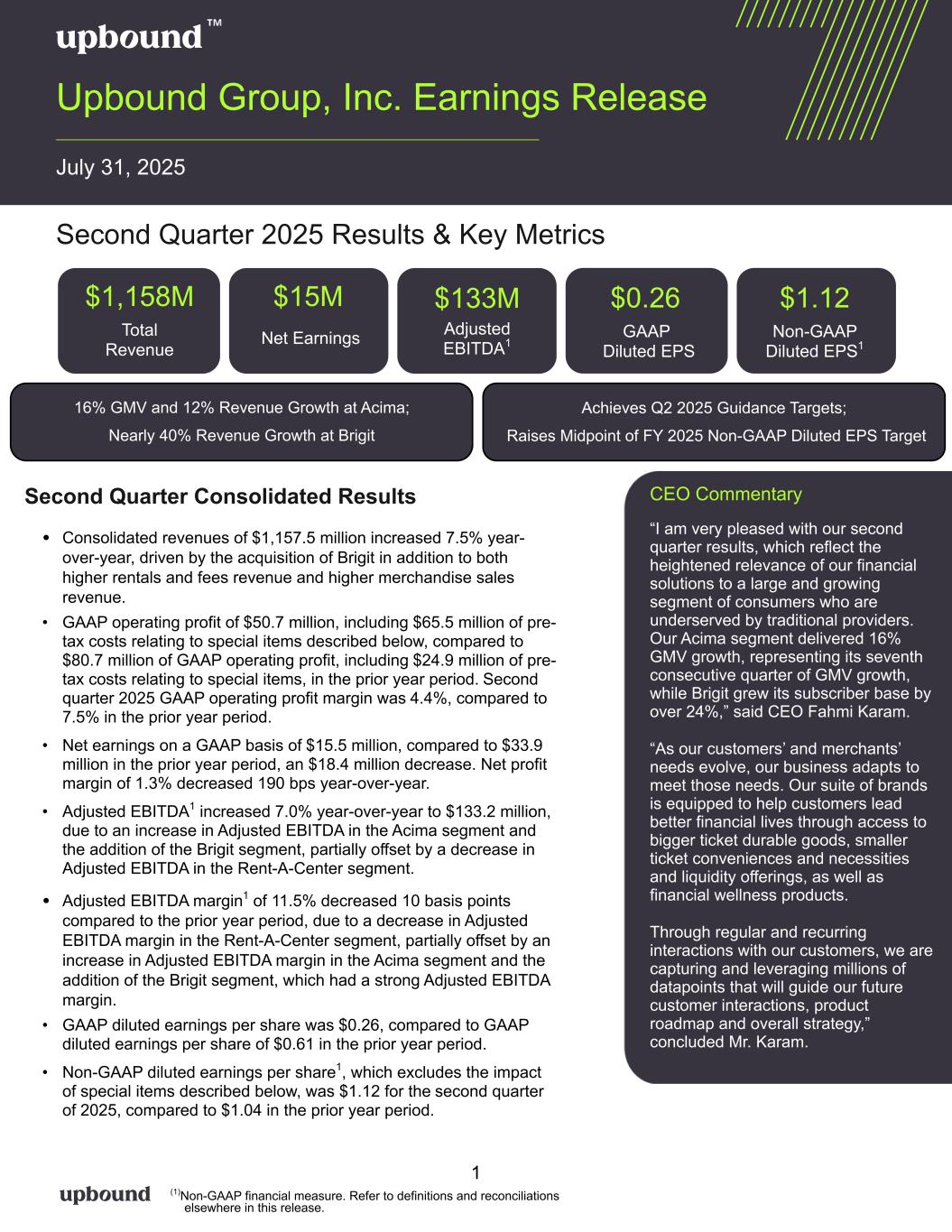 16% GMV and 12% Revenue Growth at Acima; Nearly 40% Revenue Growth at Brigit Achieves Q2 2025 Guidance Targets; Raises Midpoint of FY 2025 Non-GAAP Diluted EPS Target Total Revenue CEO Commentary “I am very pleased with our second quarter results, which reflect the heightened relevance of our financial solutions to a large and growing segment of consumers who are underserved by traditional providers. Our Acima segment delivered 16% GMV growth, representing its seventh consecutive quarter of GMV growth, while Brigit grew its subscriber base by over 24%,” said CEO Fahmi Karam. “As our customers’ and merchants’ needs evolve, our business adapts to meet those needs. Our suite of brands is equipped to help customers lead better financial lives through access to bigger ticket durable goods, smaller ticket conveniences and necessities and liquidity offerings, as well as financial wellness products. Through regular and recurring interactions with our customers, we are capturing and leveraging millions of datapoints that will guide our future customer interactions, product roadmap and overall strategy,” concluded Mr. Karam. Upbound Group, Inc. Earnings Release July 31, 2025 Second Quarter 2025 Results & Key Metrics Second Quarter Consolidated Results • Consolidated revenues of $1,157.5 million increased 7.5% year- over-year, driven by the acquisition of Brigit in addition to both higher rentals and fees revenue and higher merchandise sales revenue. • GAAP operating profit of $50.7 million, including $65.5 million of pre- tax costs relating to special items described below, compared to $80.7 million of GAAP operating profit, including $24.9 million of pre- tax costs relating to special items, in the prior year period. Second quarter 2025 GAAP operating profit margin was 4.4%, compared to 7.5% in the prior year period. • Net earnings on a GAAP basis of $15.5 million, compared to $33.9 million in the prior year period, an $18.4 million decrease. Net profit margin of 1.3% decreased 190 bps year-over-year. • Adjusted EBITDA1 increased 7.0% year-over-year to $133.2 million, due to an increase in Adjusted EBITDA in the Acima segment and the addition of the Brigit segment, partially offset by a decrease in Adjusted EBITDA in the Rent-A-Center segment. • Adjusted EBITDA margin1 of 11.5% decreased 10 basis points compared to the prior year period, due to a decrease in Adjusted EBITDA margin in the Rent-A-Center segment, partially offset by an increase in Adjusted EBITDA margin in the Acima segment and the addition of the Brigit segment, which had a strong Adjusted EBITDA margin. • GAAP diluted earnings per share was $0.26, compared to GAAP diluted earnings per share of $0.61 in the prior year period. • Non-GAAP diluted earnings per share1, which excludes the impact of special items described below, was $1.12 for the second quarter of 2025, compared to $1.04 in the prior year period. 1 (1)Non-GAAP financial measure. Refer to definitions and reconciliations elsewhere in this release. $1,158M Total Revenue GAAP Diluted EPS $0.26 Non-GAAP Diluted EPS1 Net Earnings $15M Adjusted EBITDA1 $1.12$133M