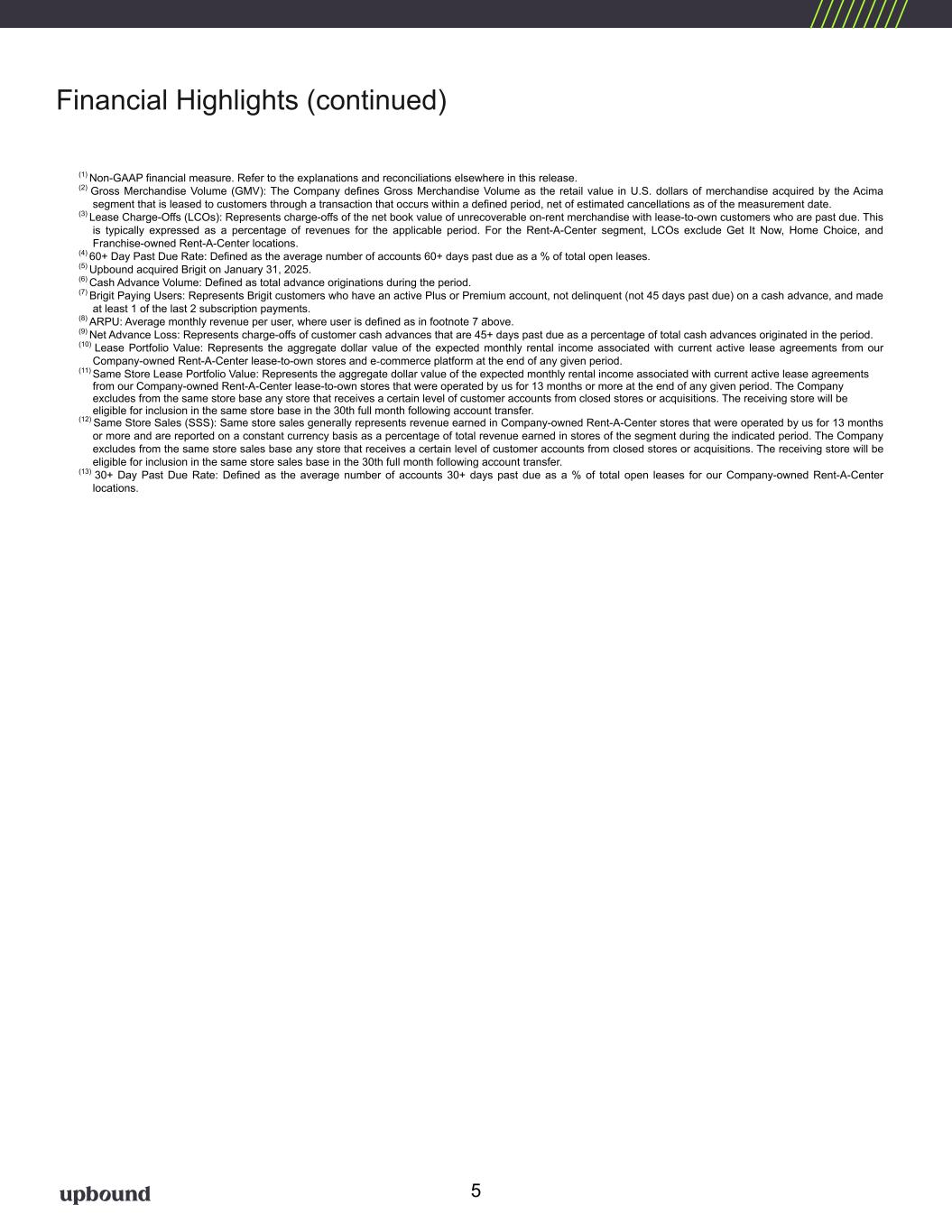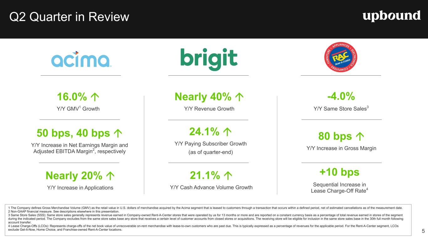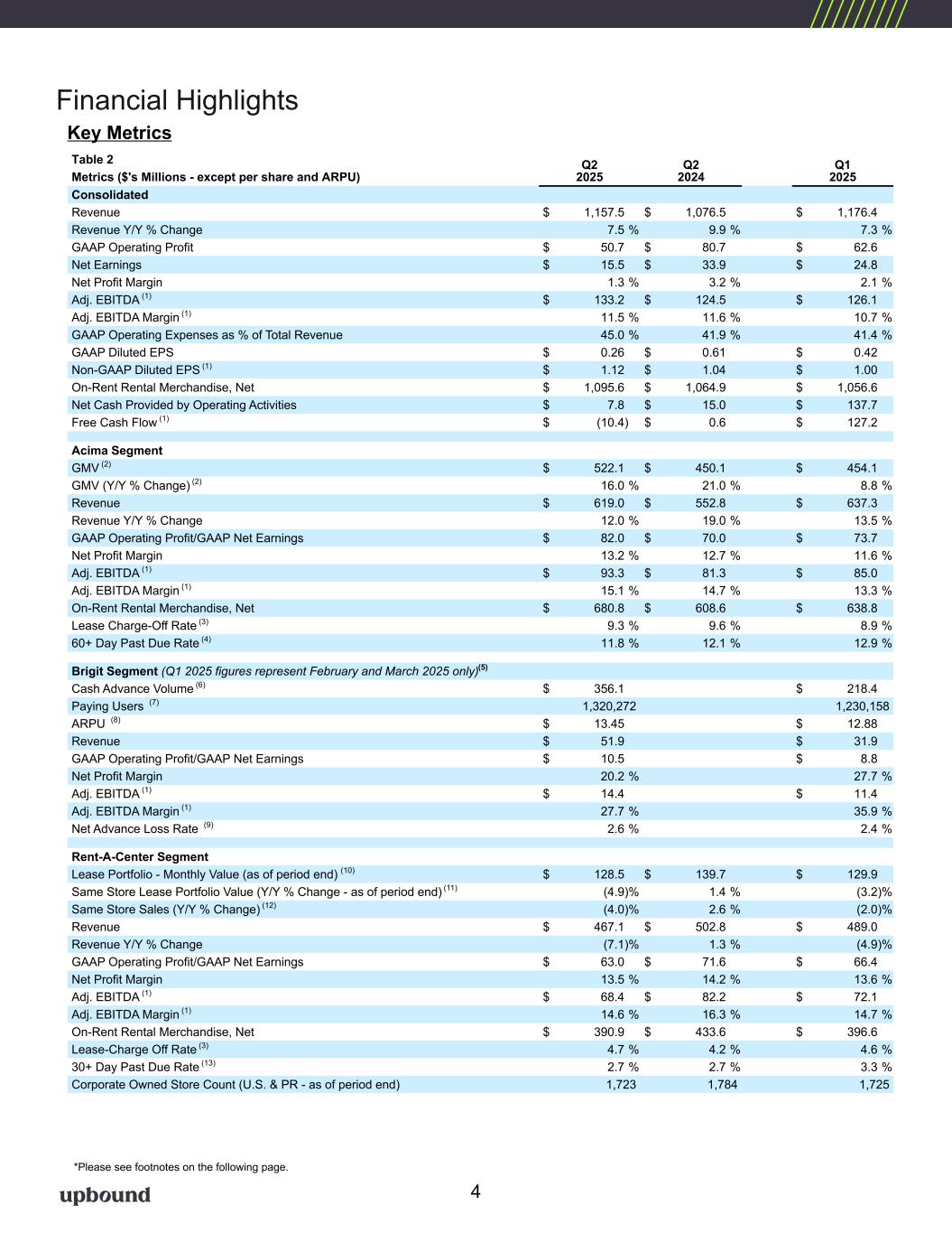 Table 2 Q2 2025 Q2 2024 Q1 2025Metrics ($'s Millions - except per share and ARPU) Consolidated Revenue $ 1,157.5 $ 1,076.5 $ 1,176.4 Revenue Y/Y % Change 7.5 % 9.9 % 7.3 % GAAP Operating Profit $ 50.7 $ 80.7 $ 62.6 Net Earnings $ 15.5 $ 33.9 $ 24.8 Net Profit Margin 1.3 % 3.2 % 2.1 % Adj. EBITDA (1) $ 133.2 $ 124.5 $ 126.1 Adj. EBITDA Margin (1) 11.5 % 11.6 % 10.7 % GAAP Operating Expenses as % of Total Revenue 45.0 % 41.9 % 41.4 % GAAP Diluted EPS $ 0.26 $ 0.61 $ 0.42 Non-GAAP Diluted EPS (1) $ 1.12 $ 1.04 $ 1.00 On-Rent Rental Merchandise, Net $ 1,095.6 $ 1,064.9 $ 1,056.6 Net Cash Provided by Operating Activities $ 7.8 $ 15.0 $ 137.7 Free Cash Flow (1) $ (10.4) $ 0.6 $ 127.2 Acima Segment GMV (2) $ 522.1 $ 450.1 $ 454.1 GMV (Y/Y % Change) (2) 16.0 % 21.0 % 8.8 % Revenue $ 619.0 $ 552.8 $ 637.3 Revenue Y/Y % Change 12.0 % 19.0 % 13.5 % GAAP Operating Profit/GAAP Net Earnings $ 82.0 $ 70.0 $ 73.7 Net Profit Margin 13.2 % 12.7 % 11.6 % Adj. EBITDA (1) $ 93.3 $ 81.3 $ 85.0 Adj. EBITDA Margin (1) 15.1 % 14.7 % 13.3 % On-Rent Rental Merchandise, Net $ 680.8 $ 608.6 $ 638.8 Lease Charge-Off Rate (3) 9.3 % 9.6 % 8.9 % 60+ Day Past Due Rate (4) 11.8 % 12.1 % 12.9 % Brigit Segment (Q1 2025 figures represent February and March 2025 only)(5) Cash Advance Volume (6) $ 356.1 $ 218.4 Paying Users (7) 1,320,272 1,230,158 ARPU (8) $ 13.45 $ 12.88 Revenue $ 51.9 $ 31.9 GAAP Operating Profit/GAAP Net Earnings $ 10.5 $ 8.8 Net Profit Margin 20.2 % 27.7 % Adj. EBITDA (1) $ 14.4 $ 11.4 Adj. EBITDA Margin (1) 27.7 % 35.9 % Net Advance Loss Rate (9) 2.6 % 2.4 % Rent-A-Center Segment Lease Portfolio - Monthly Value (as of period end) (10) $ 128.5 $ 139.7 $ 129.9 Same Store Lease Portfolio Value (Y/Y % Change - as of period end) (11) (4.9) % 1.4 % (3.2) % Same Store Sales (Y/Y % Change) (12) (4.0) % 2.6 % (2.0) % Revenue $ 467.1 $ 502.8 $ 489.0 Revenue Y/Y % Change (7.1) % 1.3 % (4.9) % GAAP Operating Profit/GAAP Net Earnings $ 63.0 $ 71.6 $ 66.4 Net Profit Margin 13.5 % 14.2 % 13.6 % Adj. EBITDA (1) $ 68.4 $ 82.2 $ 72.1 Adj. EBITDA Margin (1) 14.6 % 16.3 % 14.7 % On-Rent Rental Merchandise, Net $ 390.9 $ 433.6 $ 396.6 Lease-Charge Off Rate (3) 4.7 % 4.2 % 4.6 % 30+ Day Past Due Rate (13) 2.7 % 2.7 % 3.3 % Corporate Owned Store Count (U.S. & PR - as of period end) 1,723 1,784 1,725 Financial Highlights *Please see footnotes on the following page. Key Metrics 4