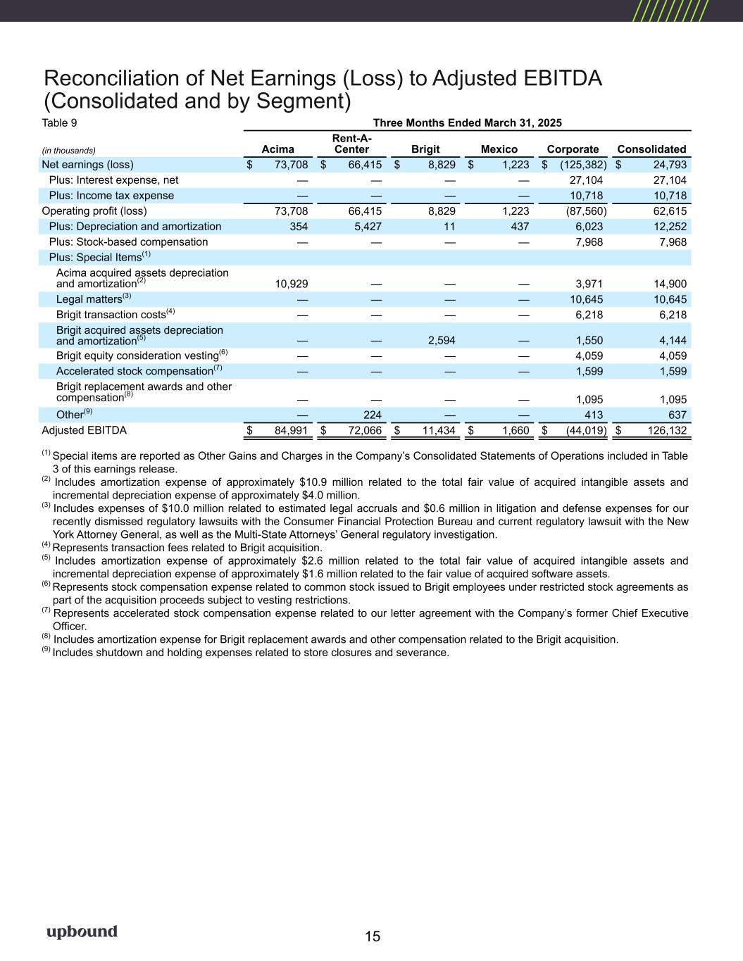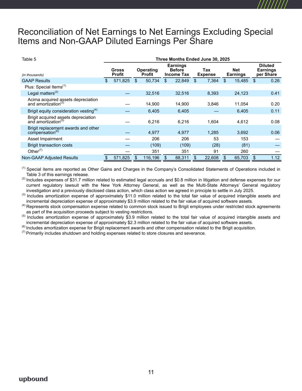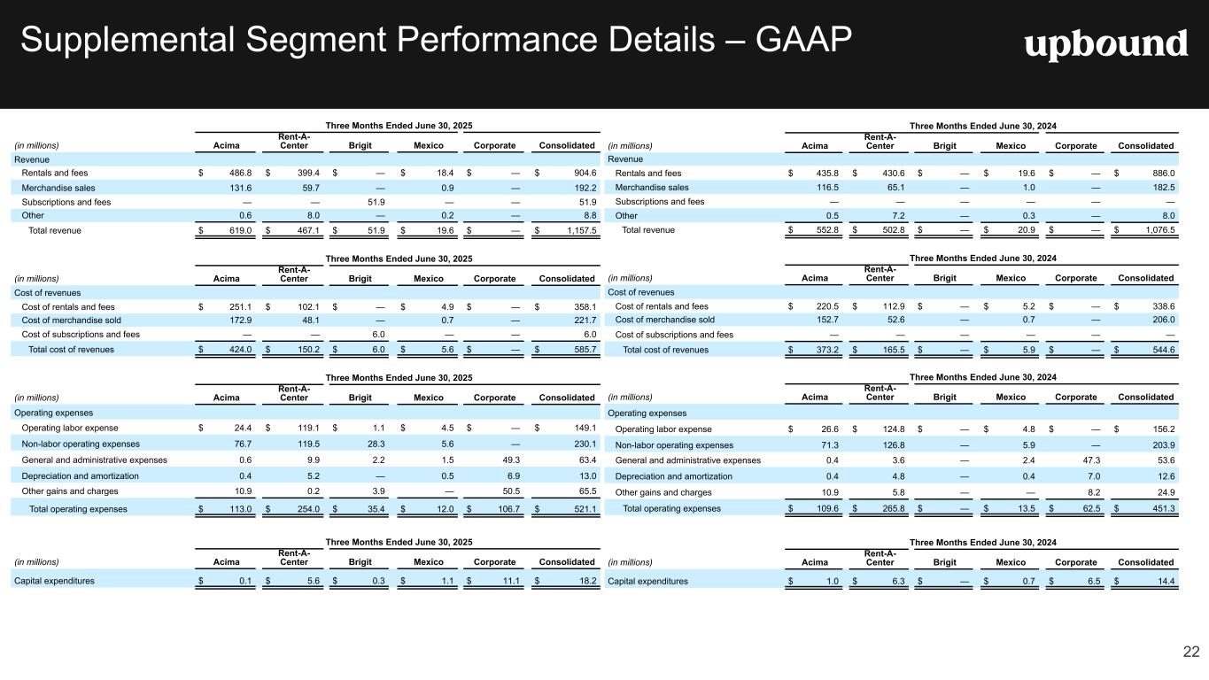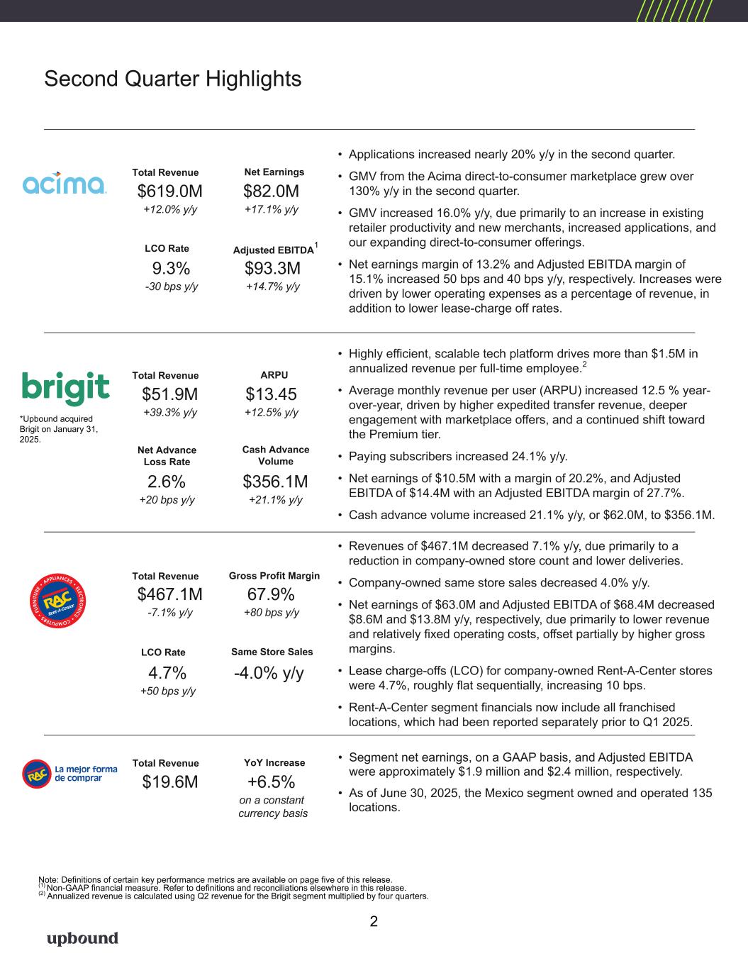 Table 2 Q2 2025 Q2 2024 Q1 2025Metrics ($'s Millions - except per share and ARPU) Consolidated Revenue $ 1,157.5 $ 1,076.5 $ 1,176.4 Revenue Y/Y % Change 7.5 % 9.9 % 7.3 % GAAP Operating Profit $ 50.7 $ 80.7 $ 62.6 Net Earnings $ 15.5 $ 33.9 $ 24.8 Net Profit Margin 1.3 % 3.2 % 2.1 % Adj. EBITDA (1) $ 133.2 $ 124.5 $ 126.1 Adj. EBITDA Margin (1) 11.5 % 11.6 % 10.7 % GAAP Operating Expenses as % of Total Revenue 45.0 % 41.9 % 41.4 % GAAP Diluted EPS $ 0.26 $ 0.61 $ 0.42 Non-GAAP Diluted EPS (1) $ 1.12 $ 1.04 $ 1.00 On-Rent Rental Merchandise, Net $ 1,095.6 $ 1,064.9 $ 1,056.6 Net Cash Provided by Operating Activities $ 7.8 $ 15.0 $ 137.7 Free Cash Flow (1) $ (10.4) $ 0.6 $ 127.2 Acima Segment GMV (2) $ 522.1 $ 450.1 $ 454.1 GMV (Y/Y % Change) (2) 16.0 % 21.0 % 8.8 % Revenue $ 619.0 $ 552.8 $ 637.3 Revenue Y/Y % Change 12.0 % 19.0 % 13.5 % GAAP Operating Profit/GAAP Net Earnings $ 82.0 $ 70.0 $ 73.7 Net Profit Margin 13.2 % 12.7 % 11.6 % Adj. EBITDA (1) $ 93.3 $ 81.3 $ 85.0 Adj. EBITDA Margin (1) 15.1 % 14.7 % 13.3 % On-Rent Rental Merchandise, Net $ 680.8 $ 608.6 $ 638.8 Lease Charge-Off Rate (3) 9.3 % 9.6 % 8.9 % 60+ Day Past Due Rate (4) 11.8 % 12.1 % 12.9 % Brigit Segment (Q1 2025 figures represent February and March 2025 only)(5) Cash Advance Volume (6) $ 356.1 $ 218.4 Paying Users (7) 1,320,272 1,230,158 ARPU (8) $ 13.45 $ 12.88 Revenue $ 51.9 $ 31.9 GAAP Operating Profit/GAAP Net Earnings $ 10.5 $ 8.8 Net Profit Margin 20.2 % 27.7 % Adj. EBITDA (1) $ 14.4 $ 11.4 Adj. EBITDA Margin (1) 27.7 % 35.9 % Net Advance Loss Rate (9) 2.6 % 2.4 % Rent-A-Center Segment Lease Portfolio - Monthly Value (as of period end) (10) $ 128.5 $ 139.7 $ 129.9 Same Store Lease Portfolio Value (Y/Y % Change - as of period end) (11) (4.9) % 1.4 % (3.2) % Same Store Sales (Y/Y % Change) (12) (4.0) % 2.6 % (2.0) % Revenue $ 467.1 $ 502.8 $ 489.0 Revenue Y/Y % Change (7.1) % 1.3 % (4.9) % GAAP Operating Profit/GAAP Net Earnings $ 63.0 $ 71.6 $ 66.4 Net Profit Margin 13.5 % 14.2 % 13.6 % Adj. EBITDA (1) $ 68.4 $ 82.2 $ 72.1 Adj. EBITDA Margin (1) 14.6 % 16.3 % 14.7 % On-Rent Rental Merchandise, Net $ 390.9 $ 433.6 $ 396.6 Lease-Charge Off Rate (3) 4.7 % 4.2 % 4.6 % 30+ Day Past Due Rate (13) 2.7 % 2.7 % 3.3 % Corporate Owned Store Count (U.S. & PR - as of period end) 1,723 1,784 1,725 Financial Highlights *Please see footnotes on the following page. Key Metrics 4