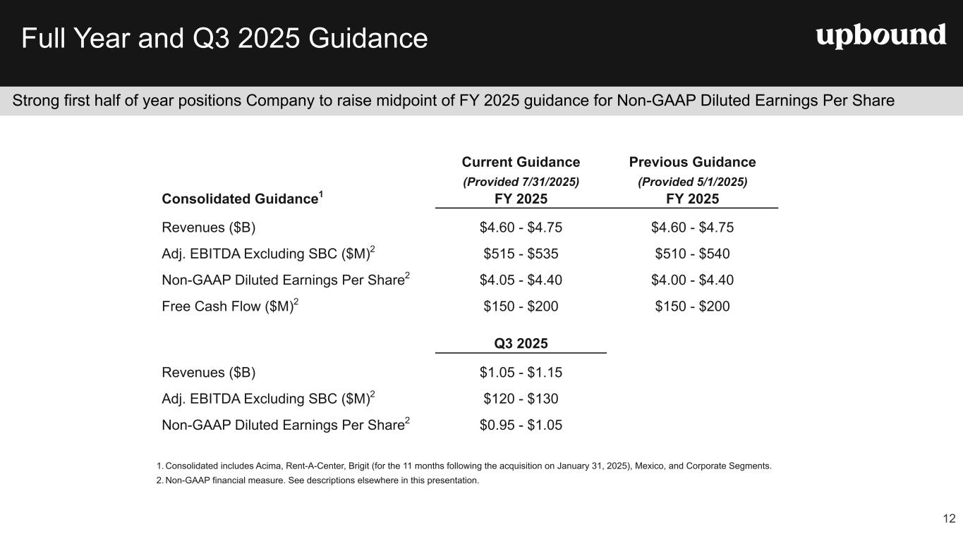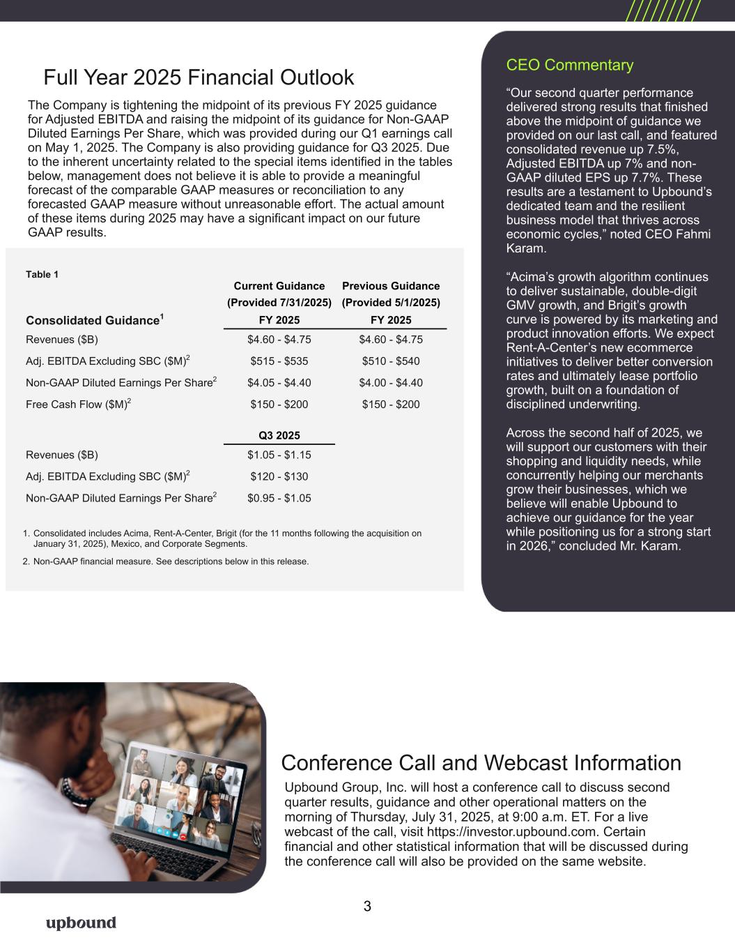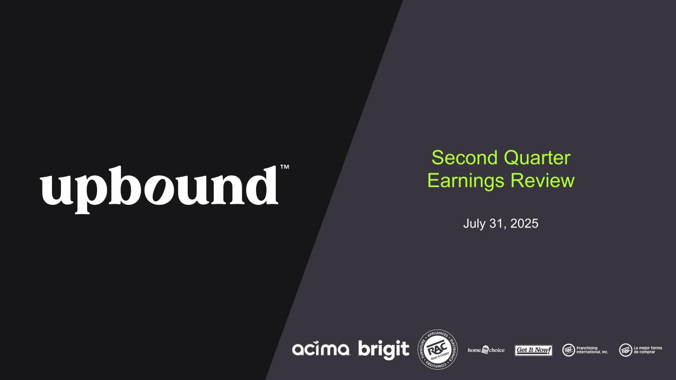 Full Year 2025 Financial Outlook The Company is tightening the midpoint of its previous FY 2025 guidance for Adjusted EBITDA and raising the midpoint of its guidance for Non-GAAP Diluted Earnings Per Share, which was provided during our Q1 earnings call on May 1, 2025. The Company is also providing guidance for Q3 2025. Due to the inherent uncertainty related to the special items identified in the tables below, management does not believe it is able to provide a meaningful forecast of the comparable GAAP measures or reconciliation to any forecasted GAAP measure without unreasonable effort. The actual amount of these items during 2025 may have a significant impact on our future GAAP results. Conference Call and Webcast Information Upbound Group, Inc. will host a conference call to discuss second quarter results, guidance and other operational matters on the morning of Thursday, July 31, 2025, at 9:00 a.m. ET. For a live webcast of the call, visit https://investor.upbound.com. Certain financial and other statistical information that will be discussed during the conference call will also be provided on the same website. 1. Consolidated includes Acima, Rent-A-Center, Brigit (for the 11 months following the acquisition on January 31, 2025), Mexico, and Corporate Segments. 2. Non-GAAP financial measure. See descriptions below in this release. CEO Commentary “Our second quarter performance delivered strong results that finished above the midpoint of guidance we provided on our last call, and featured consolidated revenue up 7.5%, Adjusted EBITDA up 7% and non- GAAP diluted EPS up 7.7%. These results are a testament to Upbound’s dedicated team and the resilient business model that thrives across economic cycles,” noted CEO Fahmi Karam. “Acima’s growth algorithm continues to deliver sustainable, double-digit GMV growth, and Brigit’s growth curve is powered by its marketing and product innovation efforts. We expect Rent-A-Center’s new ecommerce initiatives to deliver better conversion rates and ultimately lease portfolio growth, built on a foundation of disciplined underwriting. Across the second half of 2025, we will support our customers with their shopping and liquidity needs, while concurrently helping our merchants grow their businesses, which we believe will enable Upbound to achieve our guidance for the year while positioning us for a strong start in 2026,” concluded Mr. Karam. 3 Table 1 Current Guidance Previous Guidance (Provided 7/31/2025) (Provided 5/1/2025) Consolidated Guidance1 FY 2025 FY 2025 Revenues ($B) $4.60 - $4.75 $4.60 - $4.75 Adj. EBITDA Excluding SBC ($M)2 $515 - $535 $510 - $540 Non-GAAP Diluted Earnings Per Share2 $4.05 - $4.40 $4.00 - $4.40 Free Cash Flow ($M)2 $150 - $200 $150 - $200 Q3 2025 Revenues ($B) $1.05 - $1.15 Adj. EBITDA Excluding SBC ($M)2 $120 - $130 Non-GAAP Diluted Earnings Per Share2 $0.95 - $1.05