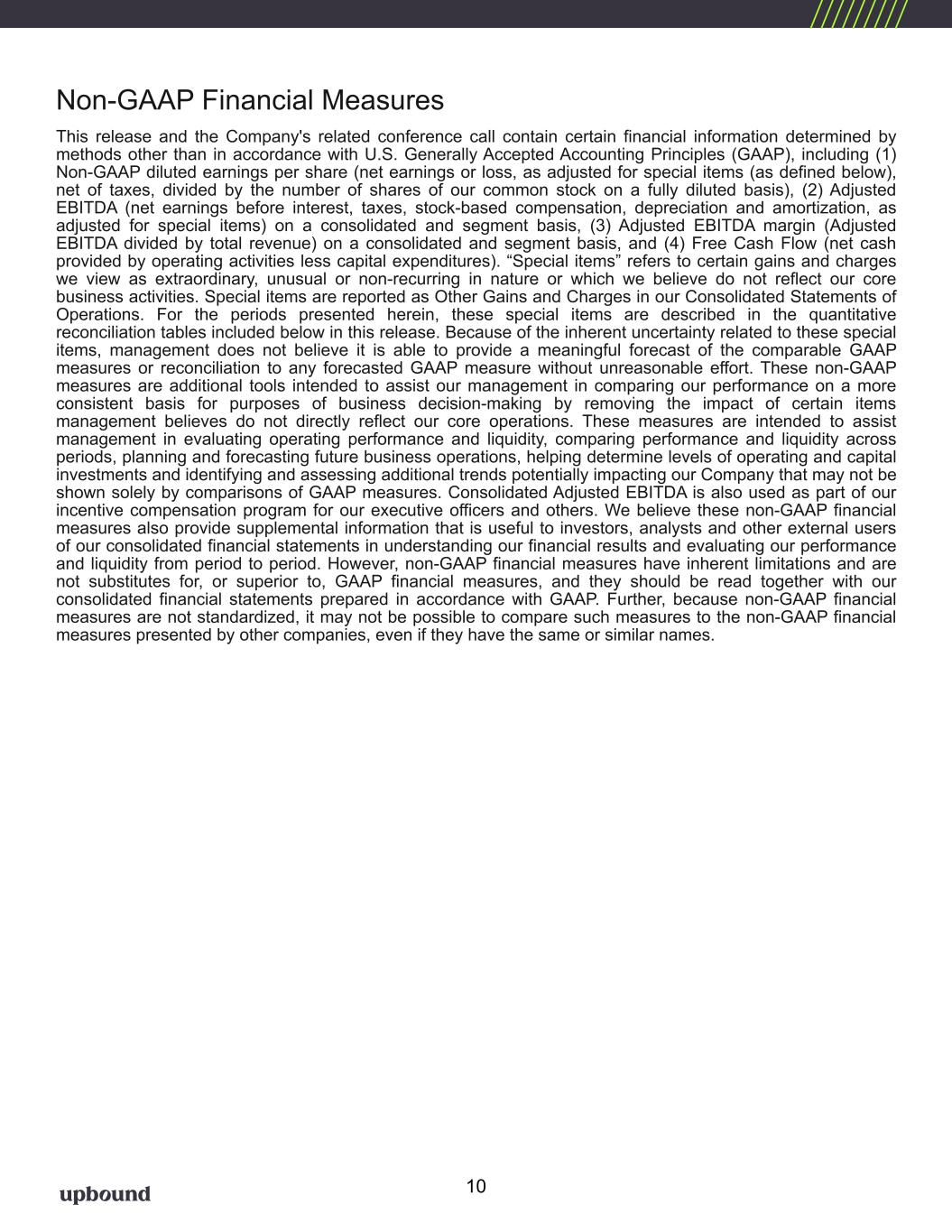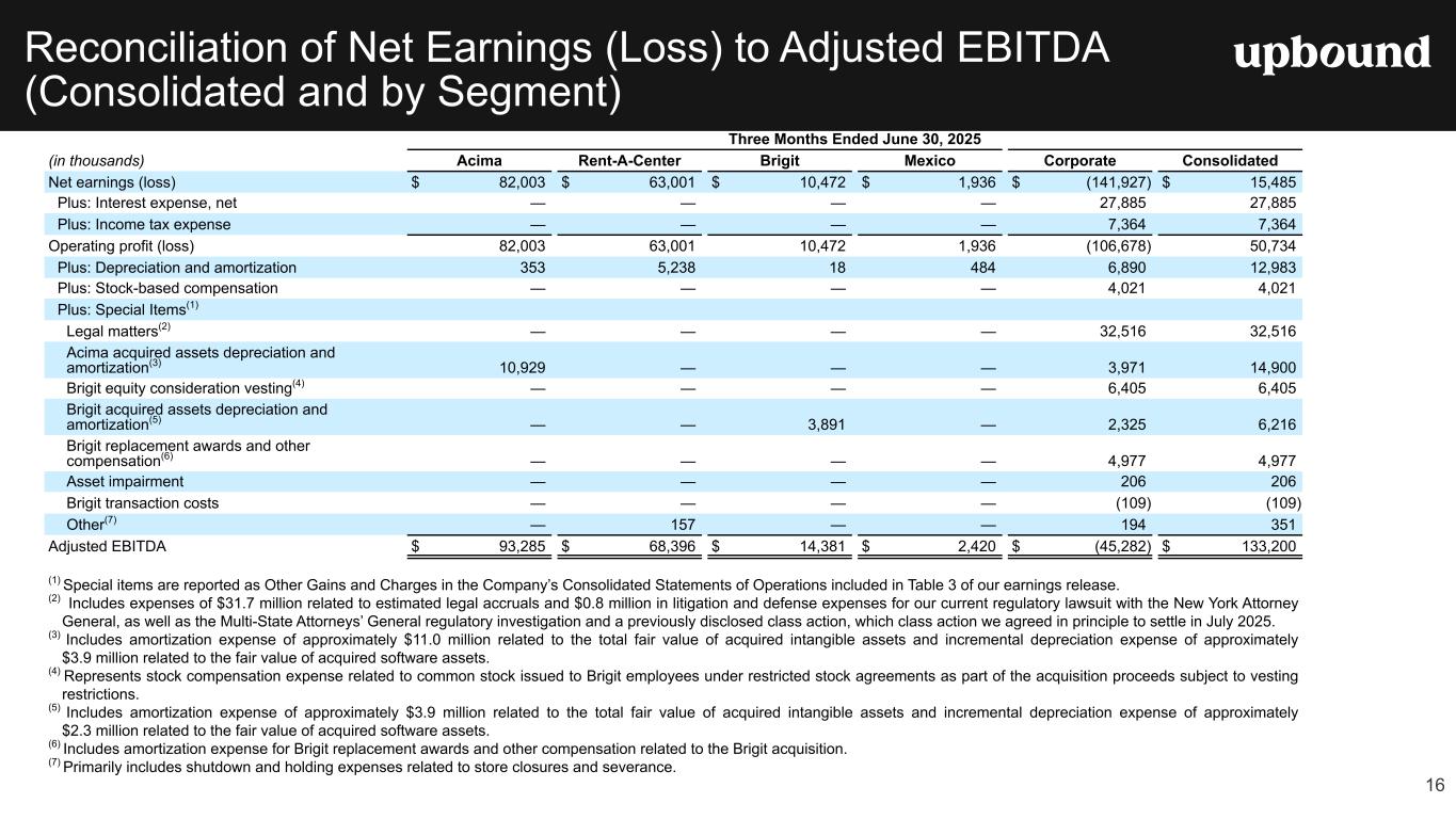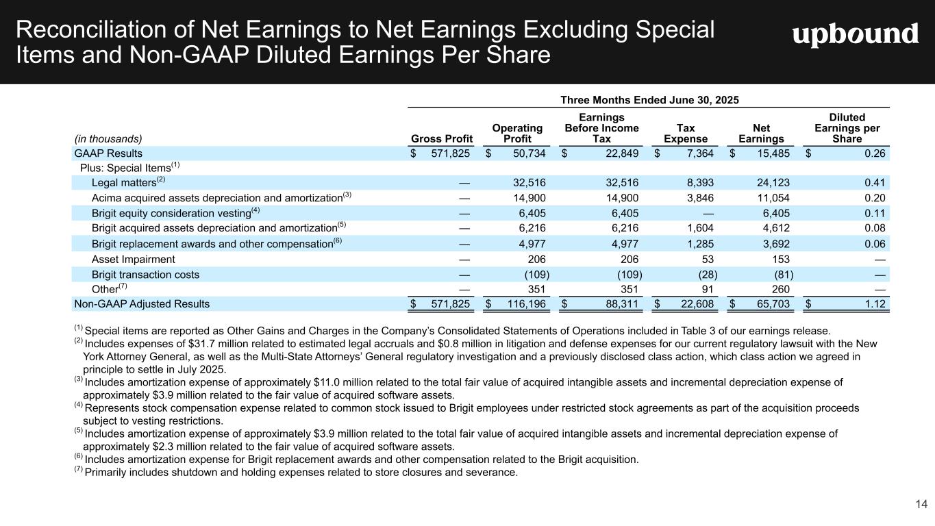 Full Year 2025 Financial Outlook The Company is tightening the midpoint of its previous FY 2025 guidance for Adjusted EBITDA and raising the midpoint of its guidance for Non-GAAP Diluted Earnings Per Share, which was provided during our Q1 earnings call on May 1, 2025. The Company is also providing guidance for Q3 2025. Due to the inherent uncertainty related to the special items identified in the tables below, management does not believe it is able to provide a meaningful forecast of the comparable GAAP measures or reconciliation to any forecasted GAAP measure without unreasonable effort. The actual amount of these items during 2025 may have a significant impact on our future GAAP results. Conference Call and Webcast Information Upbound Group, Inc. will host a conference call to discuss second quarter results, guidance and other operational matters on the morning of Thursday, July 31, 2025, at 9:00 a.m. ET. For a live webcast of the call, visit https://investor.upbound.com. Certain financial and other statistical information that will be discussed during the conference call will also be provided on the same website. 1. Consolidated includes Acima, Rent-A-Center, Brigit (for the 11 months following the acquisition on January 31, 2025), Mexico, and Corporate Segments. 2. Non-GAAP financial measure. See descriptions below in this release. CEO Commentary “Our second quarter performance delivered strong results that finished above the midpoint of guidance we provided on our last call, and featured consolidated revenue up 7.5%, Adjusted EBITDA up 7% and non- GAAP diluted EPS up 7.7%. These results are a testament to Upbound’s dedicated team and the resilient business model that thrives across economic cycles,” noted CEO Fahmi Karam. “Acima’s growth algorithm continues to deliver sustainable, double-digit GMV growth, and Brigit’s growth curve is powered by its marketing and product innovation efforts. We expect Rent-A-Center’s new ecommerce initiatives to deliver better conversion rates and ultimately lease portfolio growth, built on a foundation of disciplined underwriting. Across the second half of 2025, we will support our customers with their shopping and liquidity needs, while concurrently helping our merchants grow their businesses, which we believe will enable Upbound to achieve our guidance for the year while positioning us for a strong start in 2026,” concluded Mr. Karam. 3 Table 1 Current Guidance Previous Guidance (Provided 7/31/2025) (Provided 5/1/2025) Consolidated Guidance1 FY 2025 FY 2025 Revenues ($B) $4.60 - $4.75 $4.60 - $4.75 Adj. EBITDA Excluding SBC ($M)2 $515 - $535 $510 - $540 Non-GAAP Diluted Earnings Per Share2 $4.05 - $4.40 $4.00 - $4.40 Free Cash Flow ($M)2 $150 - $200 $150 - $200 Q3 2025 Revenues ($B) $1.05 - $1.15 Adj. EBITDA Excluding SBC ($M)2 $120 - $130 Non-GAAP Diluted Earnings Per Share2 $0.95 - $1.05