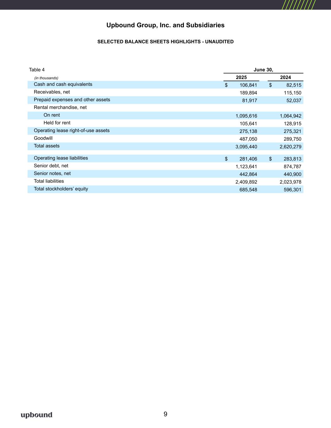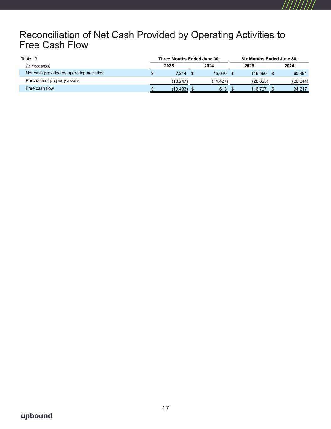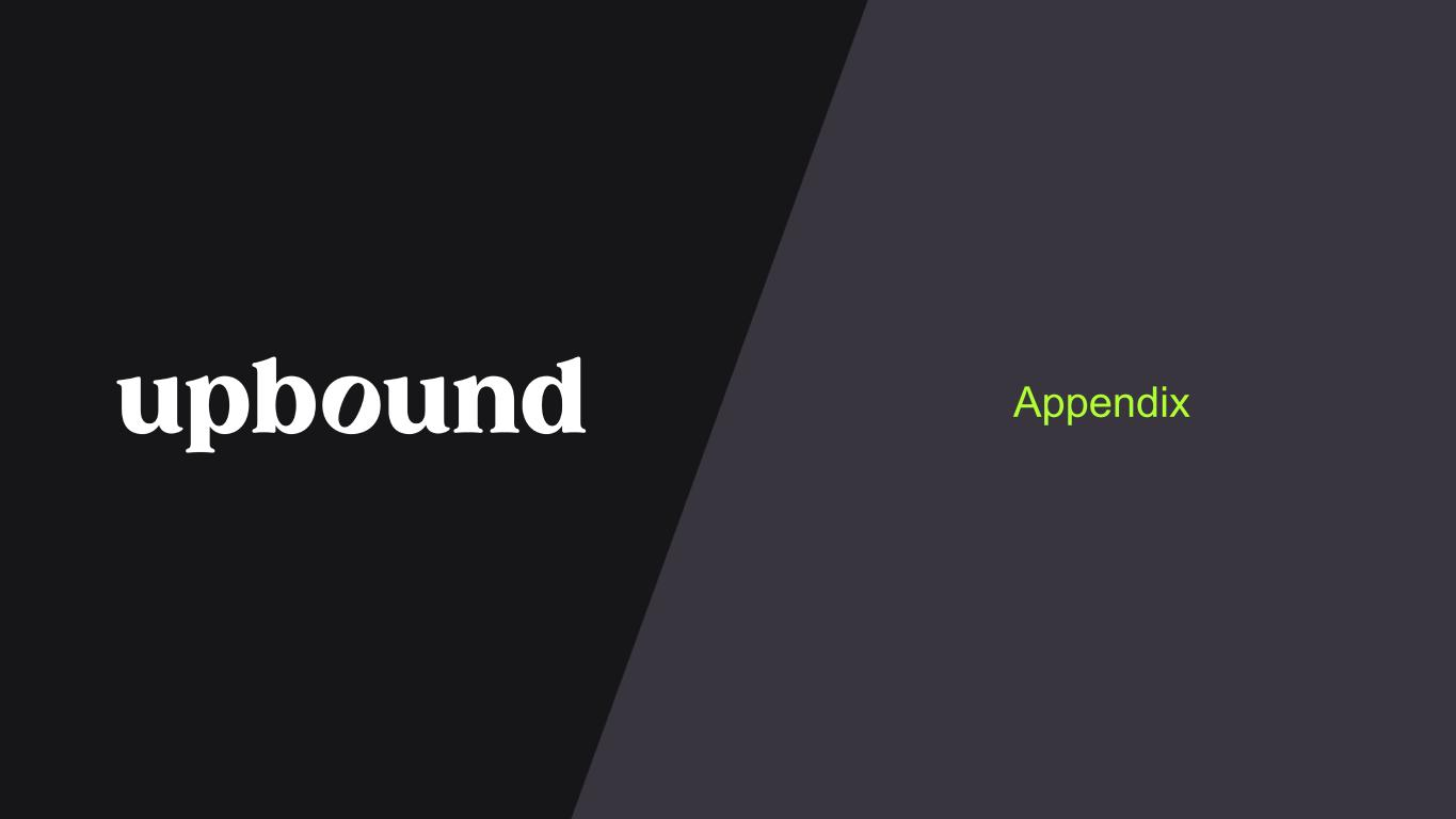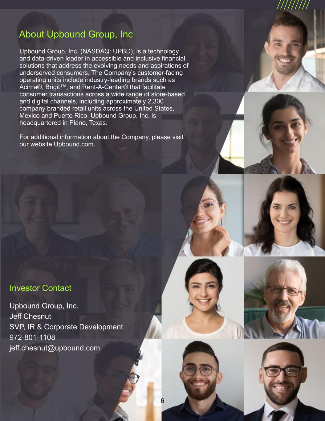 About Upbound Group, Inc Upbound Group, Inc. (NASDAQ: UPBD), is a technology and data-driven leader in accessible and inclusive financial solutions that address the evolving needs and aspirations of underserved consumers. The Company’s customer-facing operating units include industry-leading brands such as Acima®, Brigit™, and Rent-A-Center® that facilitate consumer transactions across a wide range of store-based and digital channels, including approximately 2,300 company branded retail units across the United States, Mexico and Puerto Rico. Upbound Group, Inc. is headquartered in Plano, Texas. For additional information about the Company, please visit our website Upbound.com. Investor Contact Upbound Group, Inc. Jeff Chesnut SVP, IR & Corporate Development 972-801-1108 jeff.chesnut@upbound.com 6