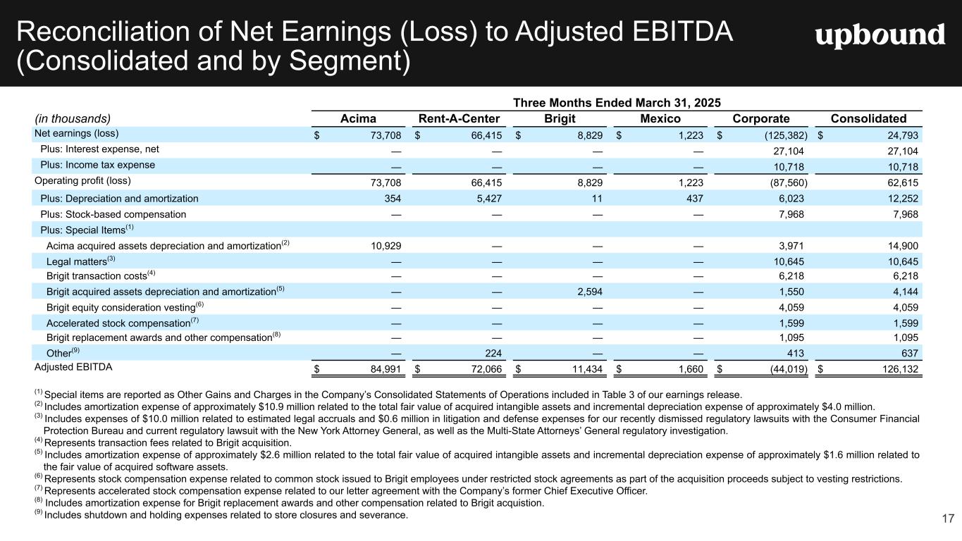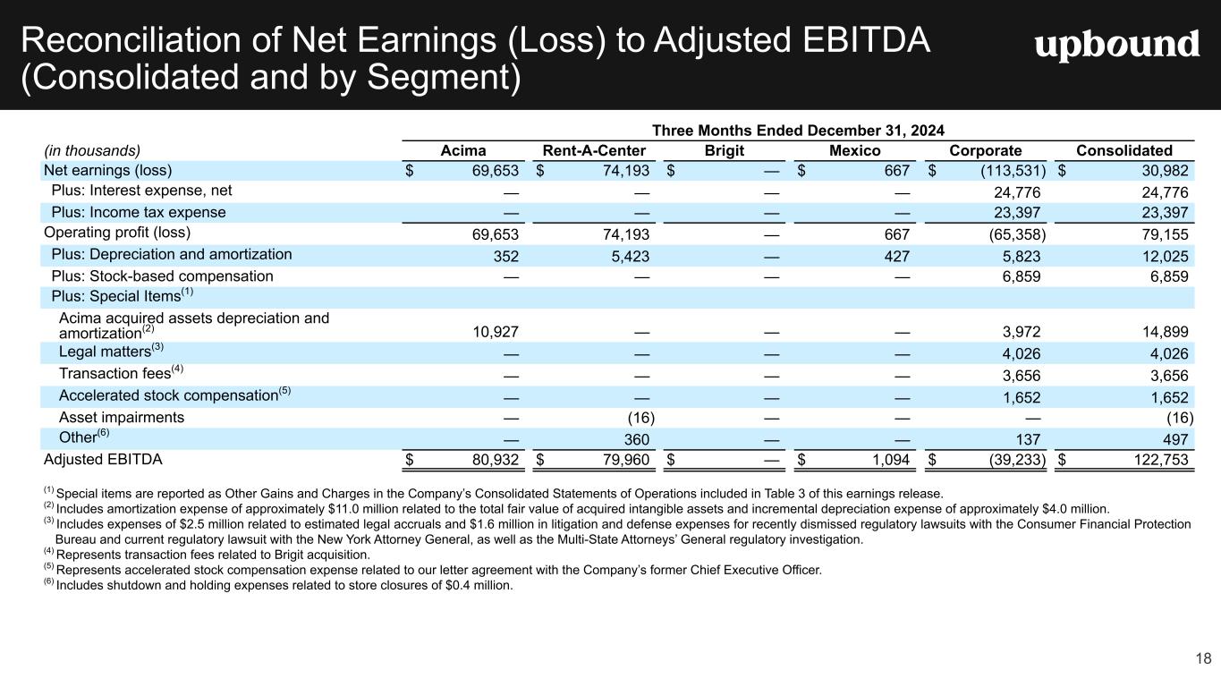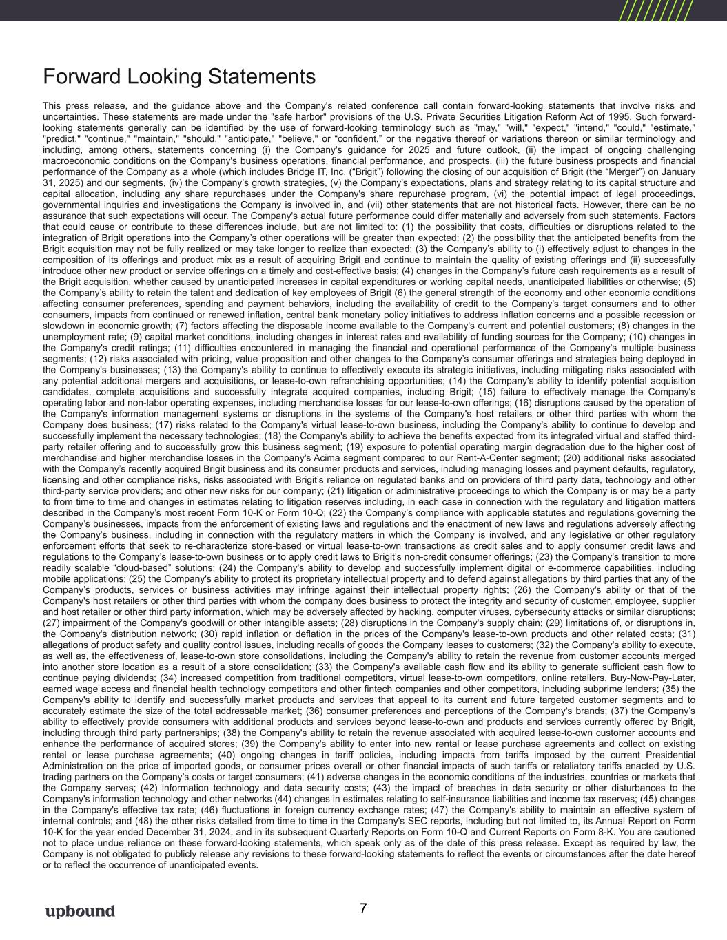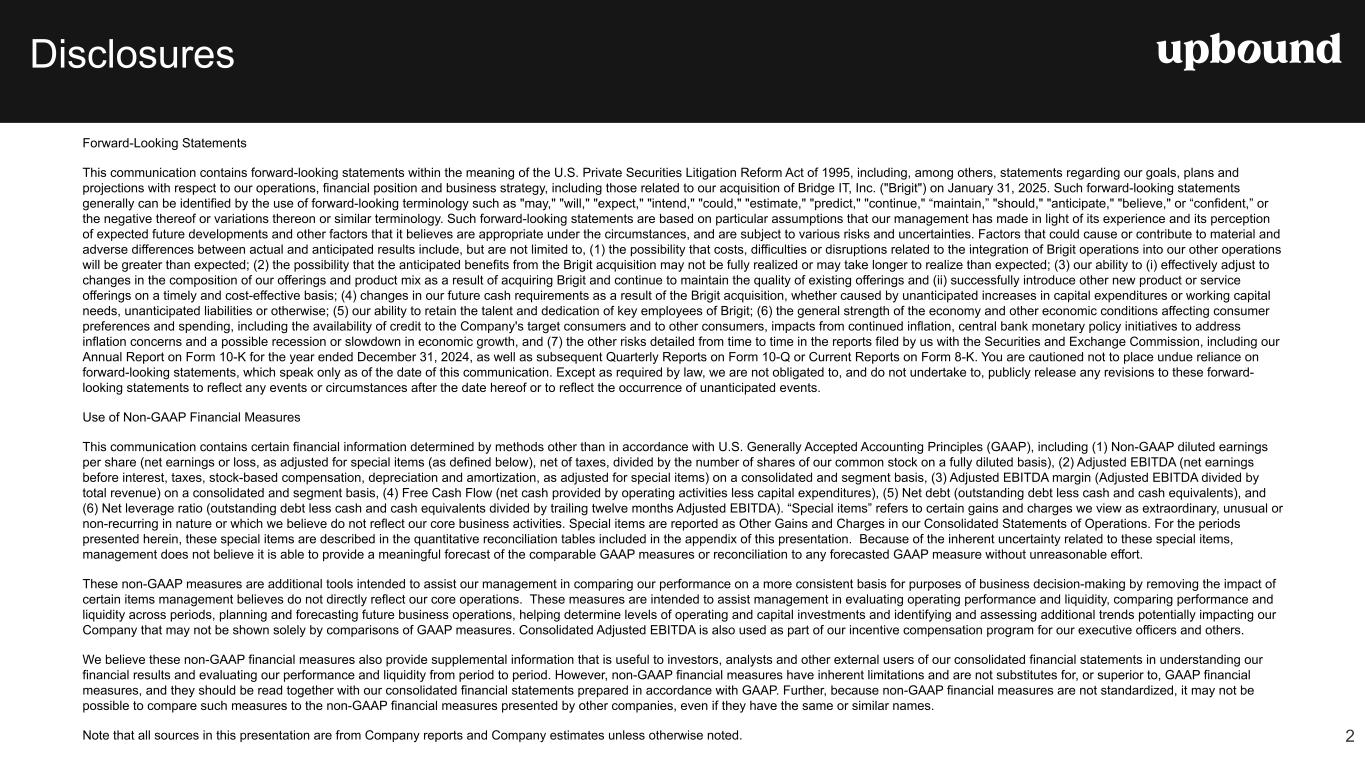 Forward Looking Statements This press release, and the guidance above and the Company's related conference call contain forward-looking statements that involve risks and uncertainties. These statements are made under the "safe harbor" provisions of the U.S. Private Securities Litigation Reform Act of 1995. Such forward- looking statements generally can be identified by the use of forward-looking terminology such as "may," "will," "expect," "intend," "could," "estimate," "predict," "continue," "maintain," "should," "anticipate," "believe," or “confident,” or the negative thereof or variations thereon or similar terminology and including, among others, statements concerning (i) the Company's guidance for 2025 and future outlook, (ii) the impact of ongoing challenging macroeconomic conditions on the Company's business operations, financial performance, and prospects, (iii) the future business prospects and financial performance of the Company as a whole (which includes Bridge IT, Inc. (“Brigit”) following the closing of our acquisition of Brigit (the “Merger”) on January 31, 2025) and our segments, (iv) the Company’s growth strategies, (v) the Company's expectations, plans and strategy relating to its capital structure and capital allocation, including any share repurchases under the Company's share repurchase program, (vi) the potential impact of legal proceedings, governmental inquiries and investigations the Company is involved in, and (vii) other statements that are not historical facts. However, there can be no assurance that such expectations will occur. The Company's actual future performance could differ materially and adversely from such statements. Factors that could cause or contribute to these differences include, but are not limited to: (1) the possibility that costs, difficulties or disruptions related to the integration of Brigit operations into the Company’s other operations will be greater than expected; (2) the possibility that the anticipated benefits from the Brigit acquisition may not be fully realized or may take longer to realize than expected; (3) the Company’s ability to (i) effectively adjust to changes in the composition of its offerings and product mix as a result of acquiring Brigit and continue to maintain the quality of existing offerings and (ii) successfully introduce other new product or service offerings on a timely and cost-effective basis; (4) changes in the Company’s future cash requirements as a result of the Brigit acquisition, whether caused by unanticipated increases in capital expenditures or working capital needs, unanticipated liabilities or otherwise; (5) the Company’s ability to retain the talent and dedication of key employees of Brigit (6) the general strength of the economy and other economic conditions affecting consumer preferences, spending and payment behaviors, including the availability of credit to the Company's target consumers and to other consumers, impacts from continued or renewed inflation, central bank monetary policy initiatives to address inflation concerns and a possible recession or slowdown in economic growth; (7) factors affecting the disposable income available to the Company's current and potential customers; (8) changes in the unemployment rate; (9) capital market conditions, including changes in interest rates and availability of funding sources for the Company; (10) changes in the Company's credit ratings; (11) difficulties encountered in managing the financial and operational performance of the Company's multiple business segments; (12) risks associated with pricing, value proposition and other changes to the Company’s consumer offerings and strategies being deployed in the Company's businesses; (13) the Company's ability to continue to effectively execute its strategic initiatives, including mitigating risks associated with any potential additional mergers and acquisitions, or lease-to-own refranchising opportunities; (14) the Company's ability to identify potential acquisition candidates, complete acquisitions and successfully integrate acquired companies, including Brigit; (15) failure to effectively manage the Company's operating labor and non-labor operating expenses, including merchandise losses for our lease-to-own offerings; (16) disruptions caused by the operation of the Company's information management systems or disruptions in the systems of the Company's host retailers or other third parties with whom the Company does business; (17) risks related to the Company's virtual lease-to-own business, including the Company's ability to continue to develop and successfully implement the necessary technologies; (18) the Company's ability to achieve the benefits expected from its integrated virtual and staffed third- party retailer offering and to successfully grow this business segment; (19) exposure to potential operating margin degradation due to the higher cost of merchandise and higher merchandise losses in the Company's Acima segment compared to our Rent-A-Center segment; (20) additional risks associated with the Company’s recently acquired Brigit business and its consumer products and services, including managing losses and payment defaults, regulatory, licensing and other compliance risks, risks associated with Brigit’s reliance on regulated banks and on providers of third party data, technology and other third-party service providers; and other new risks for our company; (21) litigation or administrative proceedings to which the Company is or may be a party to from time to time and changes in estimates relating to litigation reserves including, in each case in connection with the regulatory and litigation matters described in the Company’s most recent Form 10-K or Form 10-Q; (22) the Company’s compliance with applicable statutes and regulations governing the Company’s businesses, impacts from the enforcement of existing laws and regulations and the enactment of new laws an