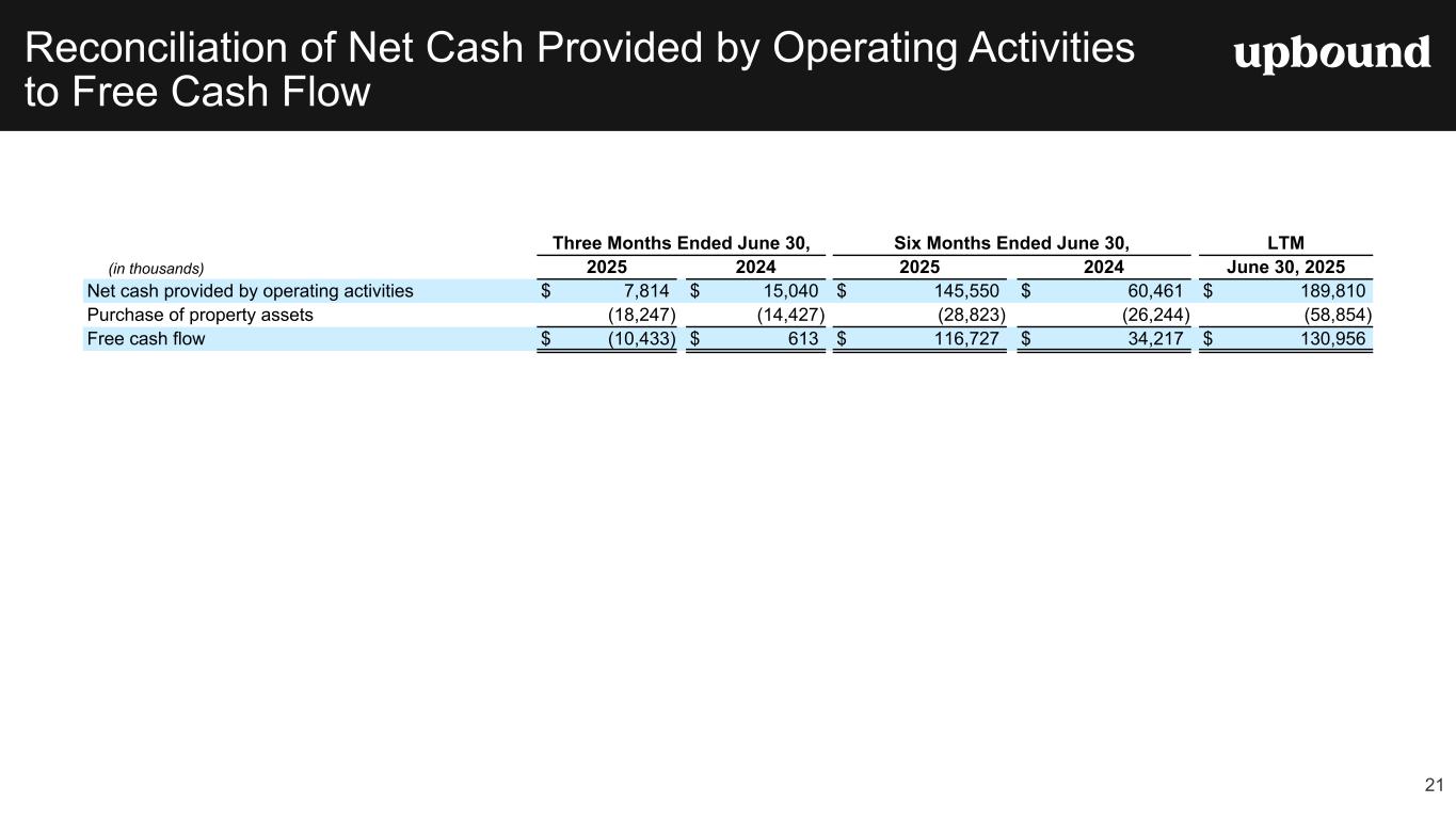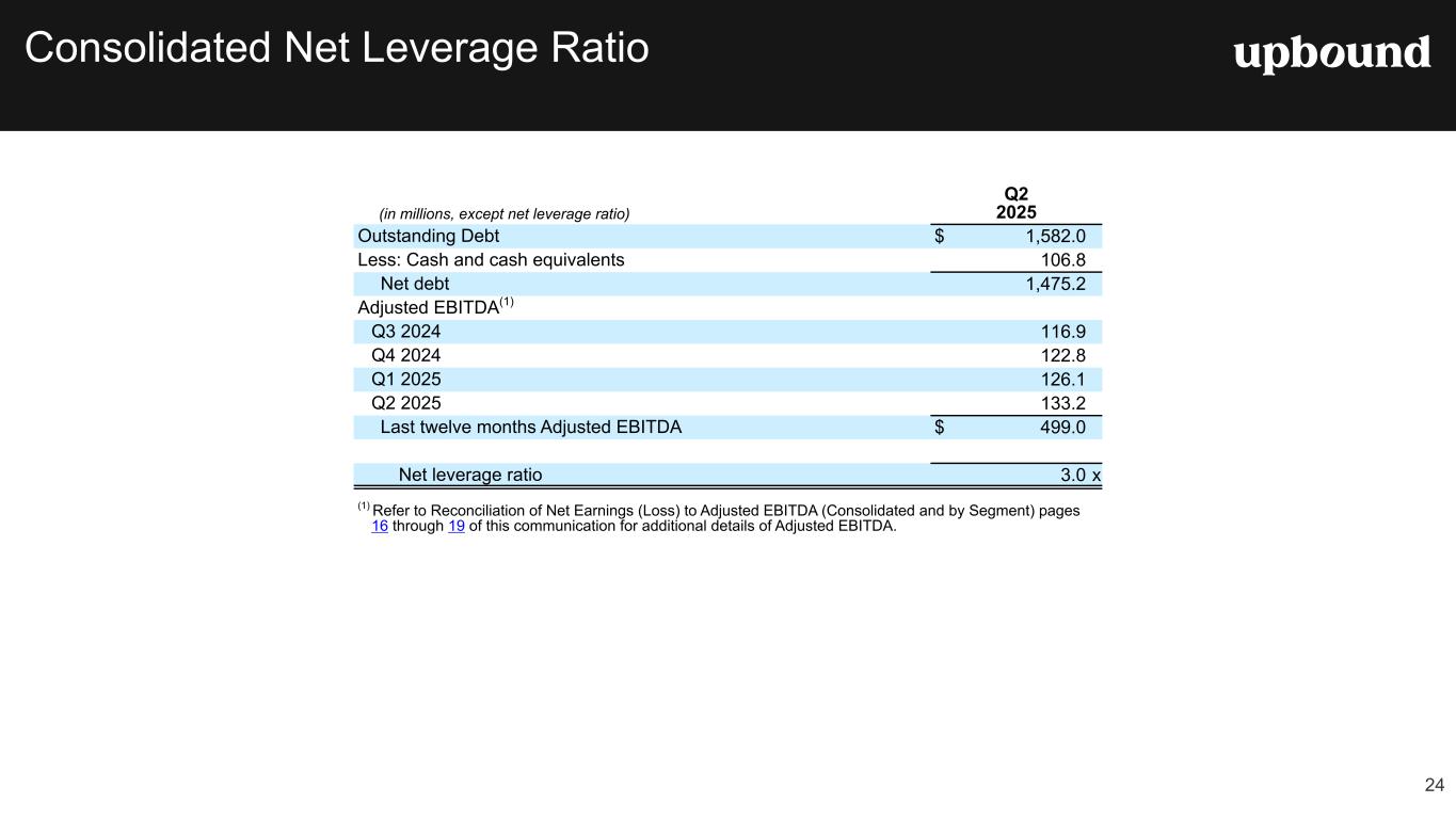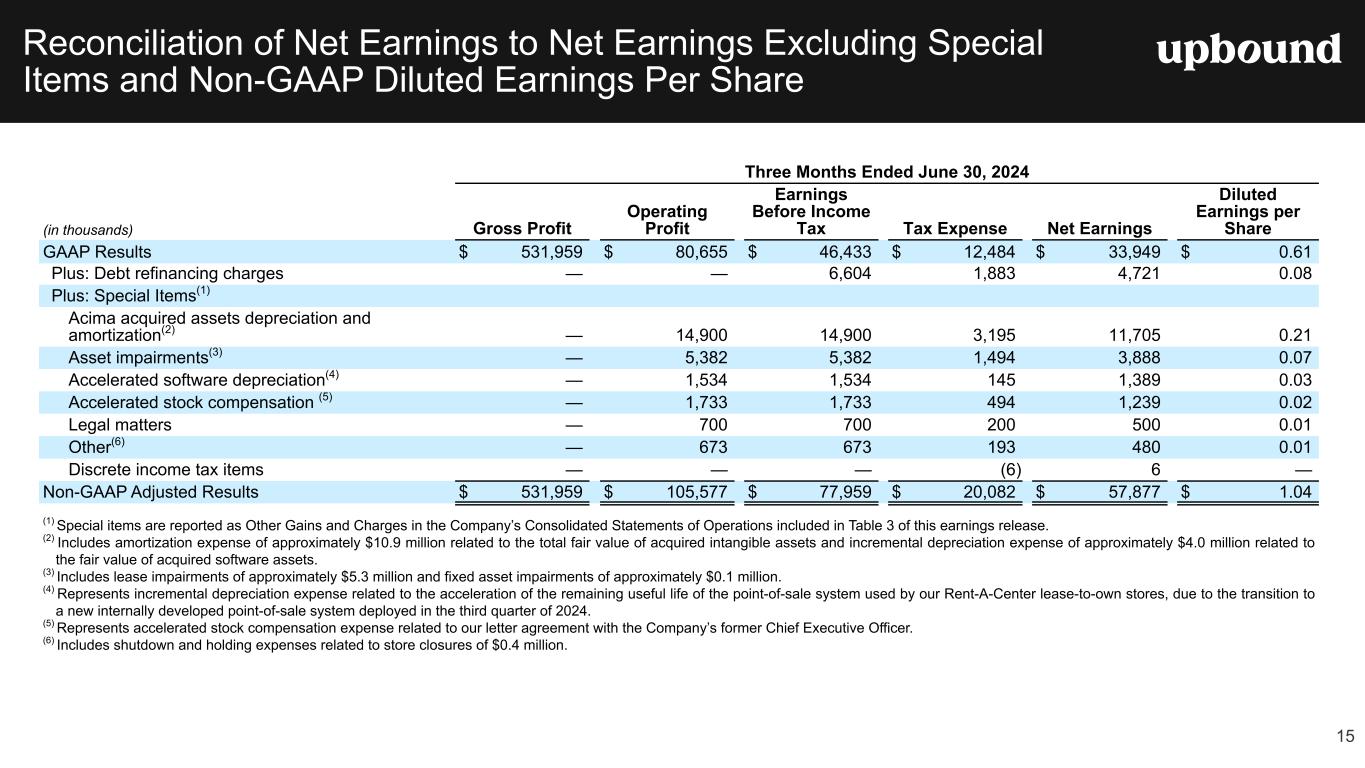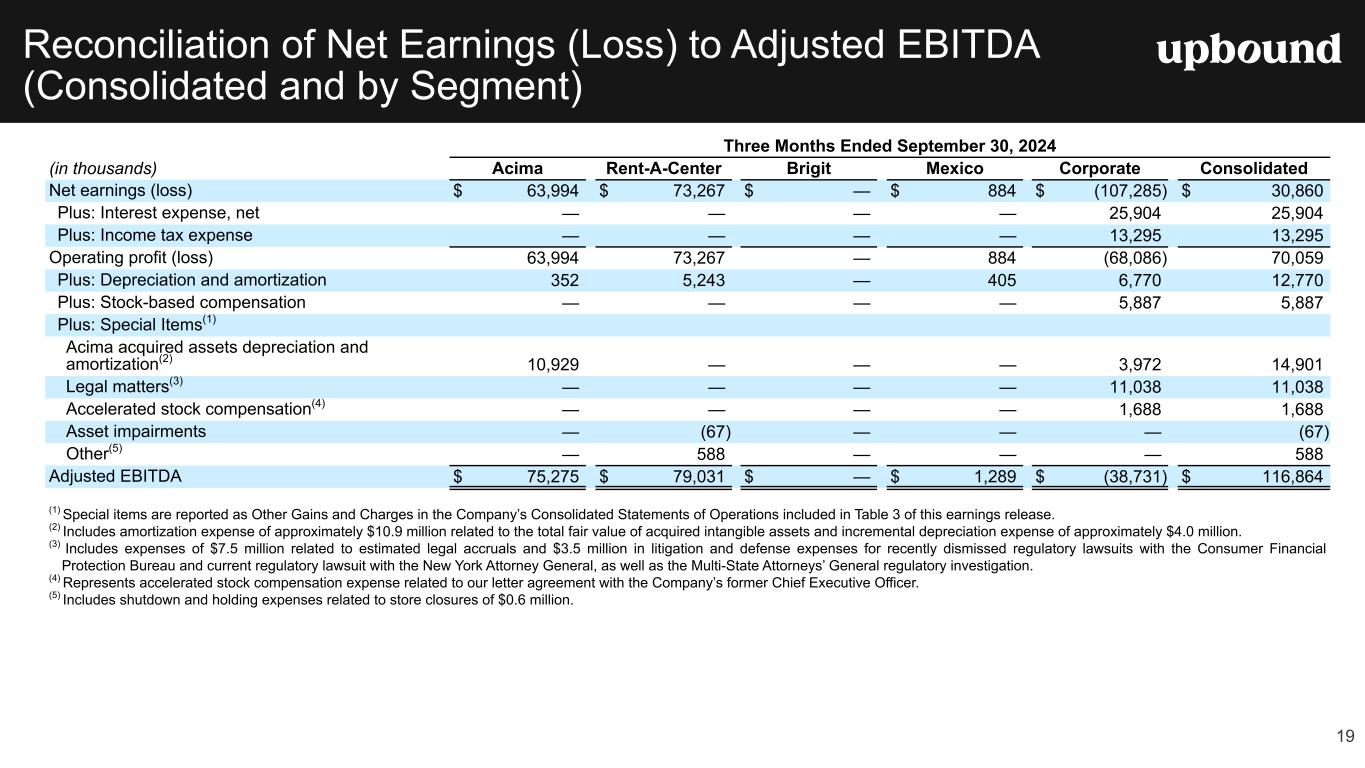 Forward Looking Statements This press release, and the guidance above and the Company's related conference call contain forward-looking statements that involve risks and uncertainties. These statements are made under the "safe harbor" provisions of the U.S. Private Securities Litigation Reform Act of 1995. Such forward- looking statements generally can be identified by the use of forward-looking terminology such as "may," "will," "expect," "intend," "could," "estimate," "predict," "continue," "maintain," "should," "anticipate," "believe," or “confident,” or the negative thereof or variations thereon or similar terminology and including, among others, statements concerning (i) the Company's guidance for 2025 and future outlook, (ii) the impact of ongoing challenging macroeconomic conditions on the Company's business operations, financial performance, and prospects, (iii) the future business prospects and financial performance of the Company as a whole (which includes Bridge IT, Inc. (“Brigit”) following the closing of our acquisition of Brigit (the “Merger”) on January 31, 2025) and our segments, (iv) the Company’s growth strategies, (v) the Company's expectations, plans and strategy relating to its capital structure and capital allocation, including any share repurchases under the Company's share repurchase program, (vi) the potential impact of legal proceedings, governmental inquiries and investigations the Company is involved in, and (vii) other statements that are not historical facts. However, there can be no assurance that such expectations will occur. The Company's actual future performance could differ materially and adversely from such statements. Factors that could cause or contribute to these differences include, but are not limited to: (1) the possibility that costs, difficulties or disruptions related to the integration of Brigit operations into the Company’s other operations will be greater than expected; (2) the possibility that the anticipated benefits from the Brigit acquisition may not be fully realized or may take longer to realize than expected; (3) the Company’s ability to (i) effectively adjust to changes in the composition of its offerings and product mix as a result of acquiring Brigit and continue to maintain the quality of existing offerings and (ii) successfully introduce other new product or service offerings on a timely and cost-effective basis; (4) changes in the Company’s future cash requirements as a result of the Brigit acquisition, whether caused by unanticipated increases in capital expenditures or working capital needs, unanticipated liabilities or otherwise; (5) the Company’s ability to retain the talent and dedication of key employees of Brigit (6) the general strength of the economy and other economic conditions affecting consumer preferences, spending and payment behaviors, including the availability of credit to the Company's target consumers and to other consumers, impacts from continued or renewed inflation, central bank monetary policy initiatives to address inflation concerns and a possible recession or slowdown in economic growth; (7) factors affecting the disposable income available to the Company's current and potential customers; (8) changes in the unemployment rate; (9) capital market conditions, including changes in interest rates and availability of funding sources for the Company; (10) changes in the Company's credit ratings; (11) difficulties encountered in managing the financial and operational performance of the Company's multiple business segments; (12) risks associated with pricing, value proposition and other changes to the Company’s consumer offerings and strategies being deployed in the Company's businesses; (13) the Company's ability to continue to effectively execute its strategic initiatives, including mitigating risks associated with any potential additional mergers and acquisitions, or lease-to-own refranchising opportunities; (14) the Company's ability to identify potential acquisition candidates, complete acquisitions and successfully integrate acquired companies, including Brigit; (15) failure to effectively manage the Company's operating labor and non-labor operating expenses, including merchandise losses for our lease-to-own offerings; (16) disruptions caused by the operation of the Company's information management systems or disruptions in the systems of the Company's host retailers or other third parties with whom the Company does business; (17) risks related to the Company's virtual lease-to-own business, including the Company's ability to continue to develop and successfully implement the necessary technologies; (18) the Company's ability to achieve the benefits expected from its integrated virtual and staffed third- party retailer offering and to successfully grow this business segment; (19) exposure to potential operating margin degradation due to the higher cost of merchandise and higher merchandise losses in the Company's Acima segment compared to our Rent-A-Center segment; (20) additional risks associated with the Company’s recently acquired Brigit business and its consumer products and services, including managing losses and payment defaults, regulatory, licensing and other compliance risks, risks associated with Brigit’s reliance on regulated banks and on providers of third party data, technology and other third-party service providers; and other new risks for our company; (21) litigation or administrative proceedings to which the Company is or may be a party to from time to time and changes in estimates relating to litigation reserves including, in each case in connection with the regulatory and litigation matters described in the Company’s most recent Form 10-K or Form 10-Q; (22) the Company’s compliance with applicable statutes and regulations governing the Company’s businesses, impacts from the enforcement of existing laws and regulations and the enactment of new laws an