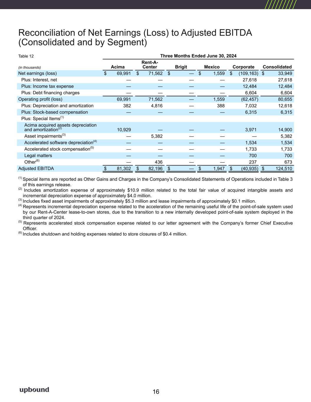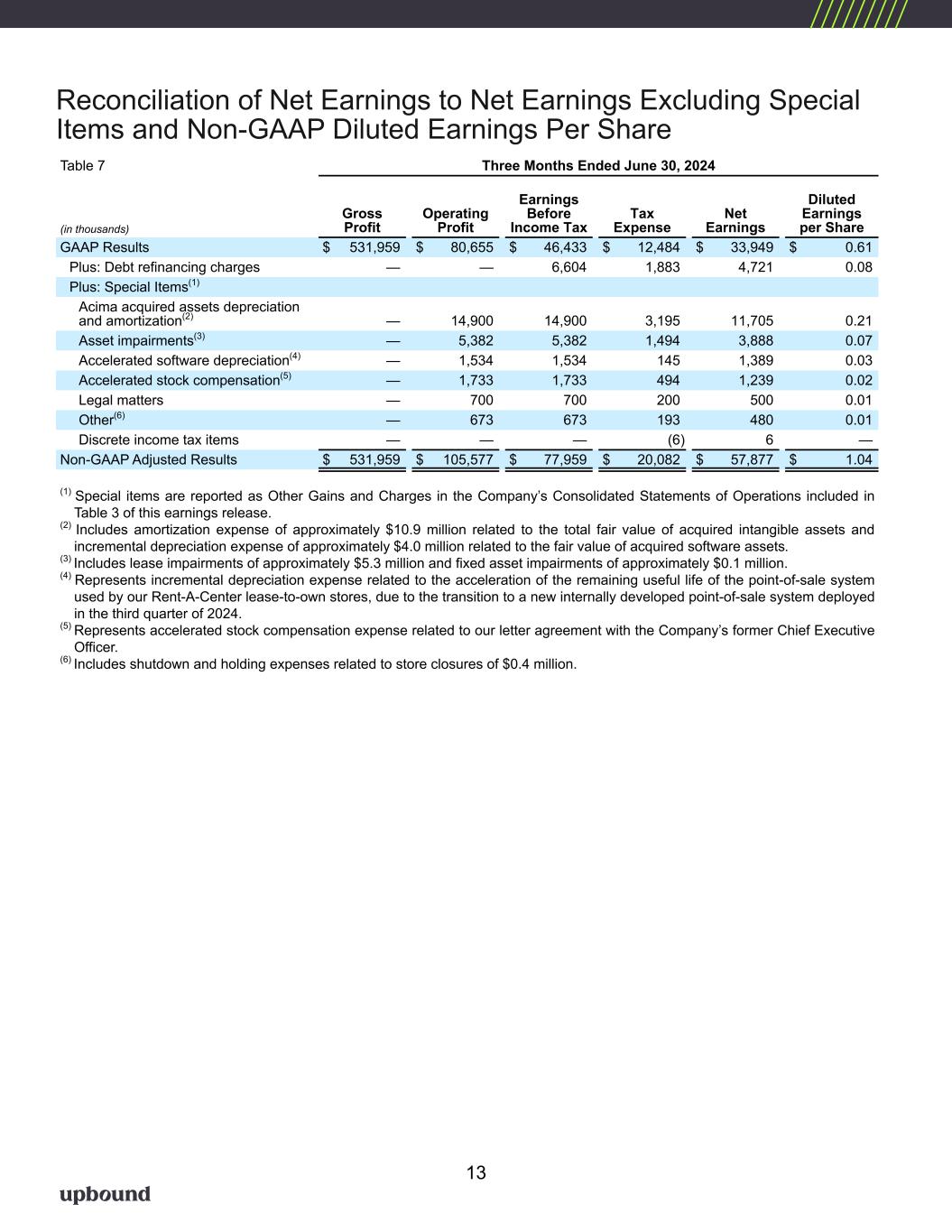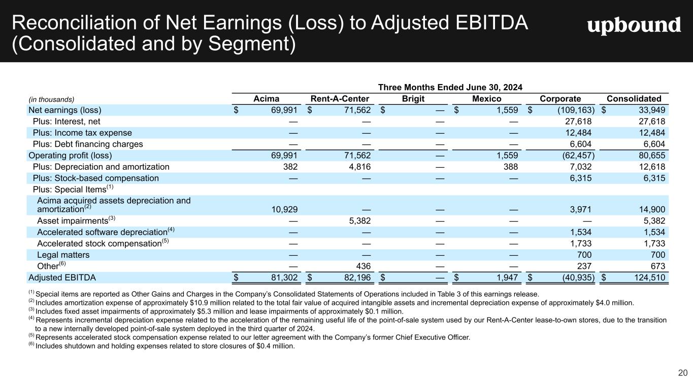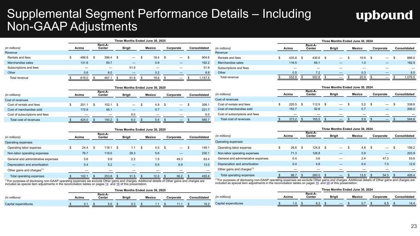 Forward Looking Statements This press release, and the guidance above and the Company's related conference call contain forward-looking statements that involve risks and uncertainties. These statements are made under the "safe harbor" provisions of the U.S. Private Securities Litigation Reform Act of 1995. Such forward- looking statements generally can be identified by the use of forward-looking terminology such as "may," "will," "expect," "intend," "could," "estimate," "predict," "continue," "maintain," "should," "anticipate," "believe," or “confident,” or the negative thereof or variations thereon or similar terminology and including, among others, statements concerning (i) the Company's guidance for 2025 and future outlook, (ii) the impact of ongoing challenging macroeconomic conditions on the Company's business operations, financial performance, and prospects, (iii) the future business prospects and financial performance of the Company as a whole (which includes Bridge IT, Inc. (“Brigit”) following the closing of our acquisition of Brigit (the “Merger”) on January 31, 2025) and our segments, (iv) the Company’s growth strategies, (v) the Company's expectations, plans and strategy relating to its capital structure and capital allocation, including any share repurchases under the Company's share repurchase program, (vi) the potential impact of legal proceedings, governmental inquiries and investigations the Company is involved in, and (vii) other statements that are not historical facts. However, there can be no assurance that such expectations will occur. The Company's actual future performance could differ materially and adversely from such statements. Factors that could cause or contribute to these differences include, but are not limited to: (1) the possibility that costs, difficulties or disruptions related to the integration of Brigit operations into the Company’s other operations will be greater than expected; (2) the possibility that the anticipated benefits from the Brigit acquisition may not be fully realized or may take longer to realize than expected; (3) the Company’s ability to (i) effectively adjust to changes in the composition of its offerings and product mix as a result of acquiring Brigit and continue to maintain the quality of existing offerings and (ii) successfully introduce other new product or service offerings on a timely and cost-effective basis; (4) changes in the Company’s future cash requirements as a result of the Brigit acquisition, whether caused by unanticipated increases in capital expenditures or working capital needs, unanticipated liabilities or otherwise; (5) the Company’s ability to retain the talent and dedication of key employees of Brigit (6) the general strength of the economy and other economic conditions affecting consumer preferences, spending and payment behaviors, including the availability of credit to the Company's target consumers and to other consumers, impacts from continued or renewed inflation, central bank monetary policy initiatives to address inflation concerns and a possible recession or slowdown in economic growth; (7) factors affecting the disposable income available to the Company's current and potential customers; (8) changes in the unemployment rate; (9) capital market conditions, including changes in interest rates and availability of funding sources for the Company; (10) changes in the Company's credit ratings; (11) difficulties encountered in managing the financial and operational performance of the Company's multiple business segments; (12) risks associated with pricing, value proposition and other changes to the Company’s consumer offerings and strategies being deployed in the Company's businesses; (13) the Company's ability to continue to effectively execute its strategic initiatives, including mitigating risks associated with any potential additional mergers and acquisitions, or lease-to-own refranchising opportunities; (14) the Company's ability to identify potential acquisition candidates, complete acquisitions and successfully integrate acquired companies, including Brigit; (15) failure to effectively manage the Company's operating labor and non-labor operating expenses, including merchandise losses for our lease-to-own offerings; (16) disruptions caused by the operation of the Company's information management systems or disruptions in the systems of the Company's host retailers or other third parties with whom the Company does business; (17) risks related to the Company's virtual lease-to-own business, including the Company's ability to continue to develop and successfully implement the necessary technologies; (18) the Company's ability to achieve the benefits expected from its integrated virtual and staffed third- party retailer offering and to successfully grow this business segment; (19) exposure to potential operating margin degradation due to the higher cost of merchandise and higher merchandise losses in the Company's Acima segment compared to our Rent-A-Center segment; (20) additional risks associated with the Company’s recently acquired Brigit business and its consumer products and services, including managing losses and payment defaults, regulatory, licensing and other compliance risks, risks associated with Brigit’s reliance on regulated banks and on providers of third party data, technology and other third-party service providers; and other new risks for our company; (21) litigation or administrative proceedings to which the Company is or may be a party to from time to time and changes in estimates relating to litigation reserves including, in each case in connection with the regulatory and litigation matters described in the Company’s most recent Form 10-K or Form 10-Q; (22) the Company’s compliance with applicable statutes and regulations governing the Company’s businesses, impacts from the enforcement of existing laws and regulations and the enactment of new laws an