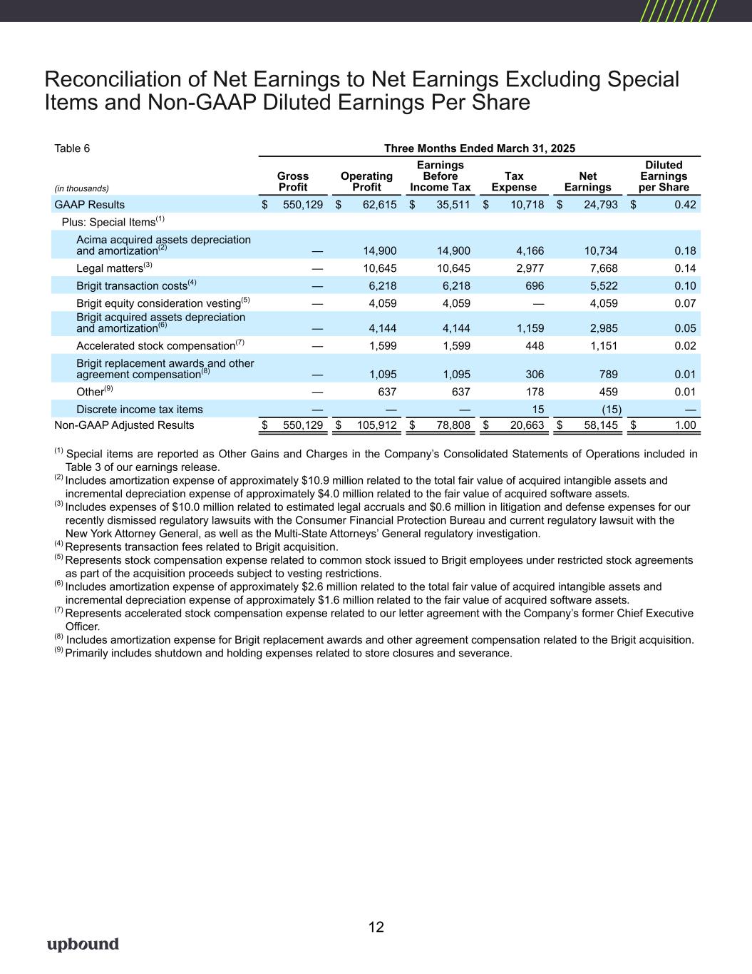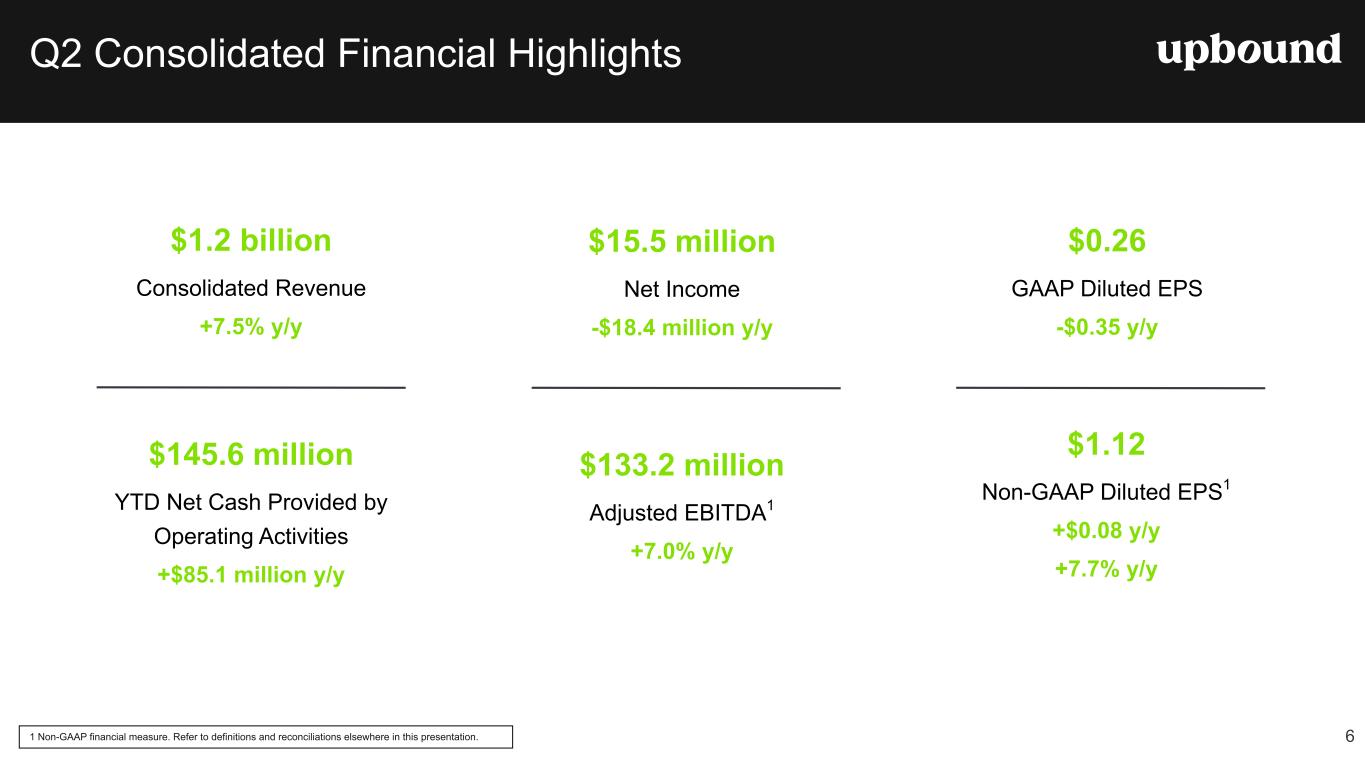 Financial Highlights (continued) (1) Non-GAAP financial measure. Refer to the explanations and reconciliations elsewhere in this release. (2) Gross Merchandise Volume (GMV): The Company defines Gross Merchandise Volume as the retail value in U.S. dollars of merchandise acquired by the Acima segment that is leased to customers through a transaction that occurs within a defined period, net of estimated cancellations as of the measurement date. (3) Lease Charge-Offs (LCOs): Represents charge-offs of the net book value of unrecoverable on-rent merchandise with lease-to-own customers who are past due. This is typically expressed as a percentage of revenues for the applicable period. For the Rent-A-Center segment, LCOs exclude Get It Now, Home Choice, and Franchise-owned Rent-A-Center locations. (4) 60+ Day Past Due Rate: Defined as the average number of accounts 60+ days past due as a % of total open leases. (5) Upbound acquired Brigit on January 31, 2025. (6) Cash Advance Volume: Defined as total advance originations during the period. (7) Brigit Paying Users: Represents Brigit customers who have an active Plus or Premium account, not delinquent (not 45 days past due) on a cash advance, and made at least 1 of the last 2 subscription payments. (8) ARPU: Average monthly revenue per user, where user is defined as in footnote 7 above. (9) Net Advance Loss: Represents charge-offs of customer cash advances that are 45+ days past due as a percentage of total cash advances originated in the period. (10) Lease Portfolio Value: Represents the aggregate dollar value of the expected monthly rental income associated with current active lease agreements from our Company-owned Rent-A-Center lease-to-own stores and e-commerce platform at the end of any given period. (11) Same Store Lease Portfolio Value: Represents the aggregate dollar value of the expected monthly rental income associated with current active lease agreements from our Company-owned Rent-A-Center lease-to-own stores that were operated by us for 13 months or more at the end of any given period. The Company excludes from the same store base any store that receives a certain level of customer accounts from closed stores or acquisitions. The receiving store will be eligible for inclusion in the same store base in the 30th full month following account transfer. (12) Same Store Sales (SSS): Same store sales generally represents revenue earned in Company-owned Rent-A-Center stores that were operated by us for 13 months or more and are reported on a constant currency basis as a percentage of total revenue earned in stores of the segment during the indicated period. The Company excludes from the same store sales base any store that receives a certain level of customer accounts from closed stores or acquisitions. The receiving store will be eligible for inclusion in the same store sales base in the 30th full month following account transfer. (13) 30+ Day Past Due Rate: Defined as the average number of accounts 30+ days past due as a % of total open leases for our Company-owned Rent-A-Center locations. 5
