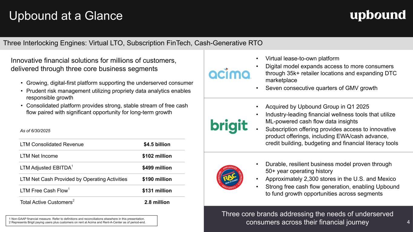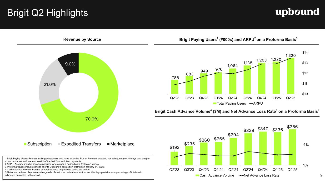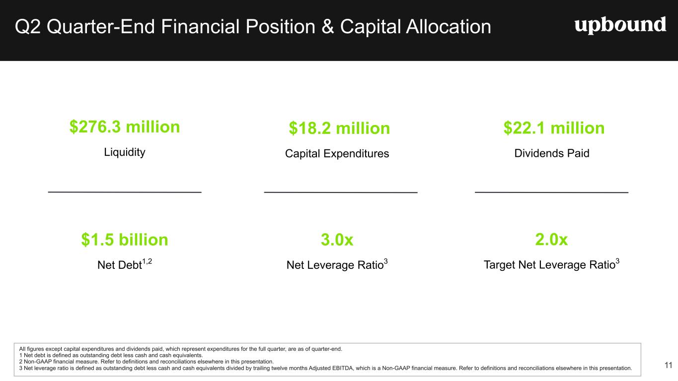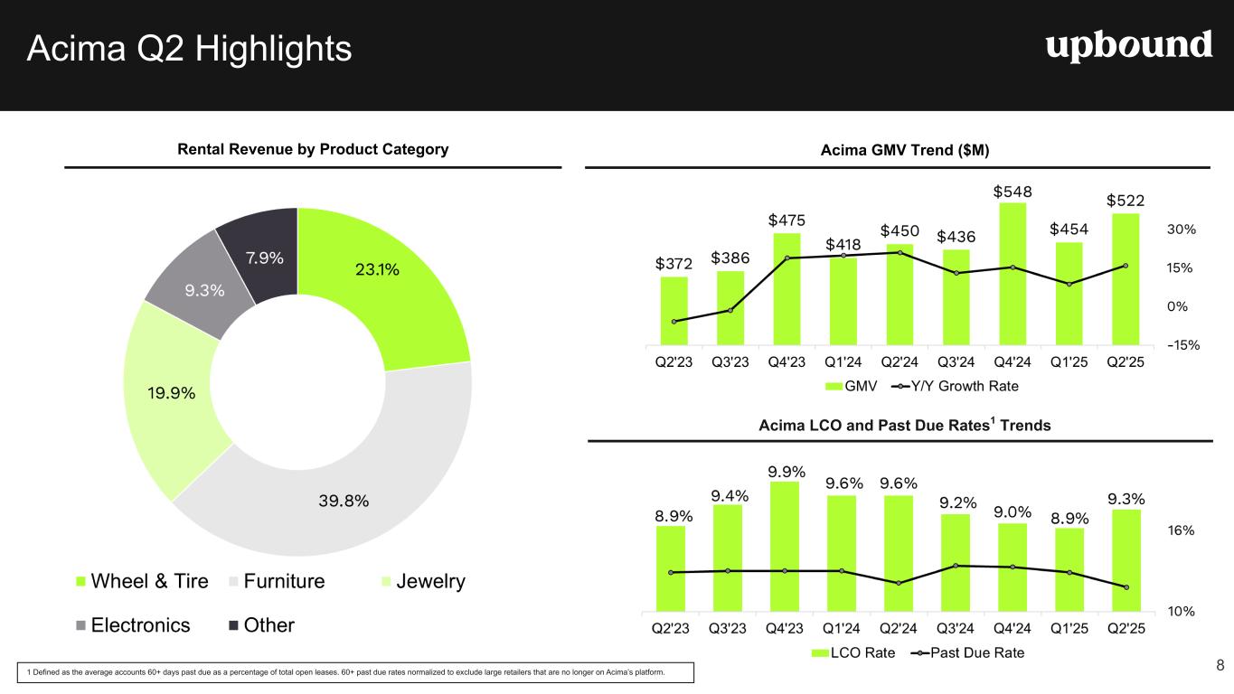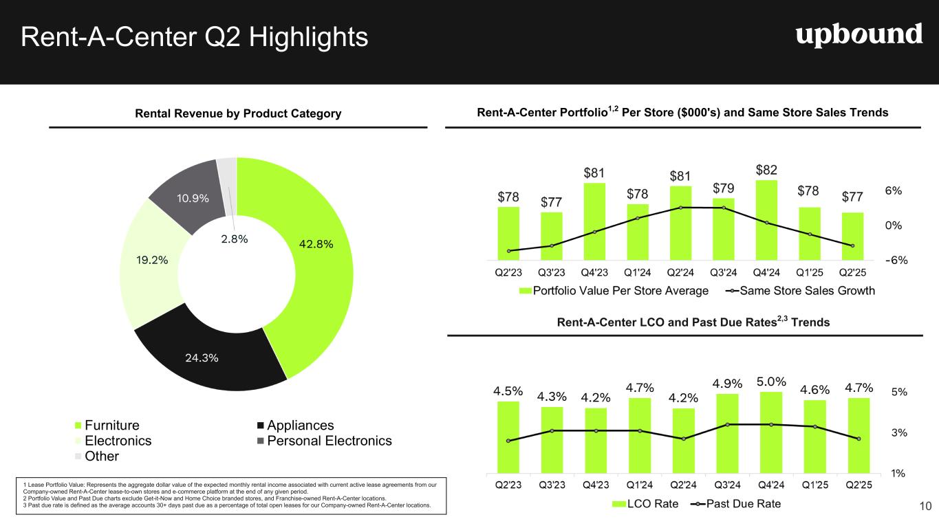 LCO Rate Second Quarter Highlights $619.0M +12.0% y/y Revenue YoY Increase$82.0M +17.1% y/y • Applications increased nearly 20% y/y in the second quarter. • GMV from the Acima direct-to-consumer marketplace grew over 130% y/y in the second quarter. • GMV increased 16.0% y/y, due primarily to an increase in existing retailer productivity and new merchants, increased applications, and our expanding direct-to-consumer offerings. • Net earnings margin of 13.2% and Adjusted EBITDA margin of 15.1% increased 50 bps and 40 bps y/y, respectively. Increases were driven by lower operating expenses as a percentage of revenue, in addition to lower lease-charge off rates. Total Revenue Net Earnings 9.3% -30 bps y/y $93.3M +14.7% y/y LCO Rate Adjusted EBITDA1 $467.1M -7.1% y/y Revenue YoY Increase 67.9% +80 bps y/y • Revenues of $467.1M decreased 7.1% y/y, due primarily to a reduction in company-owned store count and lower deliveries. • Company-owned same store sales decreased 4.0% y/y. • Net earnings of $63.0M and Adjusted EBITDA of $68.4M decreased $8.6M and $13.8M y/y, respectively, due primarily to lower revenue and relatively fixed operating costs, offset partially by higher gross margins. • Lease charge-offs (LCO) for company-owned Rent-A-Center stores were 4.7%, roughly flat sequentially, increasing 10 bps. • Rent-A-Center segment financials now include all franchised locations, which had been reported separately prior to Q1 2025. Total Revenue Gross Profit Margin 4.7% +50 bps y/y -4.0% y/y Same Store Sales $51.9M +39.3% y/y $13.45 +12.5% y/y • Highly efficient, scalable tech platform drives more than $1.5M in annualized revenue per full-time employee.2 • Average monthly revenue per user (ARPU) increased 12.5 % year- over-year, driven by higher expedited transfer revenue, deeper engagement with marketplace offers, and a continued shift toward the Premium tier. • Paying subscribers increased 24.1% y/y. • Net earnings of $10.5M with a margin of 20.2%, and Adjusted EBITDA of $14.4M with an Adjusted EBITDA margin of 27.7%. • Cash advance volume increased 21.1% y/y, or $62.0M, to $356.1M. Total Revenue ARPU 2.6% +20 bps y/y $356.1M +21.1% y/y Net Advance Loss Rate Cash Advance Volume $19.6M +6.5% on a constant currency basis • Segment net earnings, on a GAAP basis, and Adjusted EBITDA were approximately $1.9 million and $2.4 million, respectively. • As of June 30, 2025, the Mexico segment owned and operated 135 locations. Total Revenue YoY Increase 2 Note: Definitions of certain key performance metrics are available on page five of this release. (1) Non-GAAP financial measure. Refer to definitions and reconciliations elsewhere in this release. (2) Annualized revenue is calculated using Q2 revenue for the Brigit segment multiplied by four quarters. *Upbound acquired Brigit on January 31, 2025.