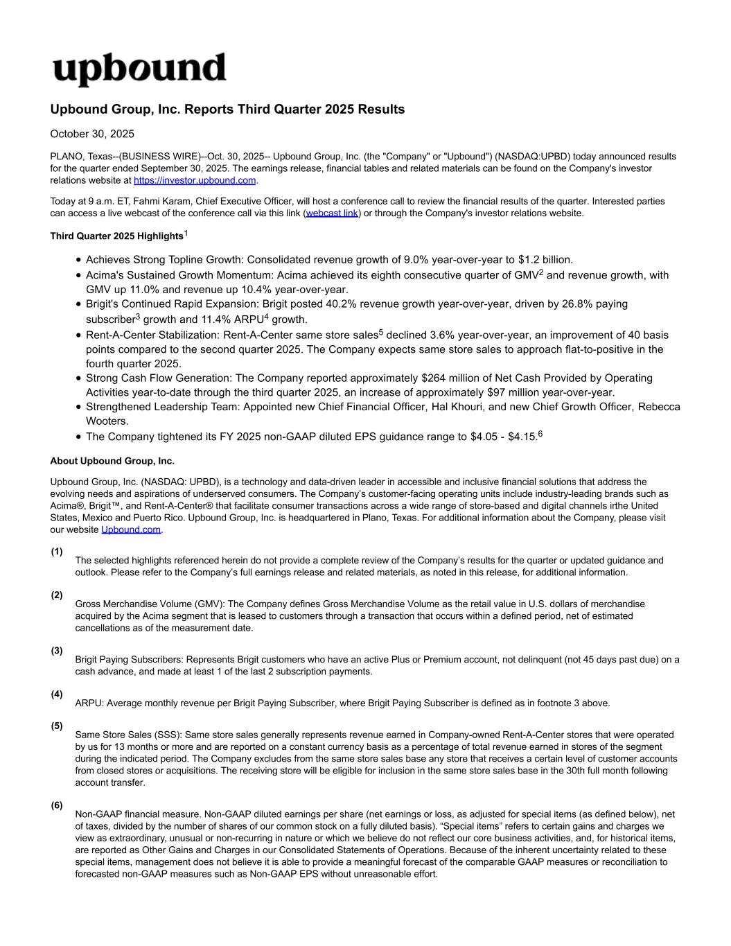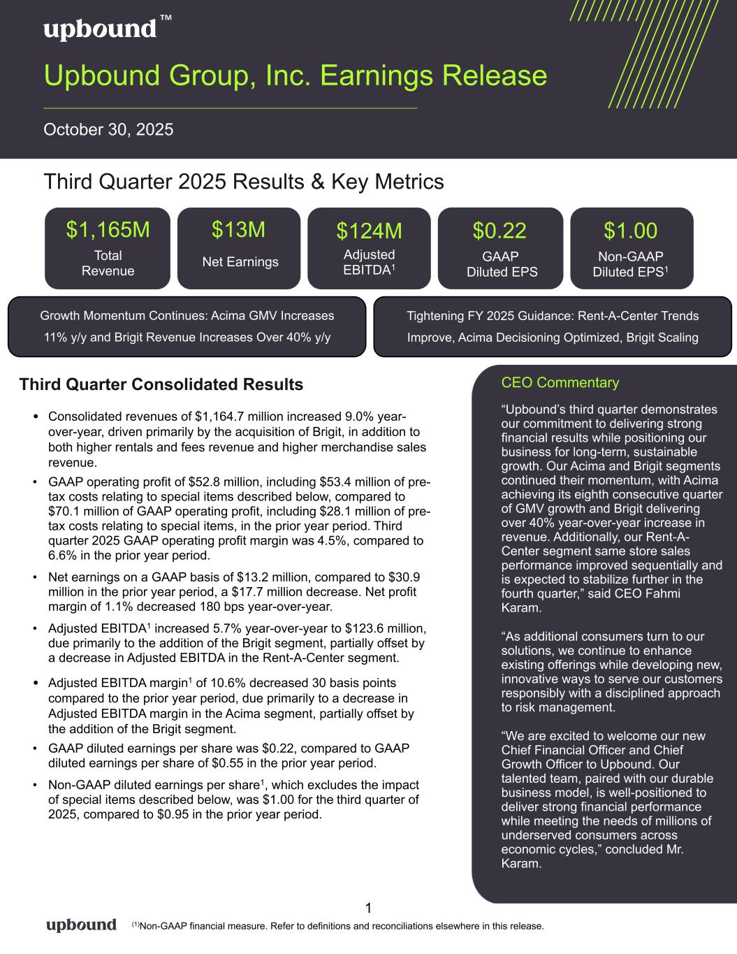 Growth Momentum Continues: Acima GMV Increases 11% y/y and Brigit Revenue Increases Over 40% y/y Tightening FY 2025 Guidance: Rent-A-Center Trends Improve, Acima Decisioning Optimized, Brigit Scaling Total Revenue CEO Commentary “Upbound’s third quarter demonstrates our commitment to delivering strong financial results while positioning our business for long-term, sustainable growth. Our Acima and Brigit segments continued their momentum, with Acima achieving its eighth consecutive quarter of GMV growth and Brigit delivering over 40% year-over-year increase in revenue. Additionally, our Rent-A- Center segment same store sales performance improved sequentially and is expected to stabilize further in the fourth quarter,” said CEO Fahmi Karam. “As additional consumers turn to our solutions, we continue to enhance existing offerings while developing new, innovative ways to serve our customers responsibly with a disciplined approach to risk management. “We are excited to welcome our new Chief Financial Officer and Chief Growth Officer to Upbound. Our talented team, paired with our durable business model, is well-positioned to deliver strong financial performance while meeting the needs of millions of underserved consumers across economic cycles,” concluded Mr. Karam. Upbound Group, Inc. Earnings Release October 30, 2025 Third Quarter 2025 Results & Key Metrics Third Quarter Consolidated Results • Consolidated revenues of $1,164.7 million increased 9.0% year- over-year, driven primarily by the acquisition of Brigit, in addition to both higher rentals and fees revenue and higher merchandise sales revenue. • GAAP operating profit of $52.8 million, including $53.4 million of pre- tax costs relating to special items described below, compared to $70.1 million of GAAP operating profit, including $28.1 million of pre- tax costs relating to special items, in the prior year period. Third quarter 2025 GAAP operating profit margin was 4.5%, compared to 6.6% in the prior year period. • Net earnings on a GAAP basis of $13.2 million, compared to $30.9 million in the prior year period, a $17.7 million decrease. Net profit margin of 1.1% decreased 180 bps year-over-year. • Adjusted EBITDA1 increased 5.7% year-over-year to $123.6 million, due primarily to the addition of the Brigit segment, partially offset by a decrease in Adjusted EBITDA in the Rent-A-Center segment. • Adjusted EBITDA margin1 of 10.6% decreased 30 basis points compared to the prior year period, due primarily to a decrease in Adjusted EBITDA margin in the Acima segment, partially offset by the addition of the Brigit segment. • GAAP diluted earnings per share was $0.22, compared to GAAP diluted earnings per share of $0.55 in the prior year period. • Non-GAAP diluted earnings per share1, which excludes the impact of special items described below, was $1.00 for the third quarter of 2025, compared to $0.95 in the prior year period. 1 (1)Non-GAAP financial measure. Refer to definitions and reconciliations elsewhere in this release. $1,165M Total Revenue GAAP Diluted EPS $0.22 Non-GAAP Diluted EPS1 Net Earnings $13M Adjusted EBITDA1 $1.00$124M