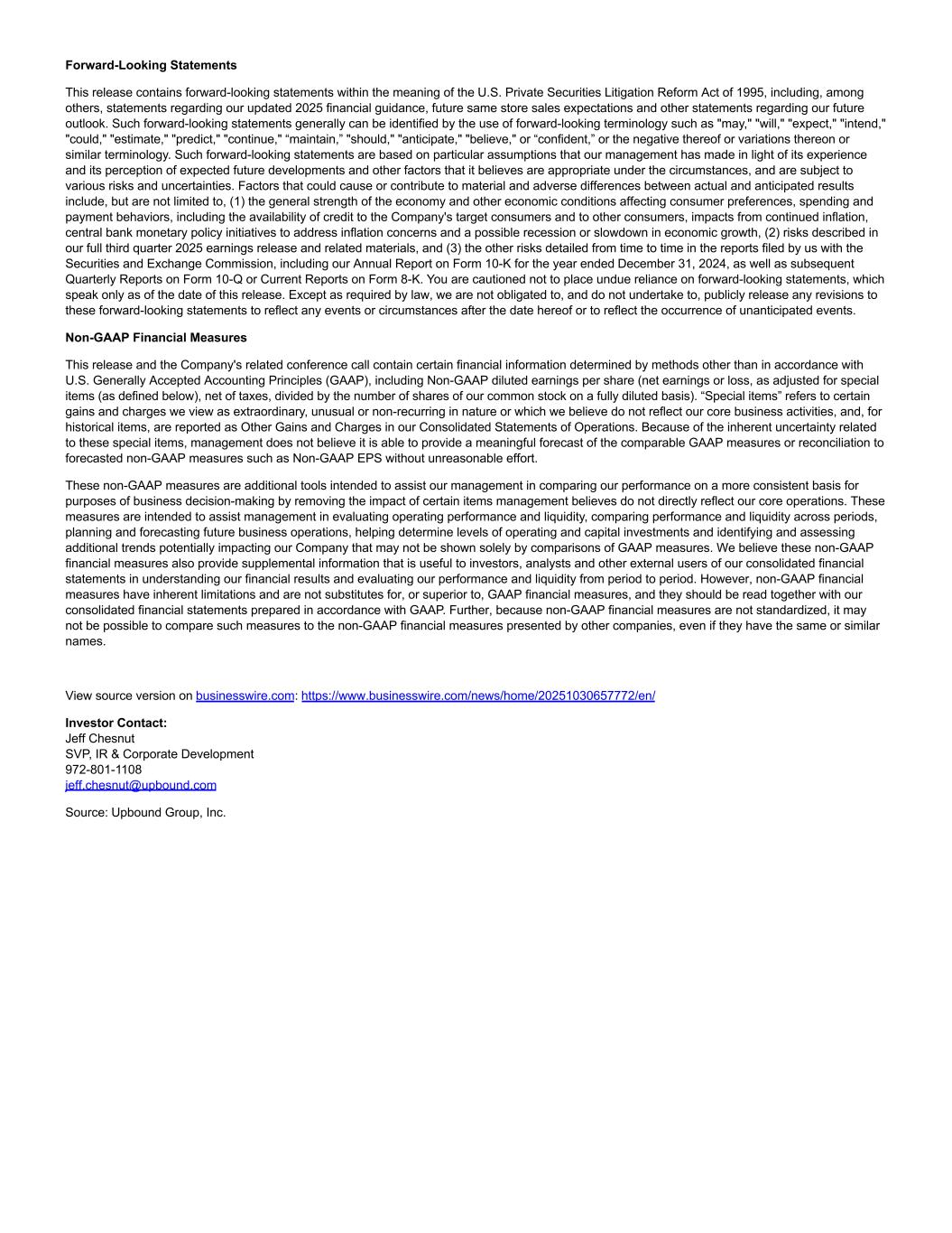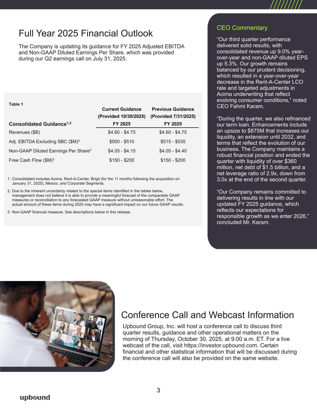 Full Year 2025 Financial Outlook The Company is updating its guidance for FY 2025 Adjusted EBITDA and Non-GAAP Diluted Earnings Per Share, which was provided during our Q2 earnings call on July 31, 2025. Conference Call and Webcast Information Upbound Group, Inc. will host a conference call to discuss third quarter results, guidance and other operational matters on the morning of Thursday, October 30, 2025, at 9:00 a.m. ET. For a live webcast of the call, visit https://investor.upbound.com. Certain financial and other statistical information that will be discussed during the conference call will also be provided on the same website. 1. Consolidated includes Acima, Rent-A-Center, Brigit (for the 11 months following the acquisition on January 31, 2025), Mexico, and Corporate Segments. 2. Due to the inherent uncertainty related to the special items identified in the tables below, management does not believe it is able to provide a meaningful forecast of the comparable GAAP measures or reconciliation to any forecasted GAAP measure without unreasonable effort. The actual amount of these items during 2025 may have a significant impact on our future GAAP results. 3. Non-GAAP financial measure. See descriptions below in this release. CEO Commentary “Our third quarter performance delivered solid results, with consolidated revenue up 9.0% year- over-year and non-GAAP diluted EPS up 5.3%. Our growth remains balanced by our prudent decisioning, which resulted in a year-over-year decrease in the Rent-A-Center LCO rate and targeted adjustments in Acima underwriting that reflect evolving consumer conditions,” noted CEO Fahmi Karam. “During the quarter, we also refinanced our term loan. Enhancements include an upsize to $875M that increases our liquidity, an extension until 2032, and terms that reflect the evolution of our business. The Company maintains a robust financial position and ended the quarter with liquidity of over $360 million, net debt of $1.5 billion, and a net leverage ratio of 2.9x, down from 3.0x at the end of the second quarter. “Our Company remains committed to delivering results in line with our updated FY 2025 guidance, which reflects our expectations for responsible growth as we enter 2026,” concluded Mr. Karam. 3 Table 1 Current Guidance Previous Guidance (Provided 10/30/2025) (Provided 7/31/2025) Consolidated Guidance1,2 FY 2025 FY 2025 Revenues ($B) $4.60 - $4.75 $4.60 - $4.75 Adj. EBITDA Excluding SBC ($M)3 $500 - $510 $515 - $535 Non-GAAP Diluted Earnings Per Share3 $4.05 - $4.15 $4.05 - $4.40 Free Cash Flow ($M)3 $150 - $200 $150 - $200